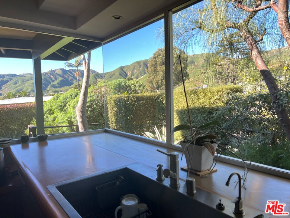 Enjoy sunsets over the Pacific from this quiet and private mid century home with newly refinished solar heated pool. Built around a courtyard, this stylish original houses 2 beds and 2 baths, laundry room and den area with a large studio and workshop. The 1960's bar and fireplace provides ambiance for entertaining with the bonus of views over the coastline, sunset and mountains from the house and a second private patio. Walk to the beach over a pedestrian bridge from this area adjacent to Getty Villa and Los Liones State Park hiking trails. Available now - partially furnished or unfurnished.