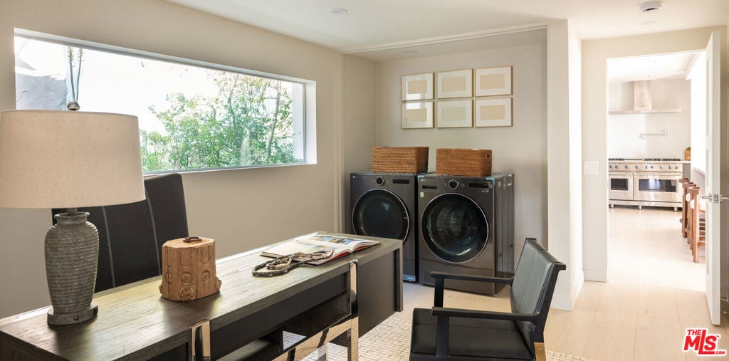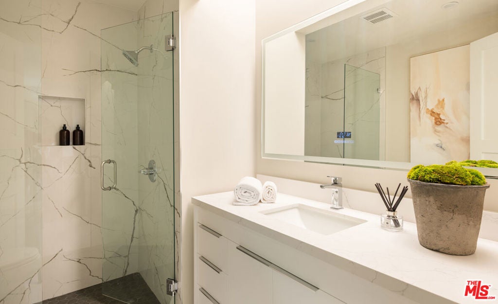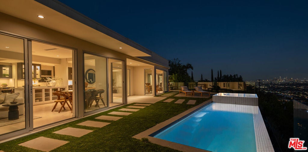 Minutes above the Sunset Strip on a coveted cul-de-sac, this newly reimagined mid-century residence commands uninterrupted sightlines that sweep from the Downtown skyline across Century City and onward to the Pacific. Conceived as a seamless single-level experience, the home unfolds with an effortless flow, where walls of floor-to-ceiling glass frame the horizon while opening directly to a flat grassy yard, infinity-edge pool, and spa set against panoramic LA views.An impactful entry introduces light-filled interiors where living, dining, and kitchen spaces align naturally for both everyday living and entertaining, with wide-plank oak floors throughout the open environment. The chef's kitchen is equipped with Viking appliances, custom cabinetry, and a tailored eat-in breakfast bar, maintaining a constant visual connection to the outdoors.The primary suite functions as a true retreat, anchored by a fireplace and private sitting lounge, positioned to capture sweeping views over Century City. Floor-to-ceiling glass doors open to a wraparound terrace, extending the bedroom into the landscape and offering a front-row vantage point to sunrise and sunset. The ensuite bath is thoughtfully composed with an oversized shower and a generous walk-in closet, while two additional bedroom suites provide ample space for guests, and a flexible bonus room adapts easily as a home office, gym, or studio.Expansive patios surround the home, offering multiple settings for dining, lounging, and entertaining as the city transitions from day to night. A two-car garage with additional driveway parking ensures convenience. More than a residence, this is a jetliner view property and an architectural statement in the Hollywood Hills where scale, light, and horizon converge in one of Los Angeles' most iconic settings.