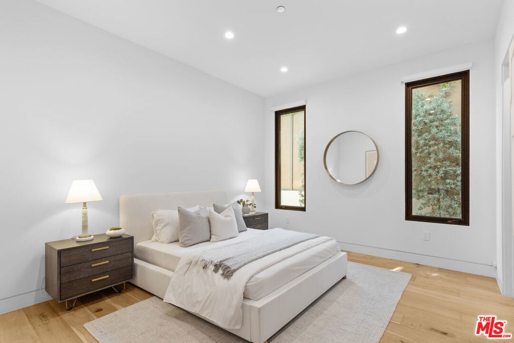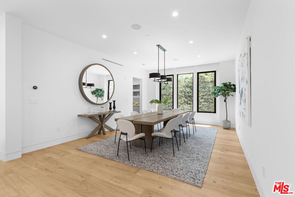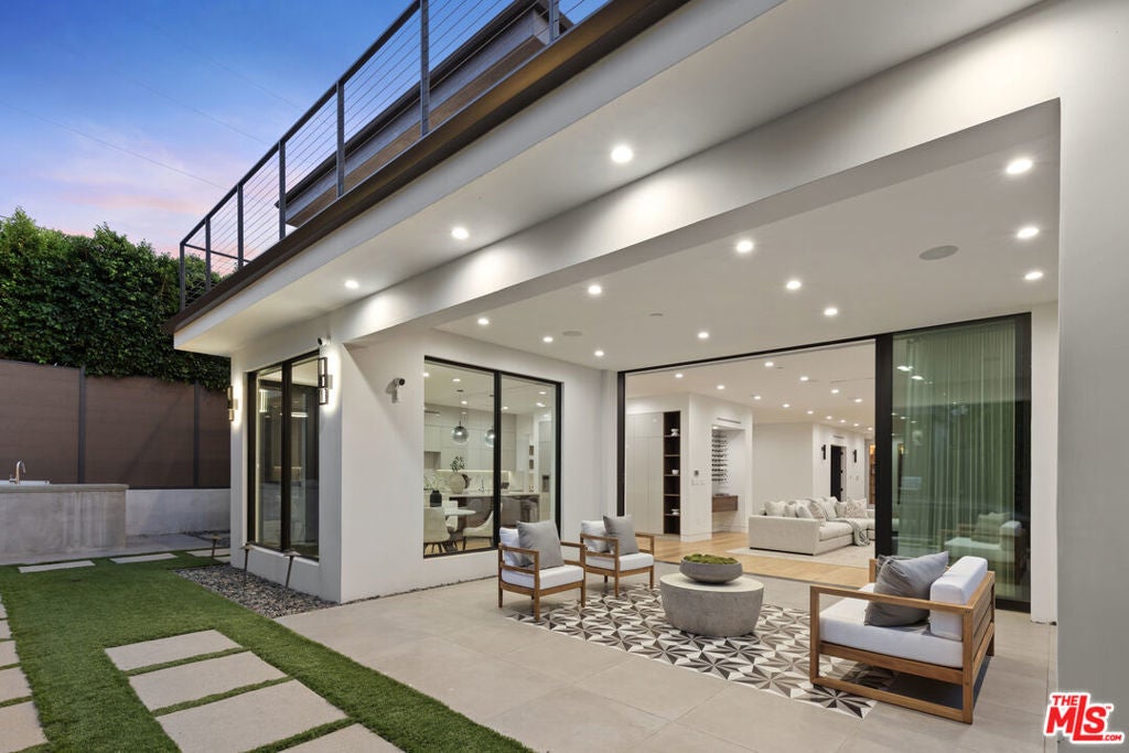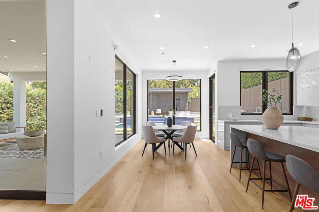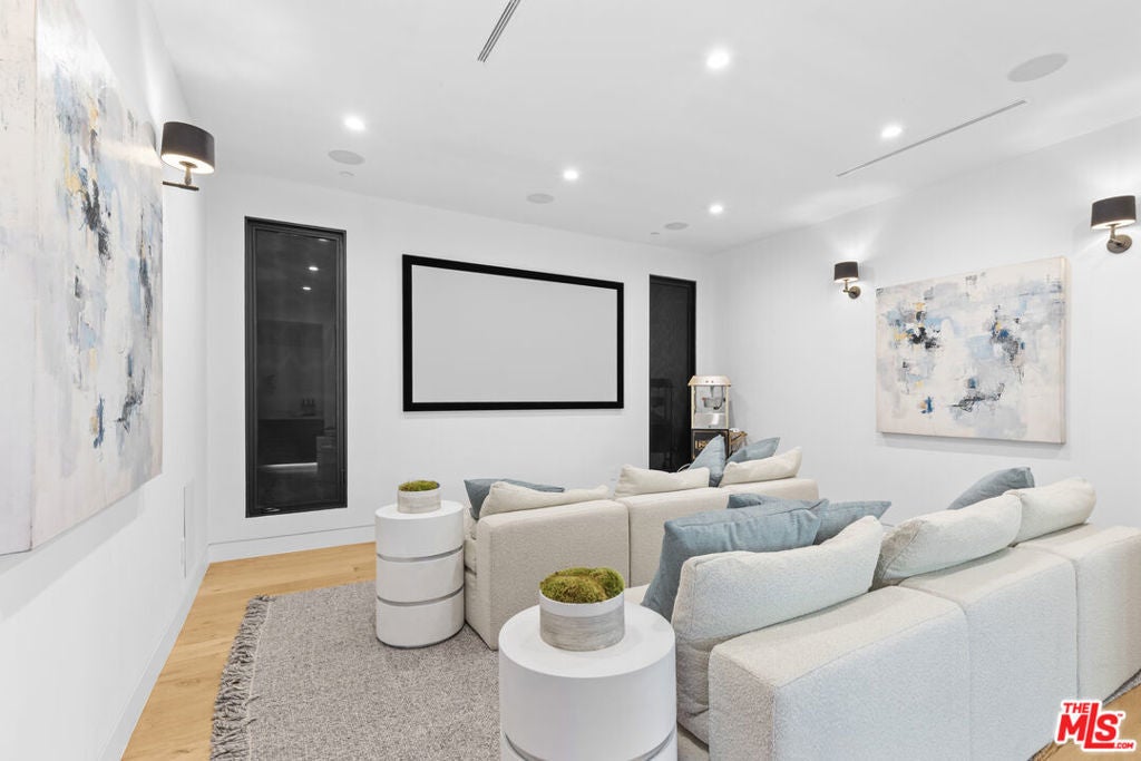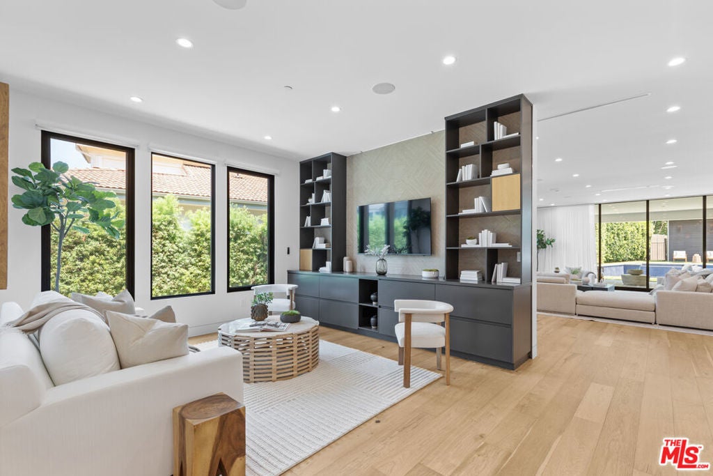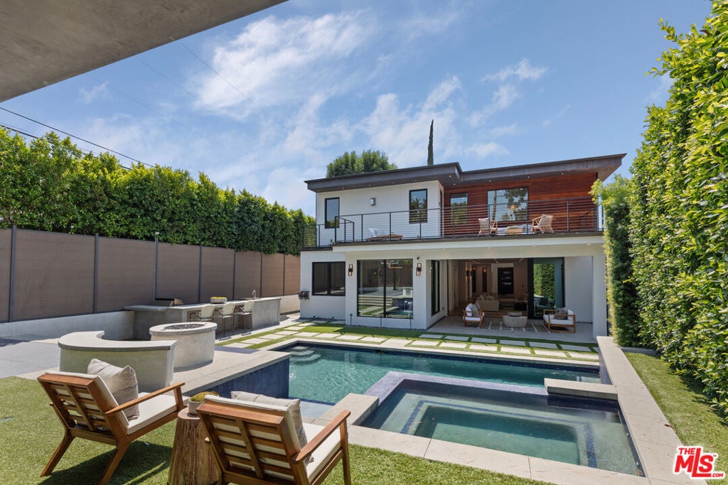 Ideally situated just off Ventura Boulevard, this striking modern residence blends transitional architecture with a flawless fusion of smooth stucco, rich exotic wood, and expansive glass walls all privately nestled behind lush hedges in a tranquil South of the Boulevard enclave. Step into a dramatic entryway with soaring ceilings, setting the tone for the thoughtfully curated interiors where open-concept living flows seamlessly into the outdoors. Beyond the foyer, a sophisticated formal living room with custom built-ins leads to a state-of-the-art home theater perfect for movie nights or game day gatherings. On the main level, a private guest or maid's suite with an en-suite bath adds flexibility, alongside a stylish powder room for visitors. The elegant formal dining room connects effortlessly to a warm and inviting family room, complete with designer built-ins, a 100-bottle wine bar, a contemporary wood-clad fireplace, and expansive glass pocket doors that disappear to reveal the breathtaking backyard oasis. The chef's kitchen is a showstopper, outfitted with a waterfall island, sleek lacquer cabinetry, premium built-in Miele appliances, a sunny breakfast nook overlooking the grounds, and a walk-in pantry. A butler's pantry provides convenient access to the dining room ideal for entertaining with ease. Upstairs, a versatile teen lounge or executive office opens to an extraordinary wraparound terrace with panoramic views of the Santa Susana Mountains. Four luxurious bedroom suites await, including a spectacular primary retreat featuring a fireplace, built-in bar and fridge, private lounge, oversized walk-in closet with island, and a spa inspired bathroom with dual vanities, lighted mirror, soaking tub, and oversized shower. A private balcony overlooks the backyard the perfect spot to greet the morning or unwind at sunset. Designed for entertaining and everyday luxury, the backyard features a covered outdoor living area, sparkling pool and spa, glass-encased fire pit, and a sleek outdoor kitchen with built-in BBQ. A custom sports court invites friendly competition, while a newly updated ADU with a private entrance and en-suite bath provides ideal accommodations for guests, extended family, or use as an office, studio or even a gym. Smart home features include integrated sound, multi-zone Nest climate control, security cameras, electric blinds and curtains throughout the entire house and full home automation. Additional highlights include a large motor court with ample parking and a low-maintenance turf area perfect for soccer, mini golf, or outdoor relaxation. Don't miss the opportunity to experience the exceptional lifestyle offered at 4854 Alonzo Avenue where modern design, comfort, and convenience converge in one unforgettable home.