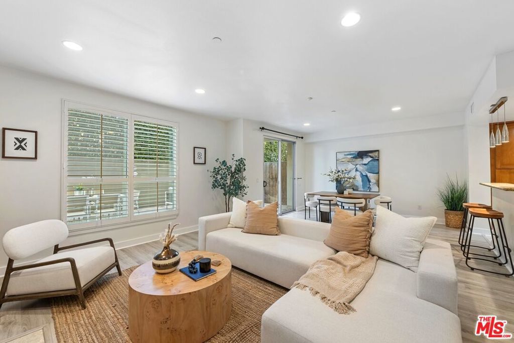 Sophisticated and spacious, this rear-corner, single-level condo feels like a home and features 2 bedrooms, 2.5 baths, and a den/office, highlighted by a rare, oversized private rear patio. Designed for both comfort and elegance, the open floor plan showcases high ceilings, recessed lighting, plantation shutters, and beautiful flooring throughout. The living and dining areas flow seamlessly to the expansive patio and are enhanced by custom built-ins and a cozy fireplace, creating an inviting indoor-outdoor setting ideal for entertaining or relaxing. The gourmet kitchen features granite countertops, a breakfast bar, and stainless-steel appliances. The spacious primary suite also opens to the patio and includes a custom walk-in closet and a luxurious bathroom with dual vanities, a soaking tub, and a separate shower. The generously sized second bedroom offers its own en-suite bathroom. Additional highlights include a built-in desk, powder room, in-unit washer and dryer, and central air and heat for optimal comfort. The contemporary 2003 building offers two separate parking spaces, extra storage, and guest parking. Ideally located near Century City, Westfield Century City's premier outdoor shopping and dining, Rancho Park Golf Course, Cheviot Hills Recreation Center, Beverly Hills, and UCLA.
