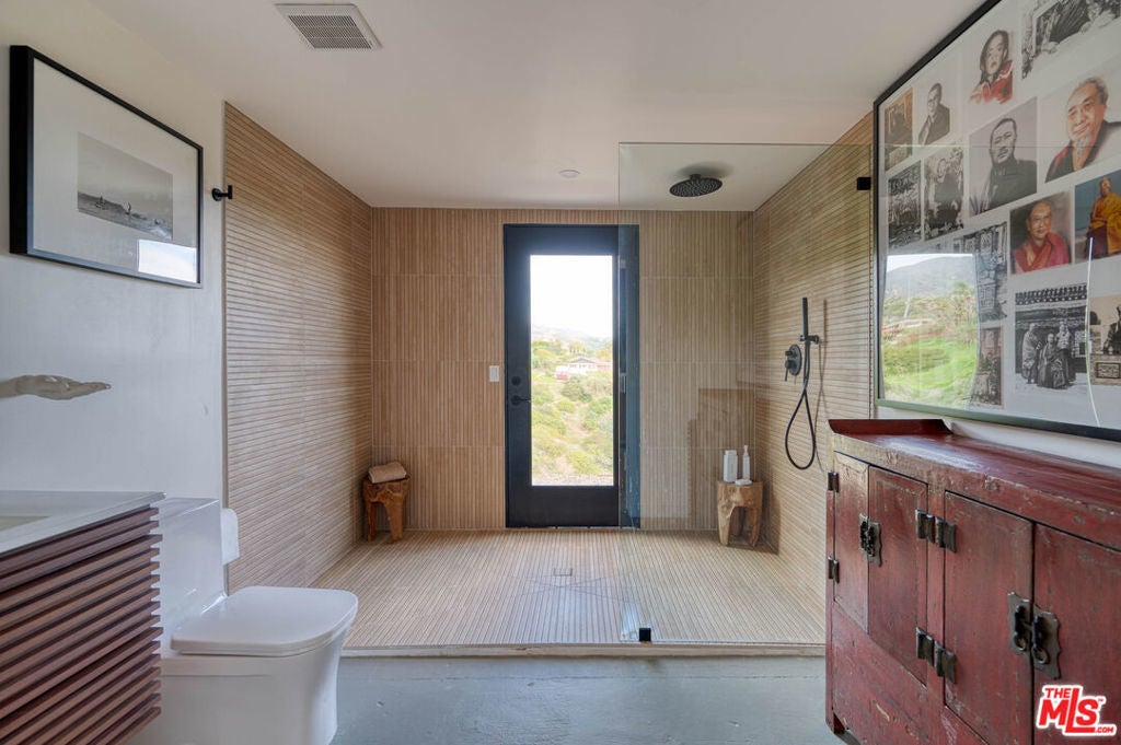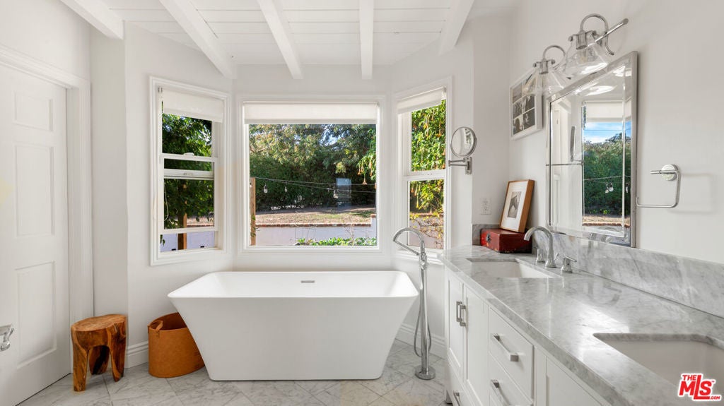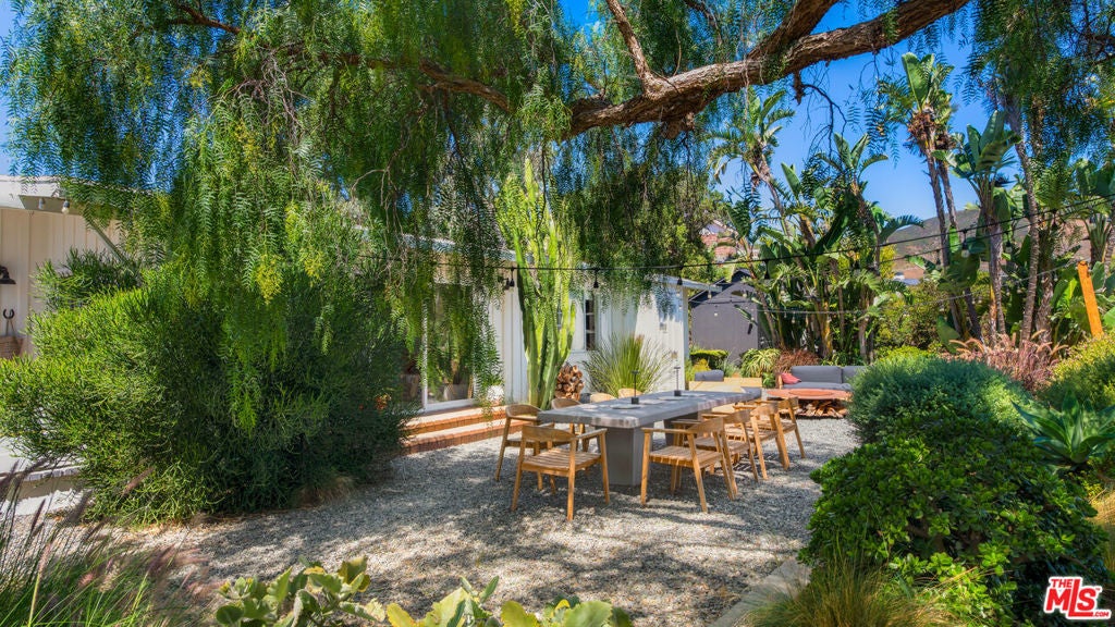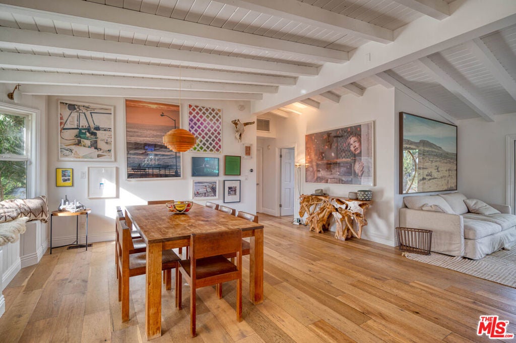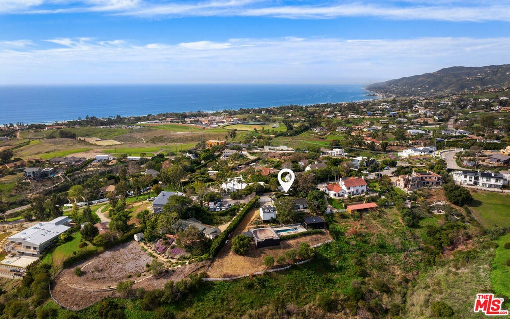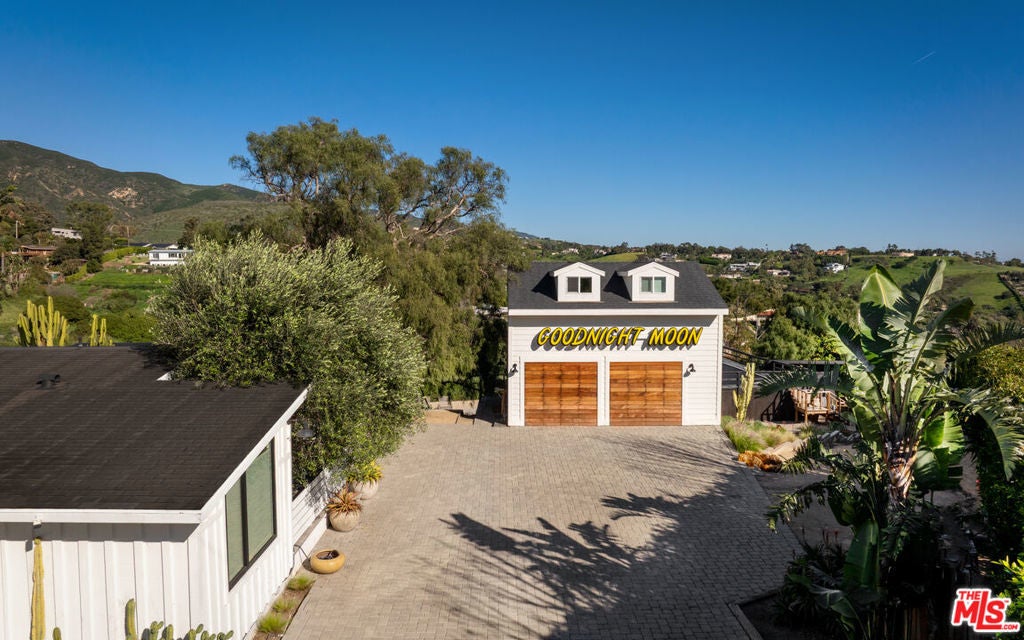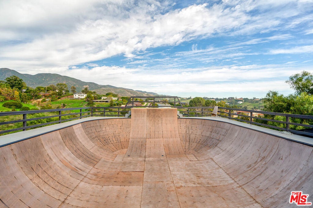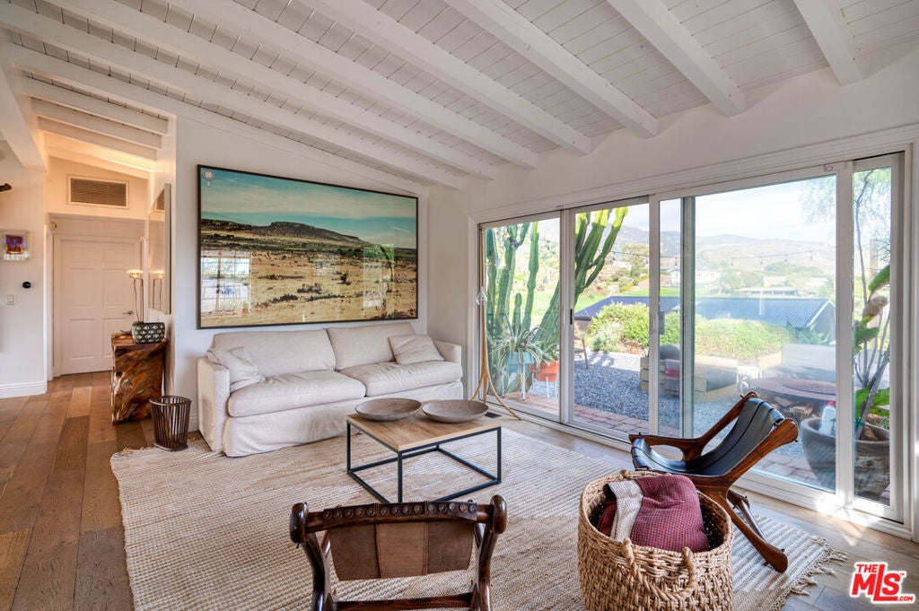 With loads of privacy, sweeping canyon and mountain views, and ample room for indoor/outdoor living and entertaining, this Malibu Park compound combines the bright, open feeling of mid-century style with a casual surf-ranch atmosphere. Located above Zuma on a gated, approximately 1.46-acre cul-de-sac lot, the property has a main house, a detached guest house, a pool house, a separate gym, a pool and spa. The single-level main house has a spacious living-dining-kitchen great room with high, beamed ceilings, wood-plank floors, a window seat, and sliding glass doors on two sides opening to gardens and patios. The kitchen has butcher-block countertops and quality appliances. Just outside is a covered patio for al fresco dining and barbecues, and a comfortable seating area around a fire pit. There's a well-established raised-bed vegetable garden, lovely flowering trees, a hammock, and string lights. The main house has three bedrooms, including a primary suite with built-ins, a walk-in closet, doors to the patio and the side yards, plus a bath with a soaking tub and large garden windows. Upstairs is a large bedroom with vaulted ceilings, a built-in desk and cupboards along two sides, a sitting area, and double-paned windows with mountain and ocean views. Near the pool house is a long swimming pool and spa with a wide sundeck for relaxing and entertaining. At the opposite end of the pool is a permitted skating bowl with sensational ocean and mountain views. Finally, there is the gym. The property is landscaped and irrigated and has on-demand hot water, a Tesla charger, new HVAC system, Fleetwood windows, security system, and generous on-site parking, and is approximately one mile from both Zuma beach and Malibu schools. Includes plans and approvals for a remodel and 900sf extension.