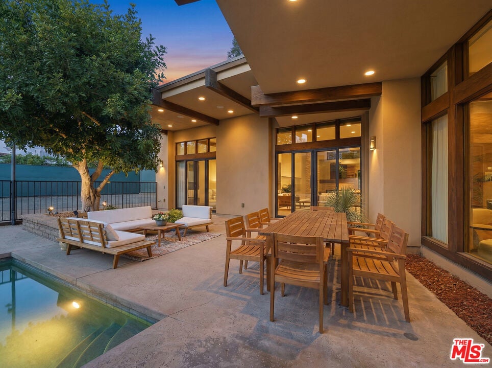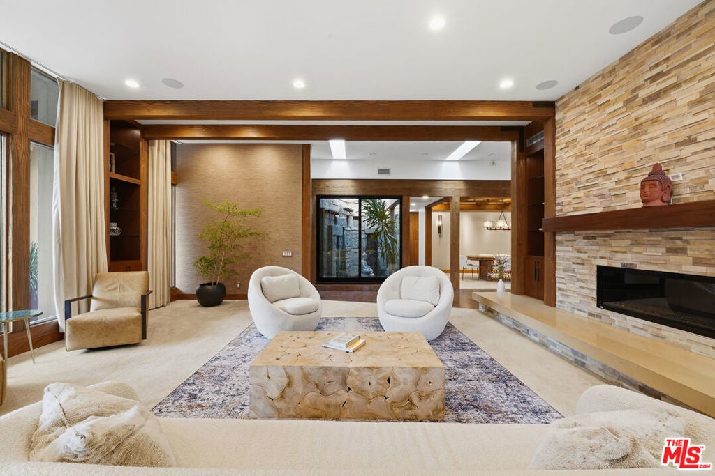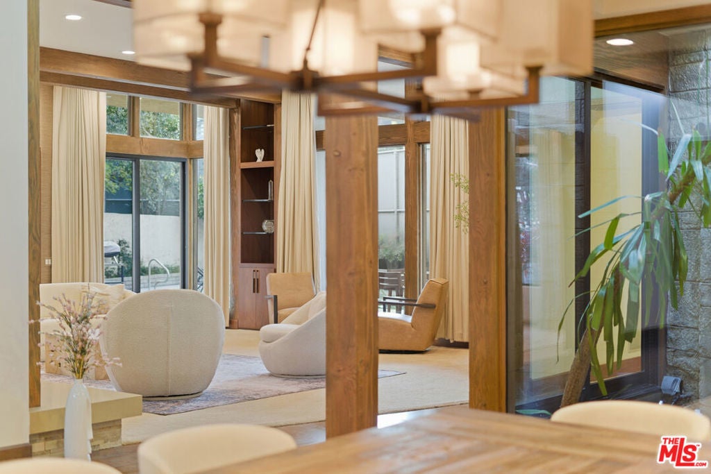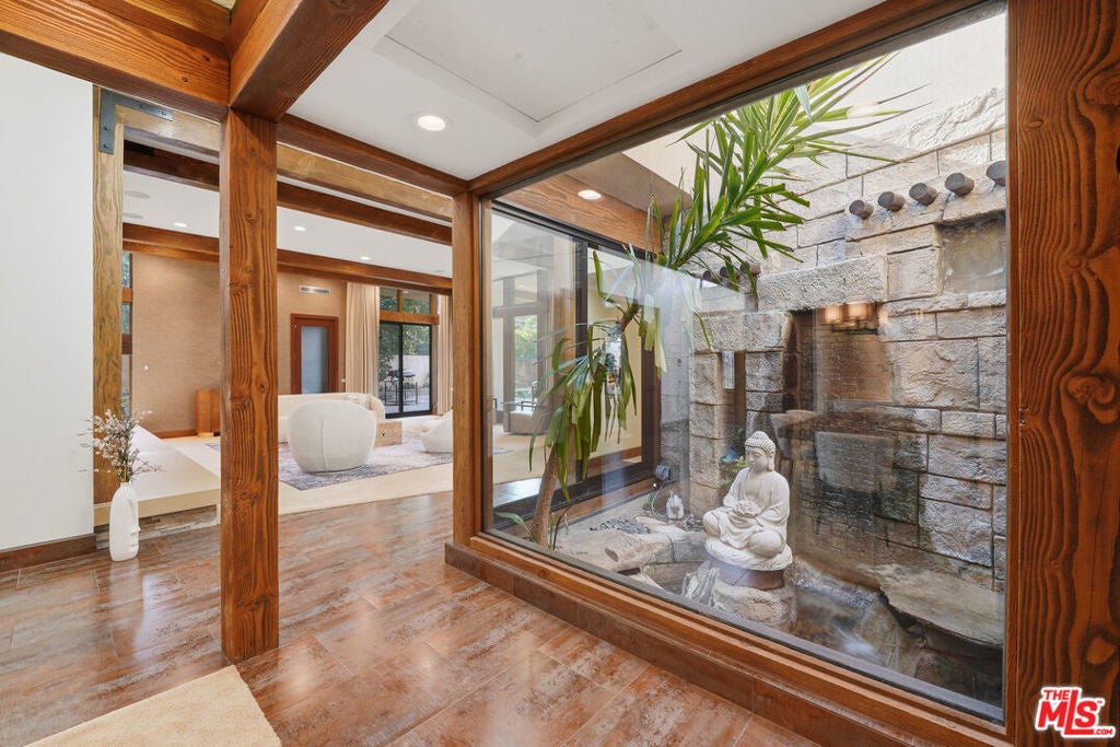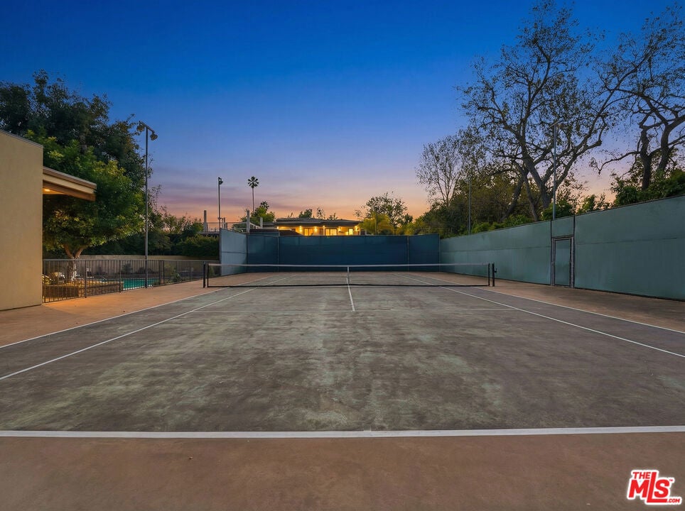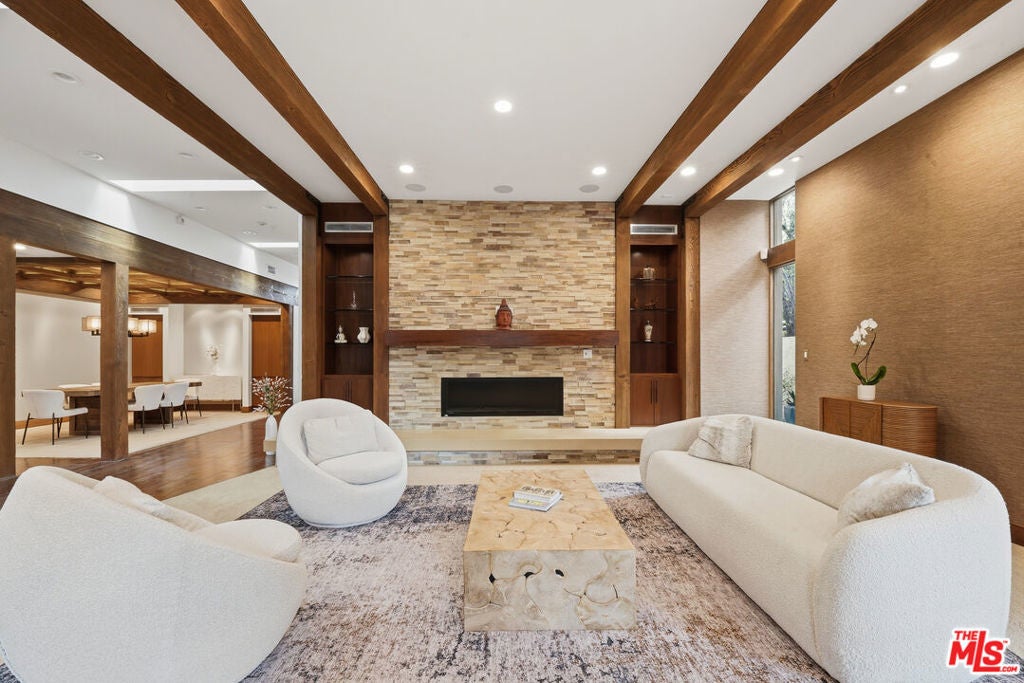 Welcome to a rare architectural masterpiece in the heart of prestigious Amestoy Estates. Rebuilt in 2014, this single-story mid-century modern estate blends timeless design with today's most refined luxury, offering an unparalleled living experience on a private cul-de-sac. Spanning approximately 3,835 square feet, this four-bedroom, three-and-a-half-bath residence is a true showpiece of craftsmanship and intention. Exposed wood beams, clerestory windows, skylights, coffered ceilings, and exquisite inlaid wood details create a warm yet sophisticated atmosphere, while stacked stone facades and designer lighting elevate every space. At the heart of the home, the great room flows effortlessly into a stunning open-air atrium with cascading waterfalls and lush greenery. A serene, resort-style focal point that blurs the line between indoor and outdoor living. Custom built-in cabinetry, stone slab countertops, and heated floors reflect a level of quality rarely found. The gourmet kitchen is a chef's dream, featuring premium Thermador appliances, a dual-oven gas range with custom hood, two wall ovens, built-in refrigerator and dishwasher, walk-in pantry, and elegant finishes ideal for both entertaining and everyday living. A sophisticated wine bar completes the experience. The primary suite is a private sanctuary with its own fireplace, spa-inspired bath with jetted soaking tub and steam shower, and luxurious finishes throughout. Three additional bedrooms offer walk-in closets with cedar paneling and automated lighting, providing both beauty and function. Modern comforts include solar panels, a whole-house water filtration system, dual tankless water heaters, dual HVAC systems, a dedicated utility room, and a three-car garage with epoxy flooring and custom storage cabinetry. Step outside to your private resort-style backyard, where you will find a full tennis court alongside a sparkling pool perfect for both active living and elegant entertaining. This is not simply a home, it is a statement of lifestyle, design, and distinction. A one-of-a-kind opportunity in one of Encino's most coveted neighborhoods.