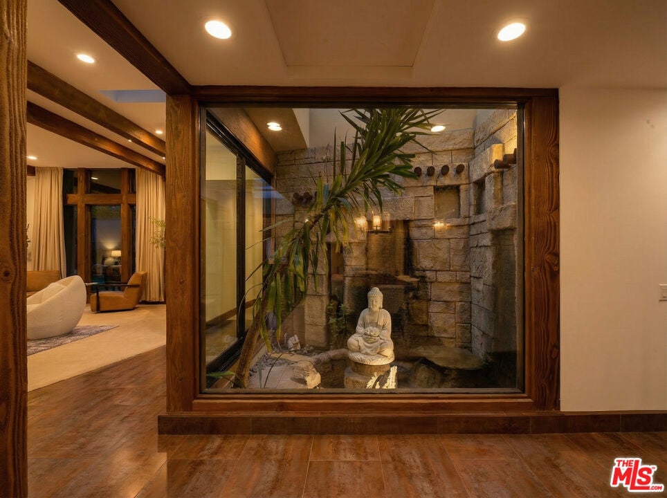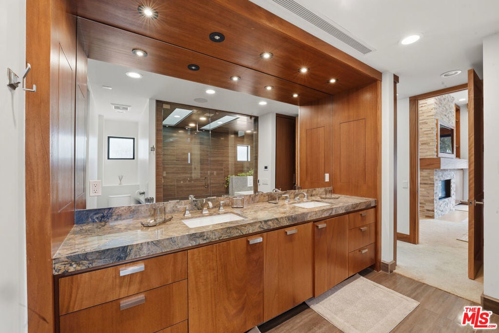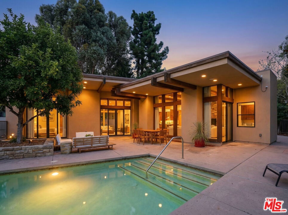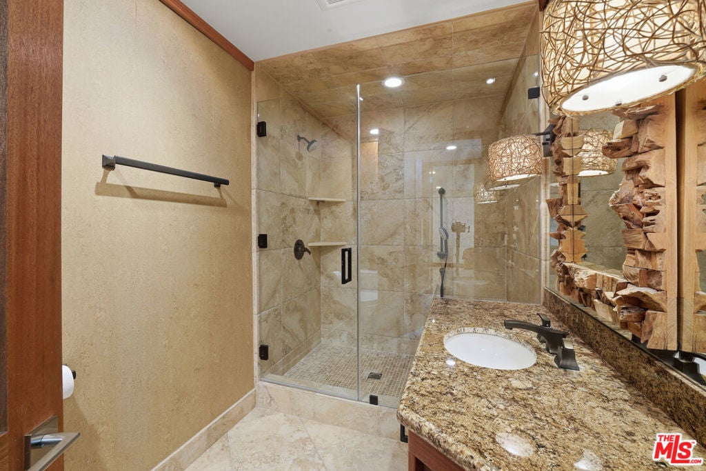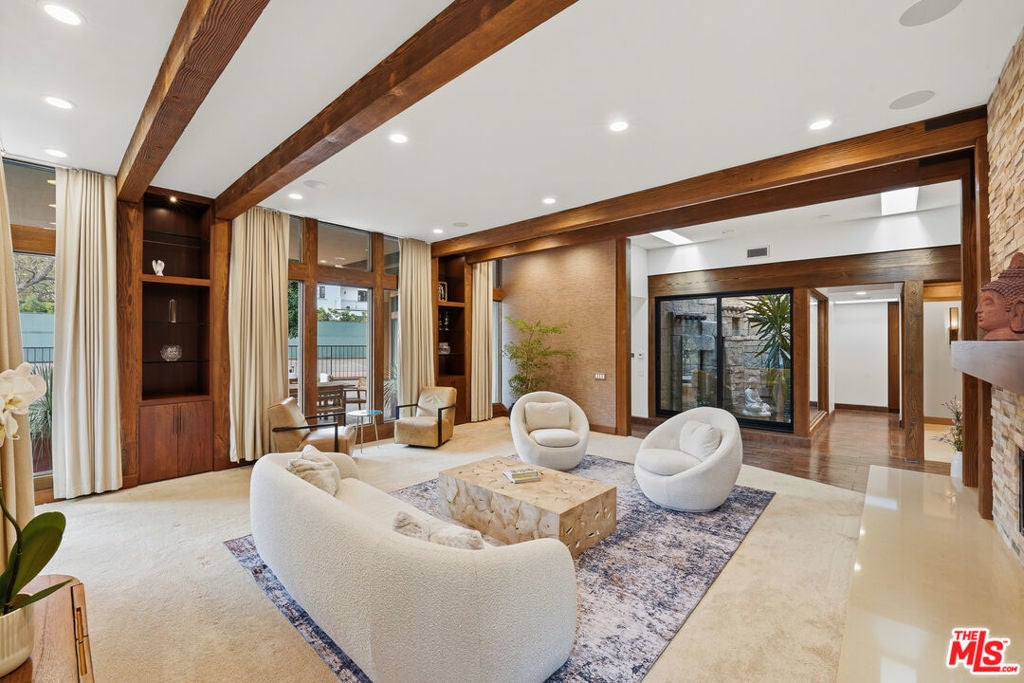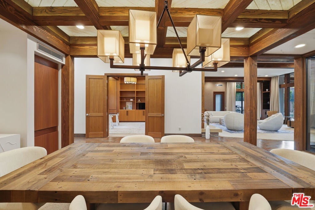 Welcome to a rare architectural masterpiece in the heart of prestigious Amestoy Estates. Rebuilt in 2014, this single-story mid-century modern estate blends timeless design with today's most refined luxury, offering an unparalleled living experience on a private cul-de-sac. Spanning approximately 3,835 square feet, this four-bedroom, three-and-a-half-bath residence is a true showpiece of craftsmanship and intention. Exposed wood beams, clerestory windows, skylights, coffered ceilings, and exquisite inlaid wood details create a warm yet sophisticated atmosphere, while stacked stone facades and designer lighting elevate every space. At the heart of the home, the great room flows effortlessly into a stunning open-air atrium with cascading waterfalls and lush greenery. A serene, resort-style focal point that blurs the line between indoor and outdoor living. Custom built-in cabinetry, stone slab countertops, and heated floors reflect a level of quality rarely found. The gourmet kitchen is a chef's dream, featuring premium Thermador appliances, a dual-oven gas range with custom hood, two wall ovens, built-in refrigerator and dishwasher, walk-in pantry, and elegant finishes ideal for both entertaining and everyday living. A sophisticated wine bar completes the experience. The primary suite is a private sanctuary with its own fireplace, spa-inspired bath with jetted soaking tub and steam shower, and luxurious finishes throughout. Three additional bedrooms offer walk-in closets with cedar paneling and automated lighting, providing both beauty and function. Modern comforts include solar panels, a whole-house water filtration system, dual tankless water heaters, dual HVAC systems, a dedicated utility room, and a three-car garage with epoxy flooring and custom storage cabinetry. Step outside to your private resort-style backyard, where you will find a full tennis court alongside a sparkling pool perfect for both active living and elegant entertaining. This is not simply a home, it is a statement of lifestyle, design, and distinction. A one-of-a-kind opportunity in one of Encino's most coveted neighborhoods.