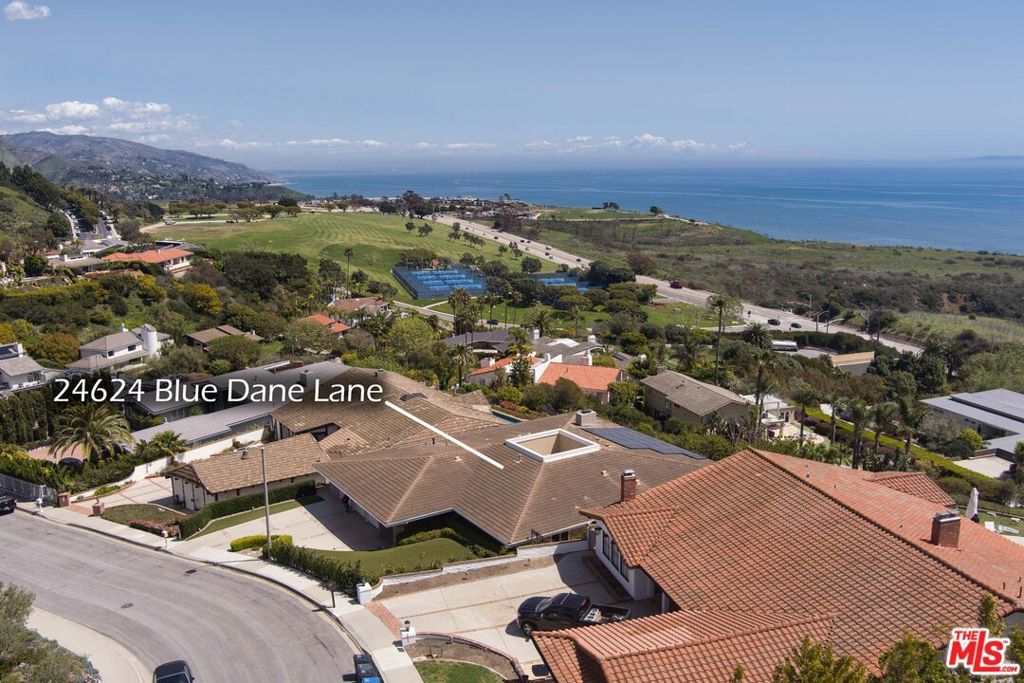 The crown jewel of Malibu Country Estates - one of Malibu's most desired enclaves! 24624 Blue Dane sits on more than a half acre and is situated on one of the best streets in the neighborhood with almost 360 degree views of the azure blue Pacific, Catalina, Palos Verdes, Santa Monica Bay, the queen's necklace and the majestic Santa Monica Mountains. Only a few fortunate homes in Malibu can boast of such unobstructed jetliner views! The home's Mediterranean flair & decor is reminiscent of the south of France and Italy. Interiors are subtle yet rich and the floor plan is inviting and comfortable - flowing yet elegant. Accents of burnished gold and pastels, hard wood, marble floors and tiled baths and kitchen come together harmoniously. A step down living room is accented with a rare, functioning double sided fireplace for intimacy, warmth & one of the best ocean views in Malibu. There is a sundrenched outdoor ocean view courtyard that centers the home nicely. A three car garage and ample driveway parking makes for easy guest accommodations. Centrally located close to downtown Malibu, beaches, and Pepperdine, this idyllic retreat is situated in one of Malibu's few planned communities with underground utilities and sewer.