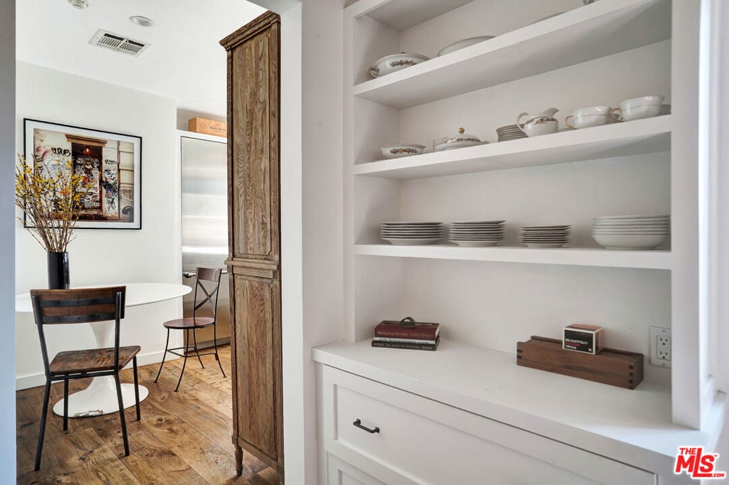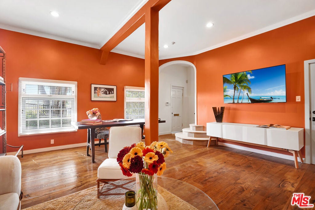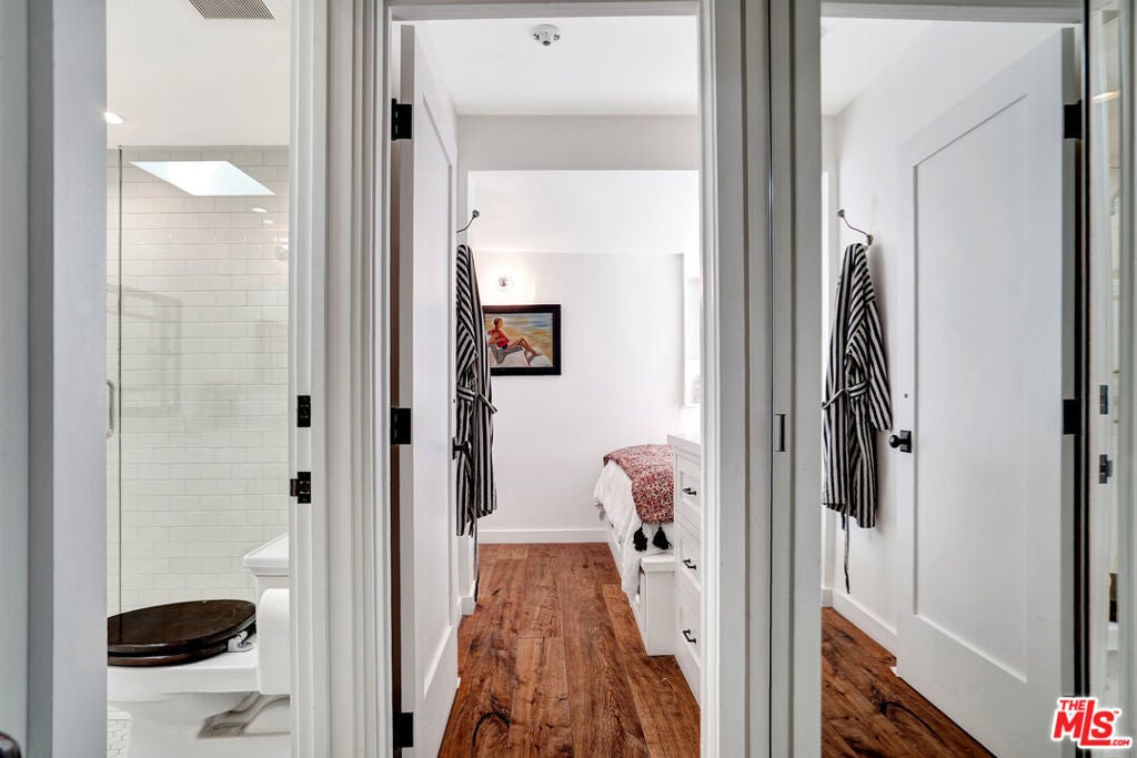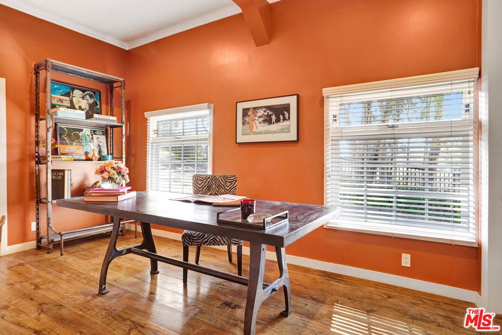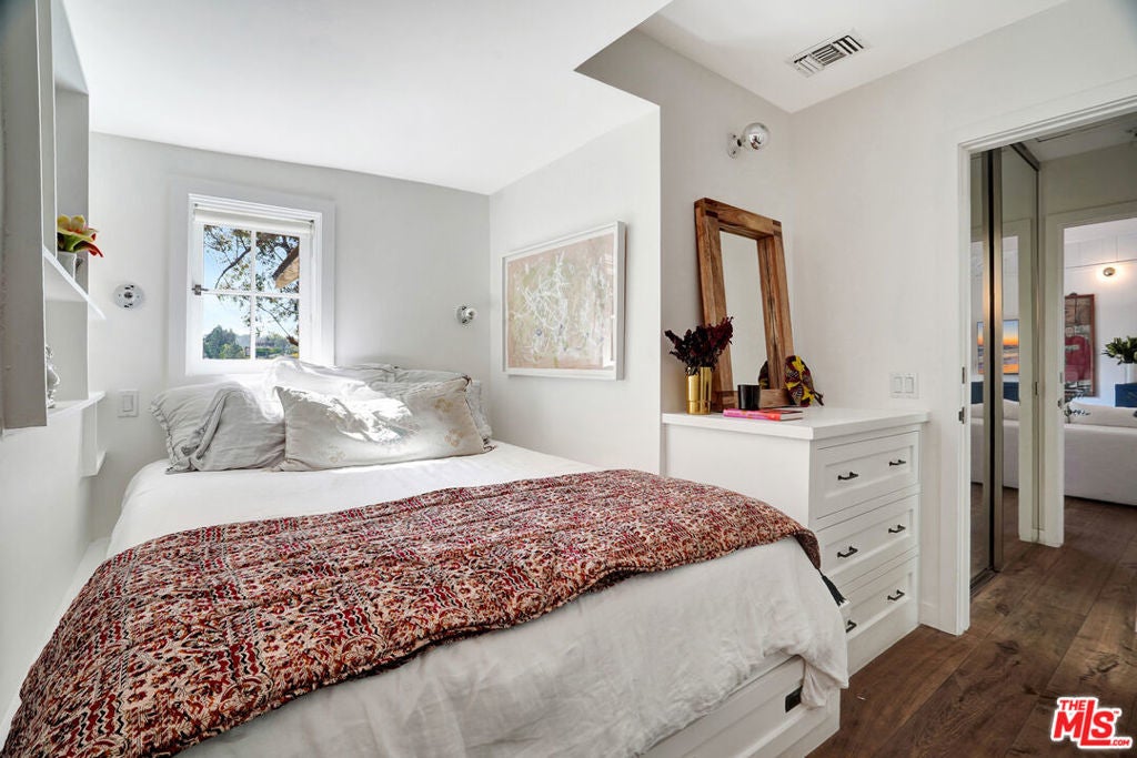 Set against sweeping canyon vistas moments from Lake Hollywood, this striking two-story guest residence offers a rare blend of architectural character and serene privacy. Dramatic exposed wood beams and soaring ceilings define the expansive living spaces, where walls of light frame picturesque hillside views. The thoughtfully curated layout features two bedrooms and one bath, complemented by an open living area that captures both warmth and scale. Natural textures, elevated ceilings, and tranquil sightlines create an atmosphere that feels both sophisticated and intimate. Privately positioned in one of Los Angeles' most coveted hillside enclaves, this residence offers a refined escape just minutes from studios, trails, and the energy of Hollywood yet worlds away in ambiance.