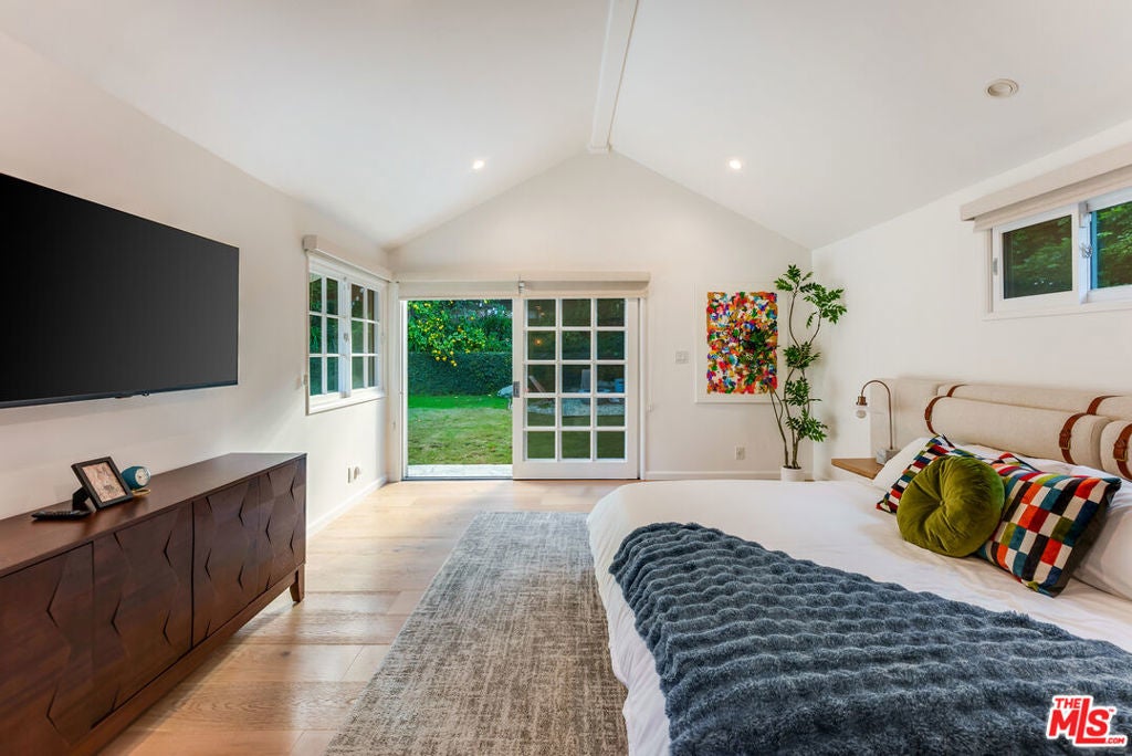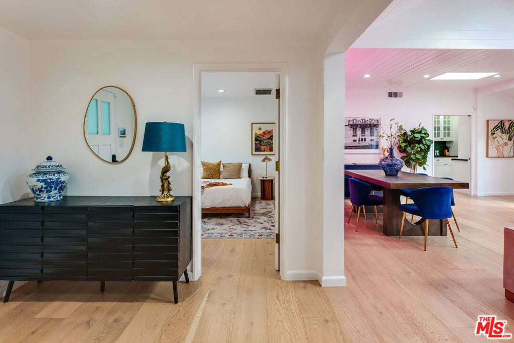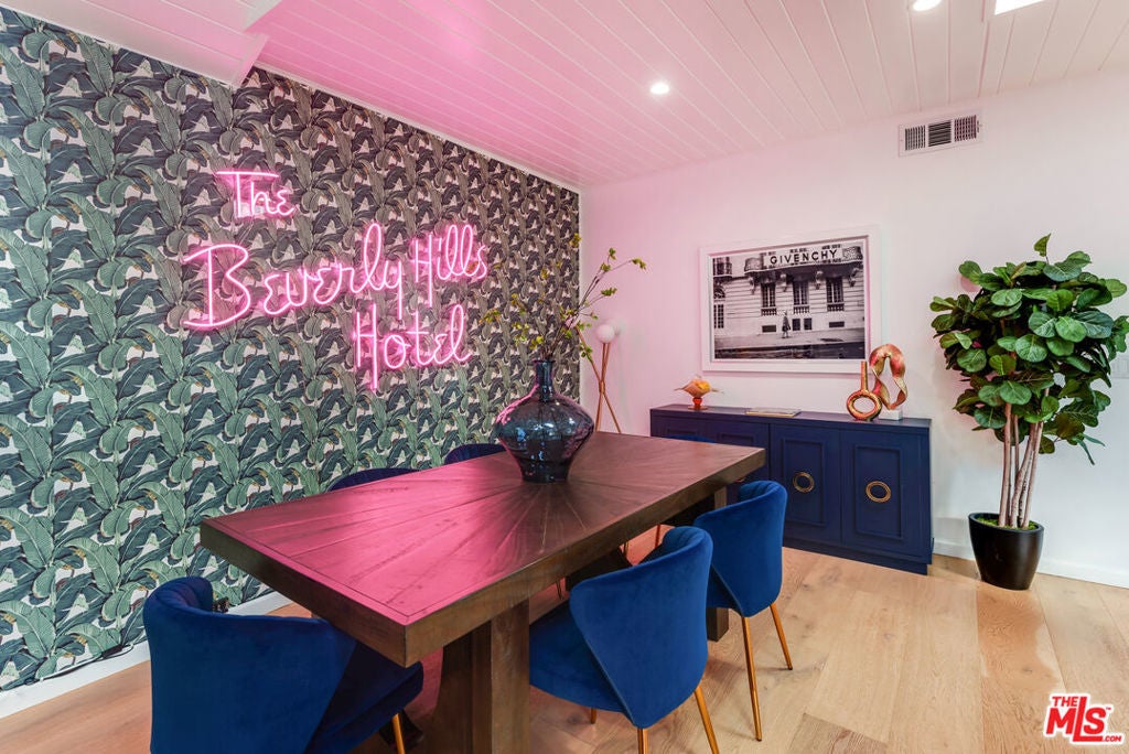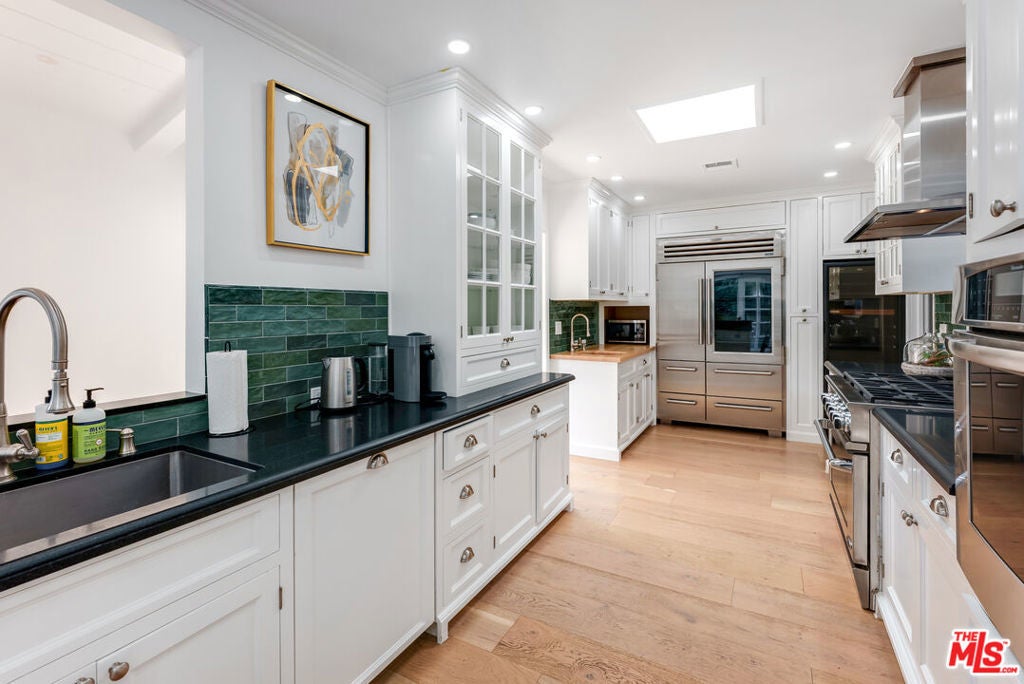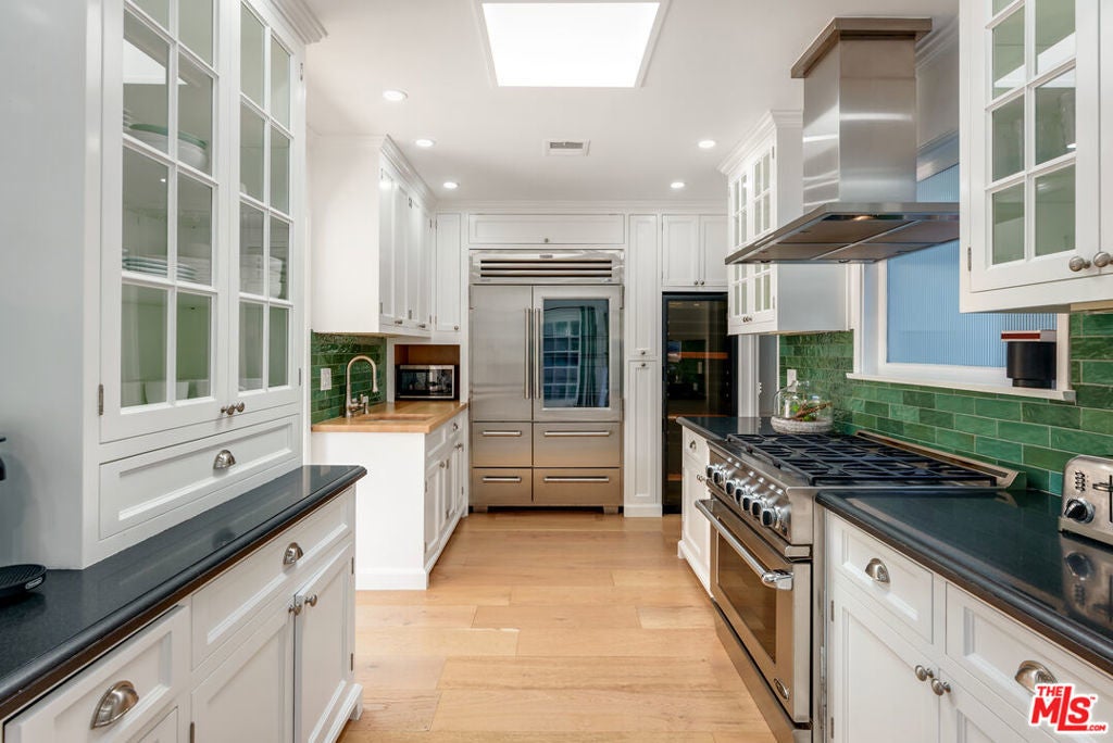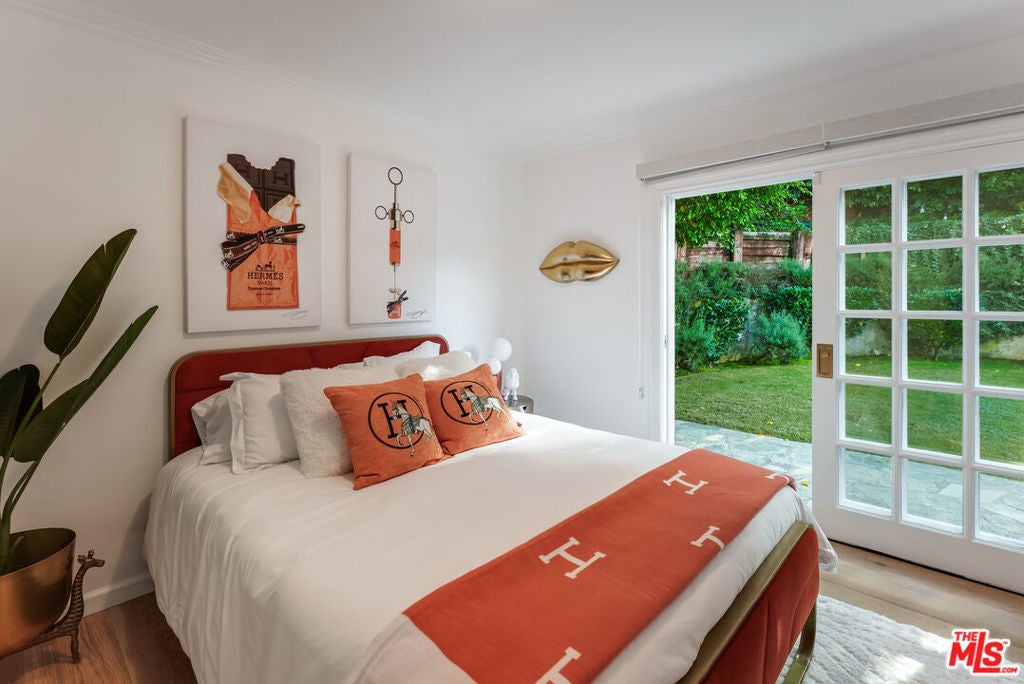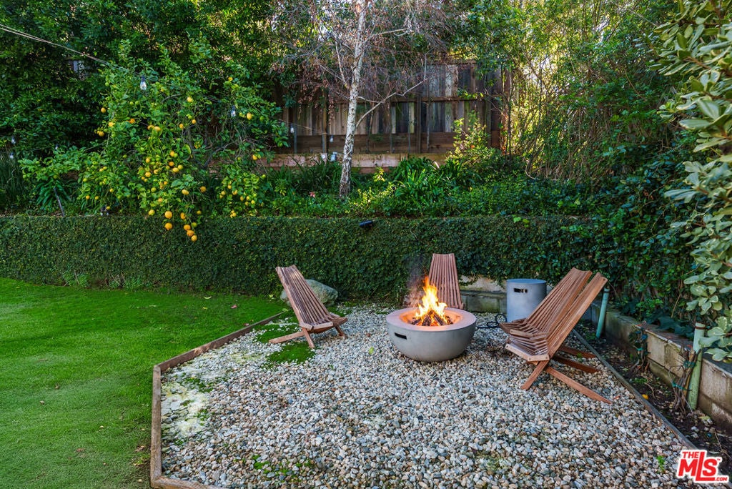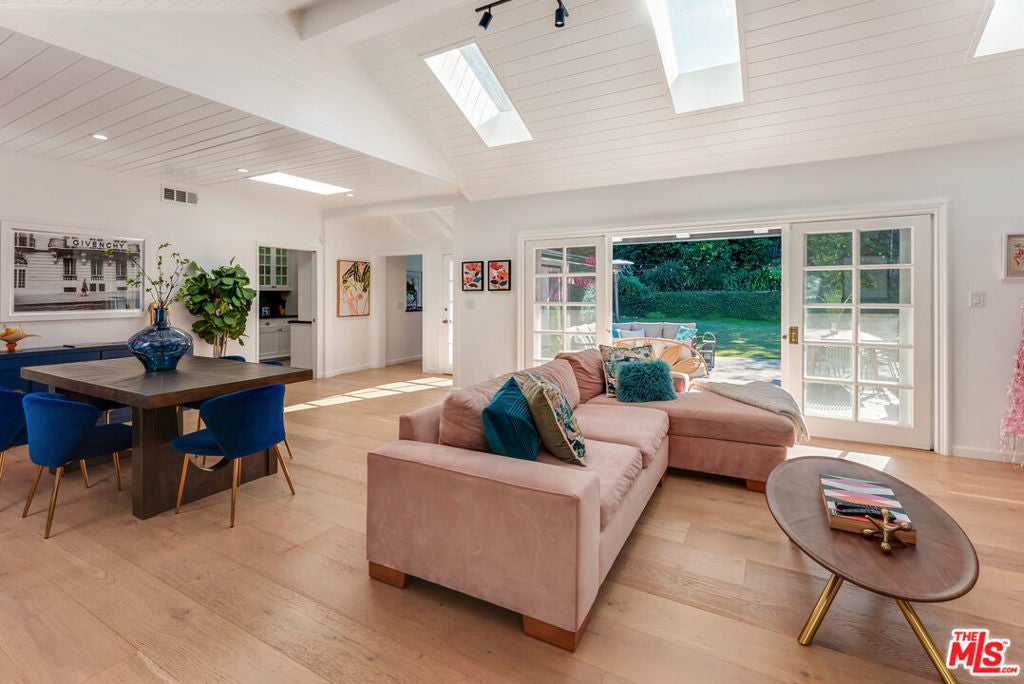 Meticulously renovated, quintessential Beverly Hills bungalow tucked away on a quiet cul-de-sac and securely placed behind gates. An impressive open-concept living and dining room showcases a cozy fireplace and dramatic vaulted ceilings dotted with skylights, welcoming an abundance of natural sunlight throughout. The chef's kitchen is fully equipped with top-of-the-line appliances, including an expansive wine refrigerator, and a cozy breakfast nook framed by sliding doors that seamlessly integrate indoor-outdoor living. The primary suite, privately located on the far wing of the home, is a true sanctuary, offering an extensive walk-in closet and a spa-like en suite. Three additional bedrooms, all generous in size with their respective en suites, complete this highly functional floor plan. Enjoy a meal al fresco in the outdoor dining area, gather around the fire pit, and pick your own citrus, all within this lush grassy oasis privately framed by mature landscaping. A true rarity a fully renovated residence of this caliber in one of the most highly coveted locations.