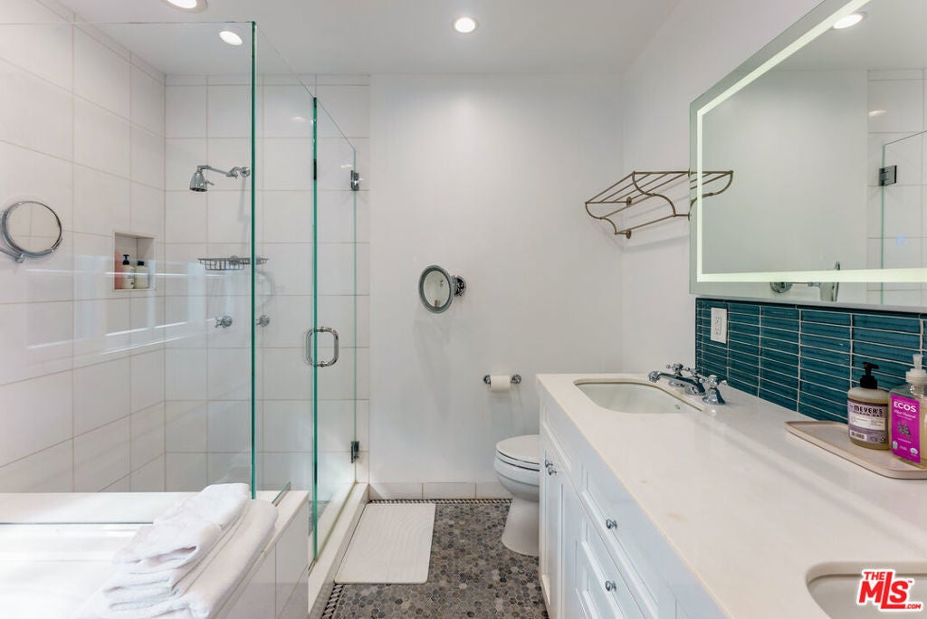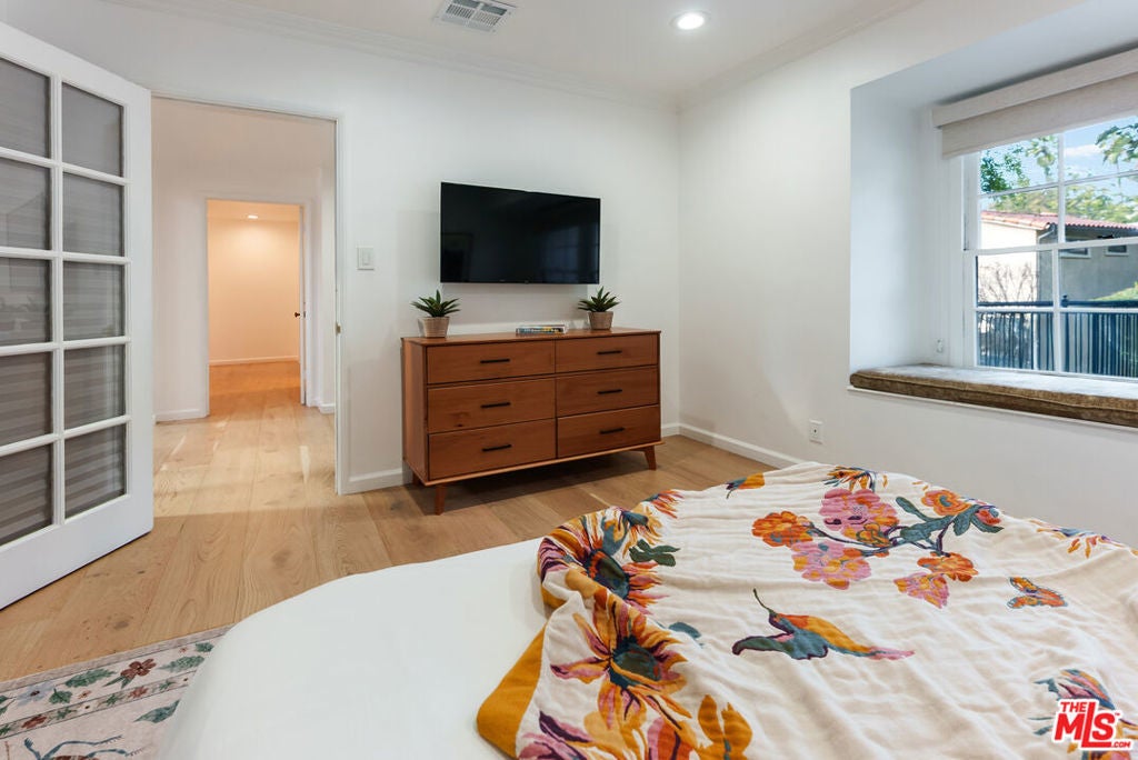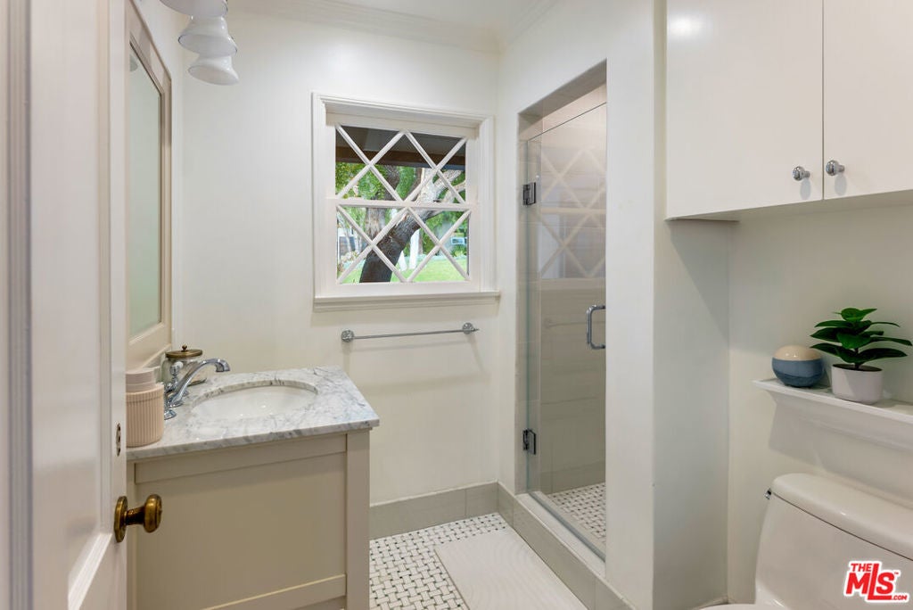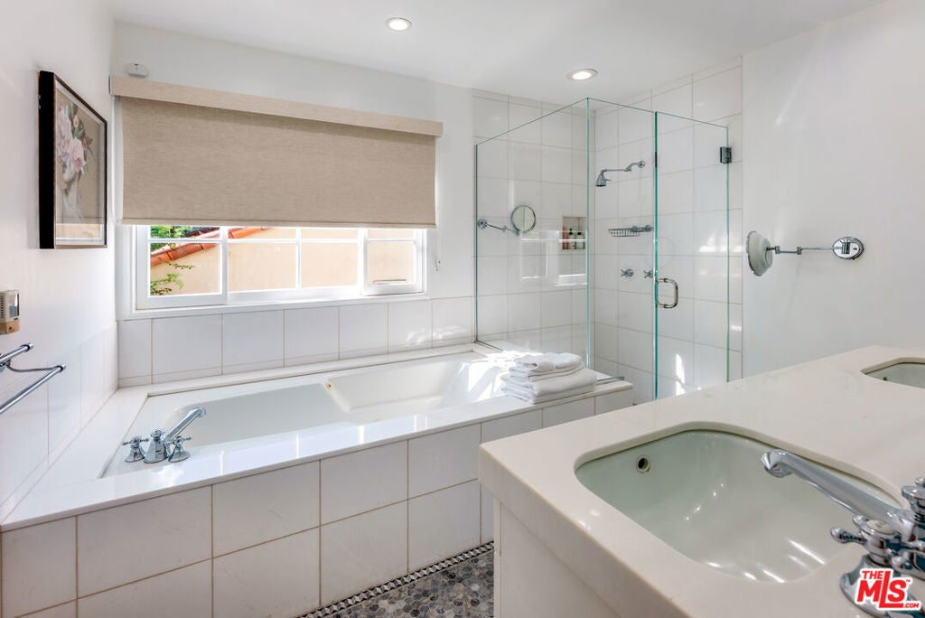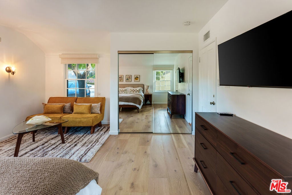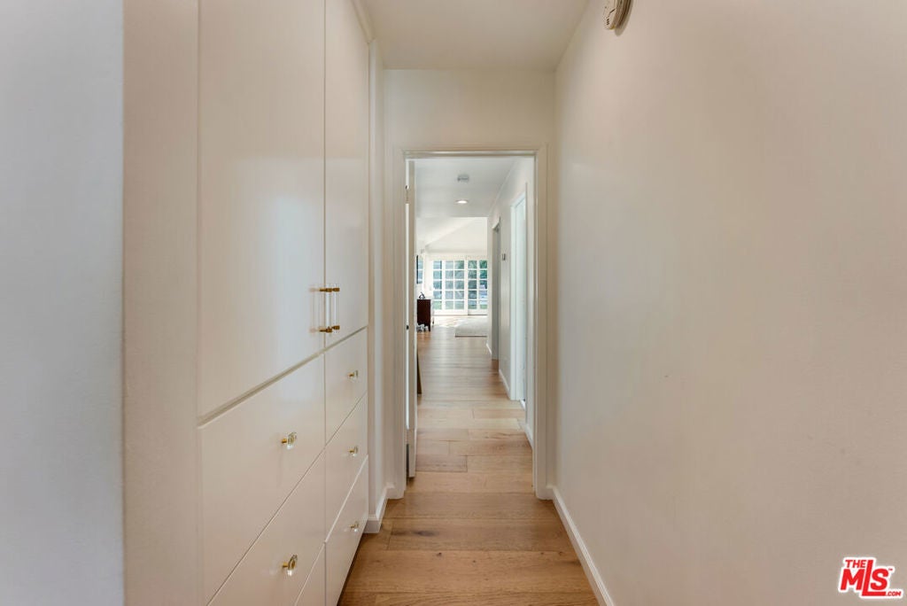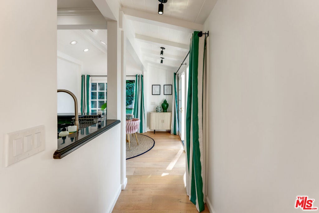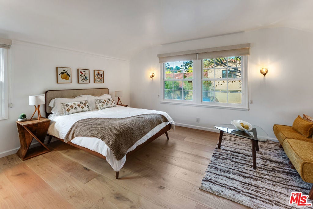 Meticulously renovated, quintessential Beverly Hills bungalow tucked away on a quiet cul-de-sac and securely placed behind gates. An impressive open-concept living and dining room showcases a cozy fireplace and dramatic vaulted ceilings dotted with skylights, welcoming an abundance of natural sunlight throughout. The chef's kitchen is fully equipped with top-of-the-line appliances, including an expansive wine refrigerator, and a cozy breakfast nook framed by sliding doors that seamlessly integrate indoor-outdoor living. The primary suite, privately located on the far wing of the home, is a true sanctuary, offering an extensive walk-in closet and a spa-like en suite. Three additional bedrooms, all generous in size with their respective en suites, complete this highly functional floor plan. Enjoy a meal al fresco in the outdoor dining area, gather around the fire pit, and pick your own citrus, all within this lush grassy oasis privately framed by mature landscaping. A true rarity a fully renovated residence of this caliber in one of the most highly coveted locations.
