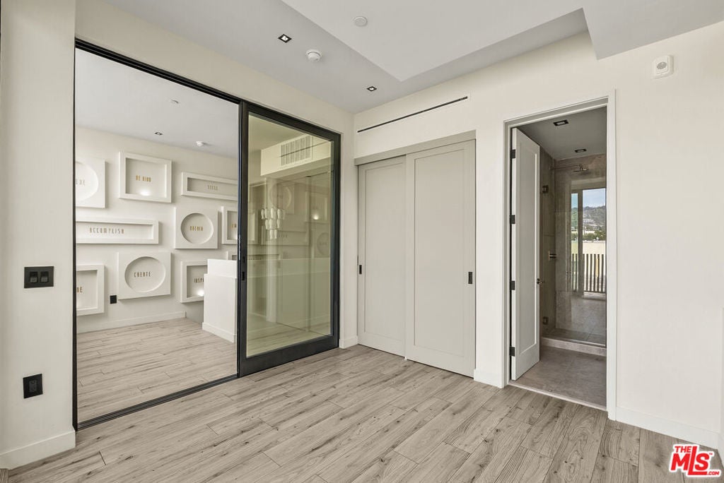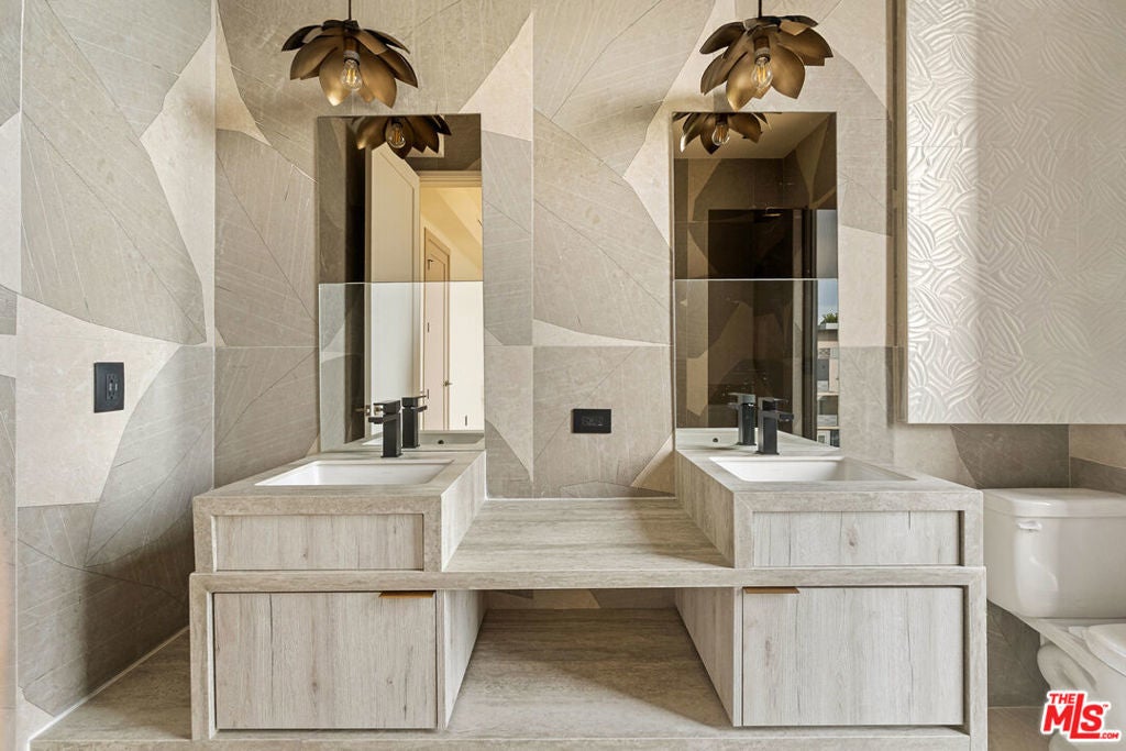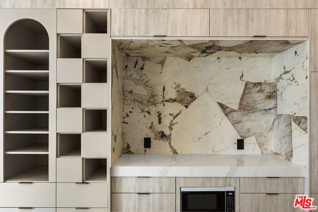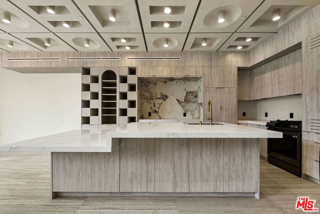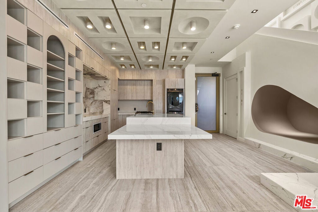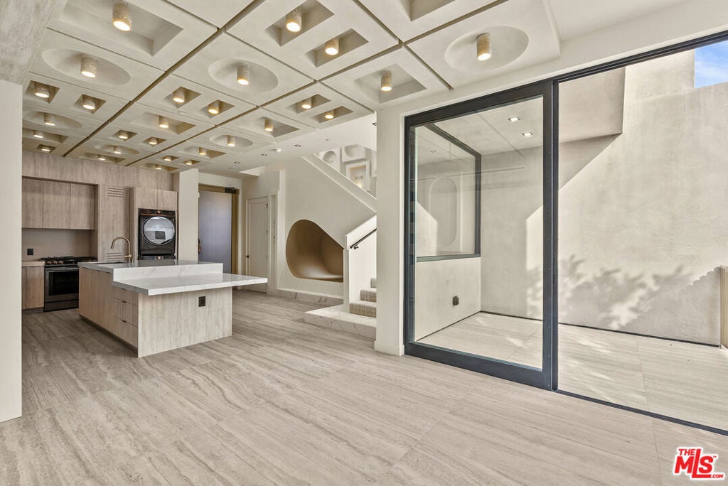Welcome to The Dolomia Niche, a one of one architectural residence. A never before lived in two bedroom, 2.5 bath penthouse home within the newly completed Limited Edition building, defined by a serene European stone palette, sculptural architectural detailing, and integrated modern functionality rarely found in lease offerings. The main living environment is anchored by the building's signature coffered ceiling with warm bronze lighting and a refined chef's kitchen wrapped in bespoke European cabinetry from Italy and Spain. Quartz countertops and large-format stone surfaces create a calm, gallery like material continuity throughout. Expansive sliding glass doors extend the residence to a 129 sqft private terrace. A sculptural interior staircase ascends to the private upper level where both bedrooms are positioned, establishing a rare two level penthouse layout. Walls are finished in ceramic and floors in porcelain, with the majority of tile selections sourced from premier manufacturers in Italy, Spain, and the United Kingdom. A defining architectural feature of the residence is the custom sculpted niche, a one of a kind built in retreat designed as a media alcove, reading lounge, or creative workspace. This signature moment introduces a sense of depth, personality, and spatial sculpture unique to this home within the Limited Edition collection. The primary suite is paired with a spa bath finished in large-format European tile from the Dolomia and Dehor collections, arranged in a geometric stone composition with warm neutral tones, floating double vanity, and modern matte black fixtures. Secondary baths continue the same refined material language with sculptural lighting and clean architectural lines. Residents also enjoy access to a landscaped rooftop retreat featuring sculptural desert plantings including golden barrel cactus, San Pedro cactus, prickly pear, aloe varieties, and flowering planters, an elevated communal lounge framed by sky and city outlooks. Delivered brand new, The Dolomia Niche represents a level of architectural leasing product not previously introduced to this West Hollywood pocket. A collectible residence within the Limited Edition development defined by bespoke design, European materials, and sculptural living.