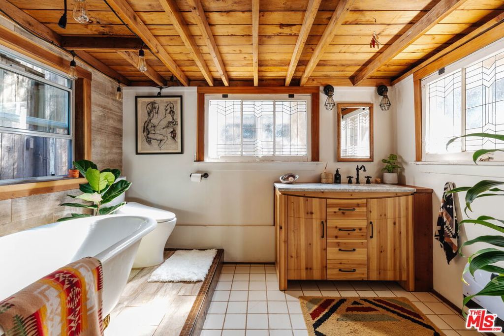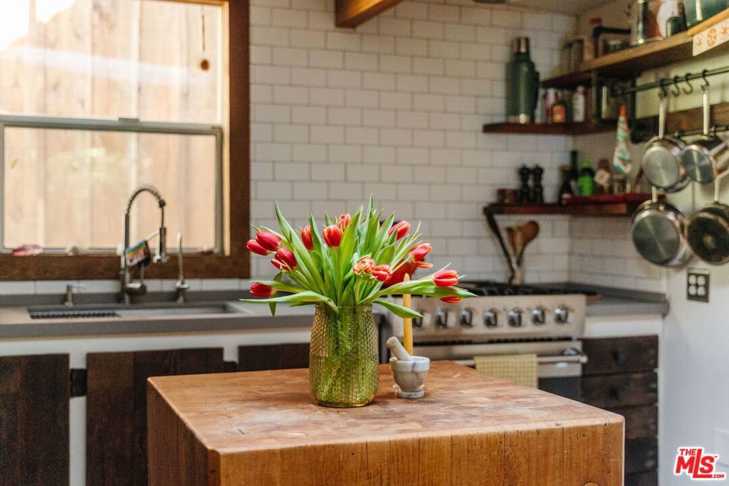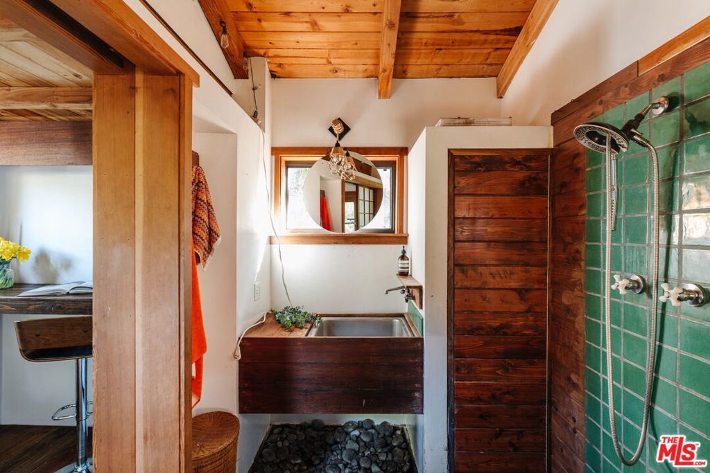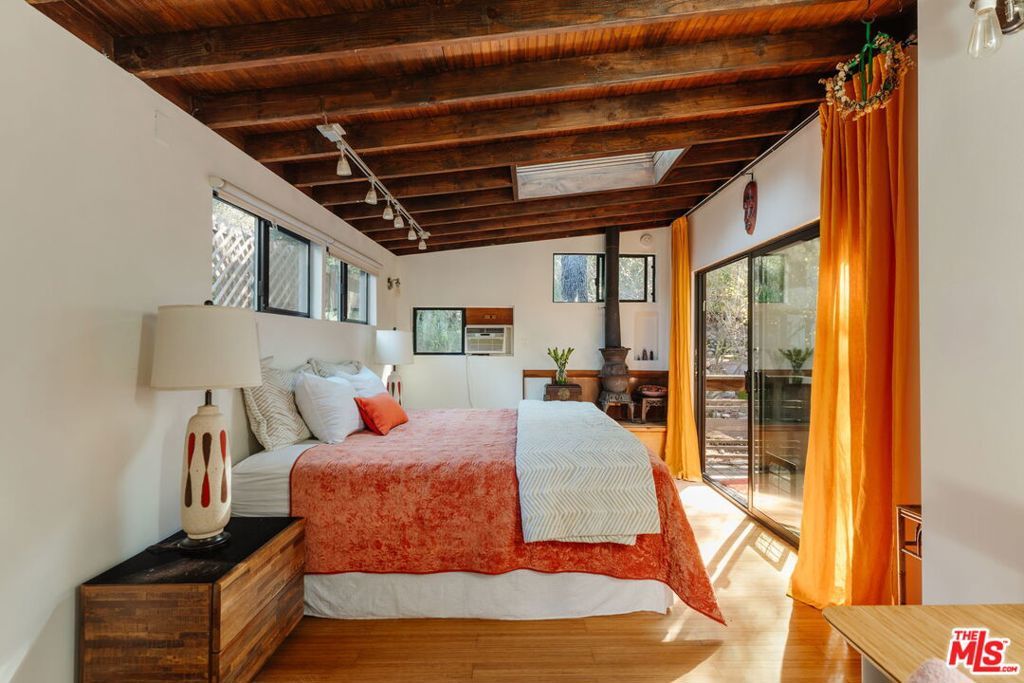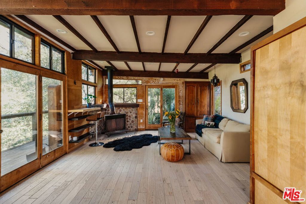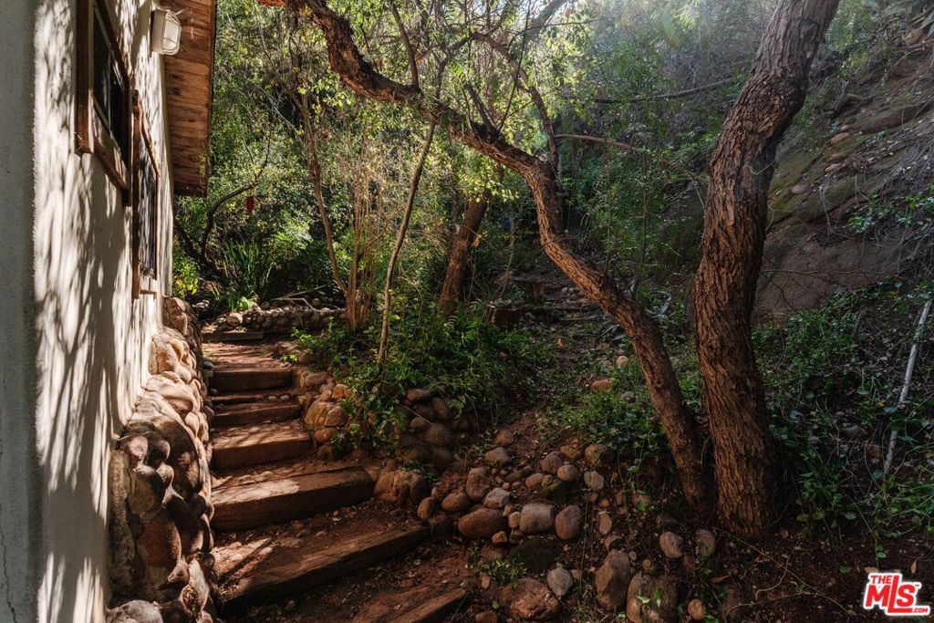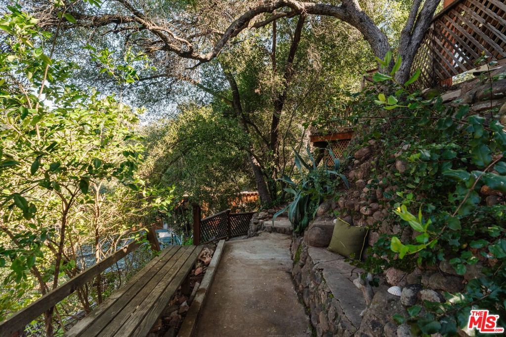 At the entrance to Red Rock Canyon, a hidden sanctuary awaits three magical cottages set among winding garden paths, mature oaks, and an acre of canyon landscape. Step outside your door and onto miles of hiking trails through one of Topanga's most beloved natural areas.The Butterfly House is a 1-bedroom, 1-bath vintage cabin rich in character, featuring stone accents, skylights and stained glass, two wood-burning fireplaces, a clawfoot tub, and a handcrafted kitchen with a Viking range. Upstairs, an airy bedroom opens out to a bridge that leads you into the garden.Follow the winding path to the Teahouse, set against the red rocks a quiet refuge complete with a lofted sleeping space, pebble-stone spa bath, and soaking tub.Above it all, the Angel's Nest a glass-and-wood studio rests in the treetops, offering a wood stove, infrared sauna, spa bath, expansive decks enveloped by the oaks and intimate canyon views.Set on an acre of land with a seasonal creek across the road, native plants and fruit trees throughout, plus modern system upgrades, a one-car garage plus 3 parking spots, and an additional storage shed. Located in the beloved Old Canyon / Red Rock community just a few minutes from the Topanga town center and approximately 15 minutes to the beach and Calabasas this special property offers the rare balance of privacy, nature, and convenience.