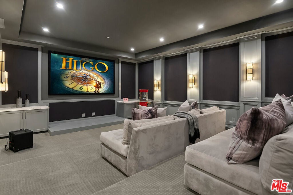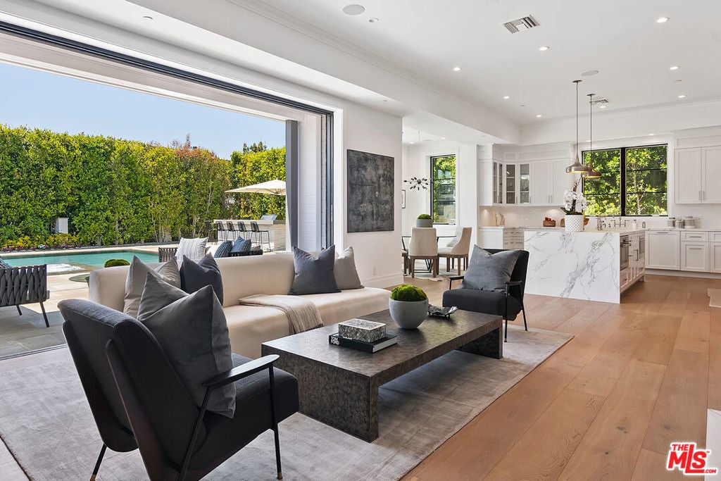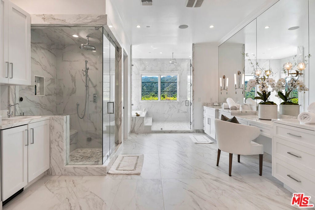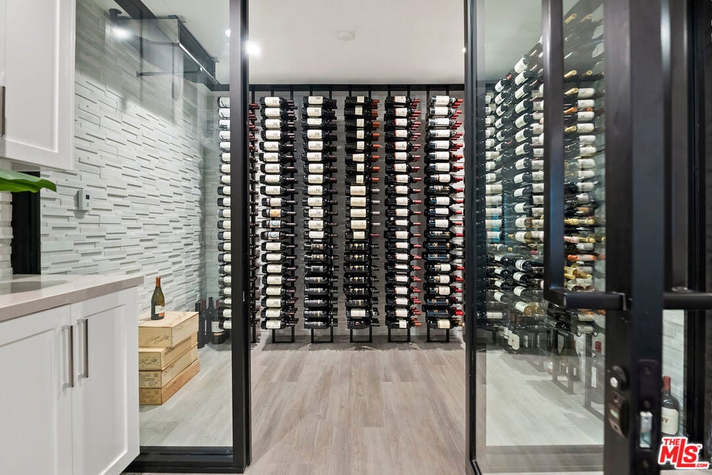 This meticulously crafted estate is located in the highly desirable Riviera of Pacific Palisades, which is known as one of Los Angeles's most sought-after neighborhoods. The house is designed in a grand Nantucket modern style and is surrounded by the beautiful Santa Monica Mountains, allowing for a sun-filled ocean breeze. As you enter the property through tempered glass and iron gates, you are greeted by the stunning 3D white marble exterior. Inside, European oak floors extend throughout the entire house, adding an elegant touch. The main level of the house offers a spacious living room with a fireplace, an open dining room, an office with a separate entrance from the front yard, a guest bedroom suite, Chef's kitchen with top-of-the-line appliances and features an oversized waterfall suede island that serves as a focal point. Slide open the La Cantina pocket doors, and you'll find yourself on the raw bluestone patio, where you can enjoy the zero-edge pool and soak in the serene ambiance. Additionally, there is a custom outdoor BBQ area and a Tuuci lounge canopy, creating a resort-like experience in your own backyard. Moving upstairs, the primary suite is the highlight of the home. It boasts a generous size, a sitting area, a fireplace, and a balcony overlooking the surroundings. The primary bathroom offers dual vanities, a spa shower adorned with lavish Italian Calacatta marble, and a luxurious dressing room. Each of the secondary and third bedrooms also features its own private patio, allowing for an ultimate indoor/outdoor lifestyle. The lower level of the house is designed for entertainment and includes an acoustic theater, a temperature-controlled wine cellar, a bar, a guest bedroom, and a patio area. This level is perfect for hosting gatherings and enjoying leisure activities. In total, this remarkable estate offers 5 bedrooms, 8 bathrooms, and a 6-car collector's garage. For convenience, an elevator connects all three floors, providing easy access to every part of the house. This exquisite property presents an opportunity to embark upon a new chapter of luxurious living, combining elegance, functionality, and the beauty of its natural surroundings.