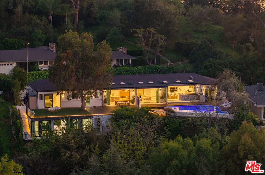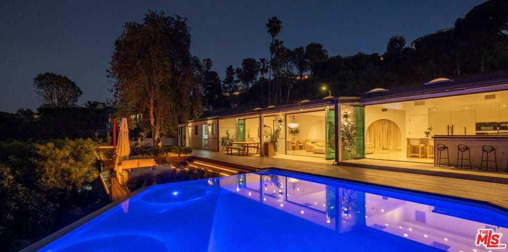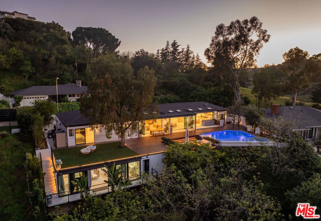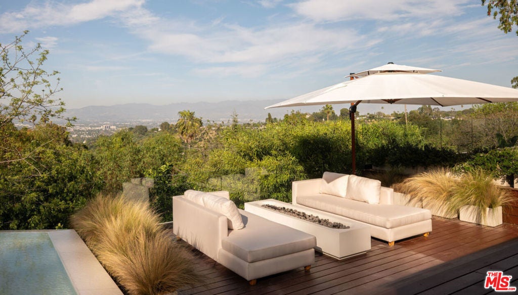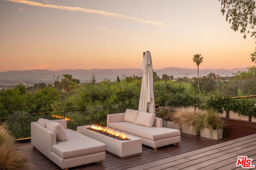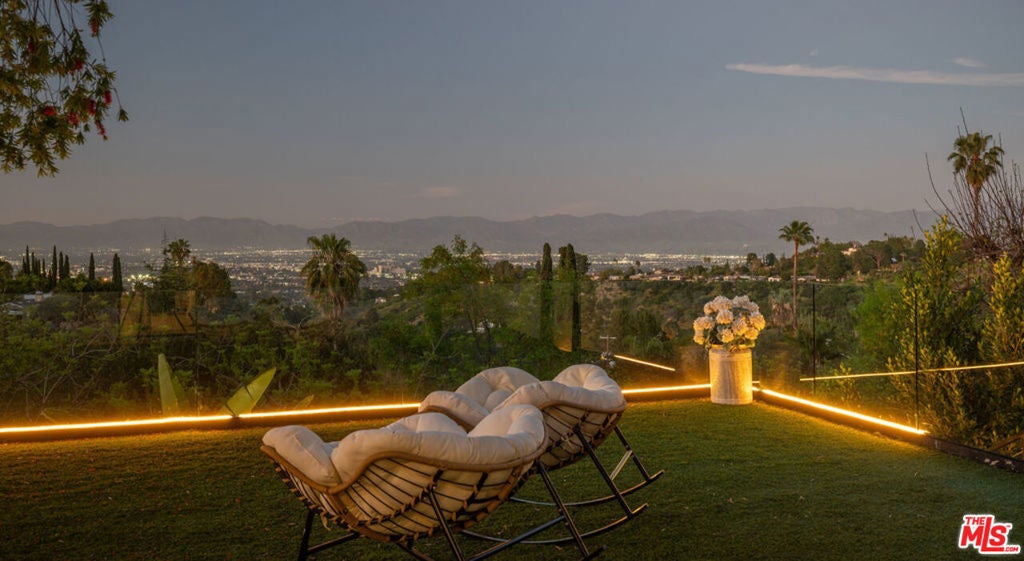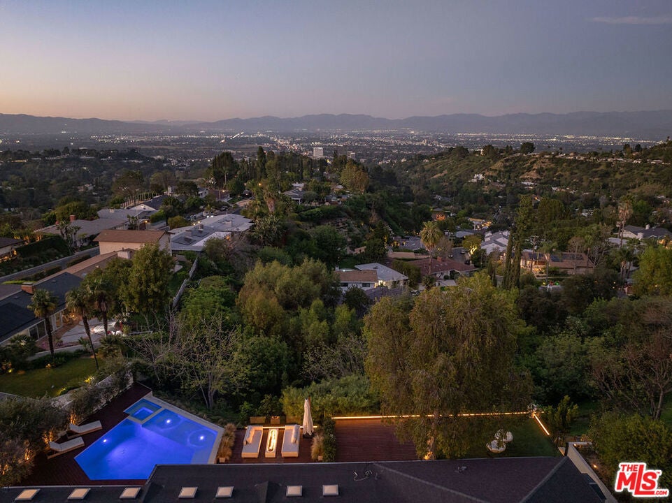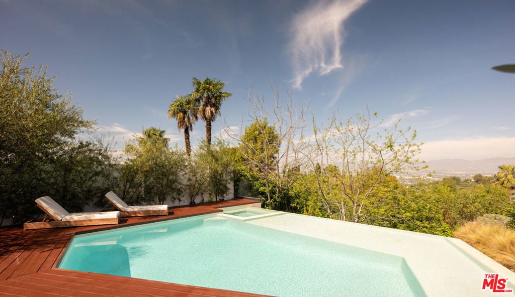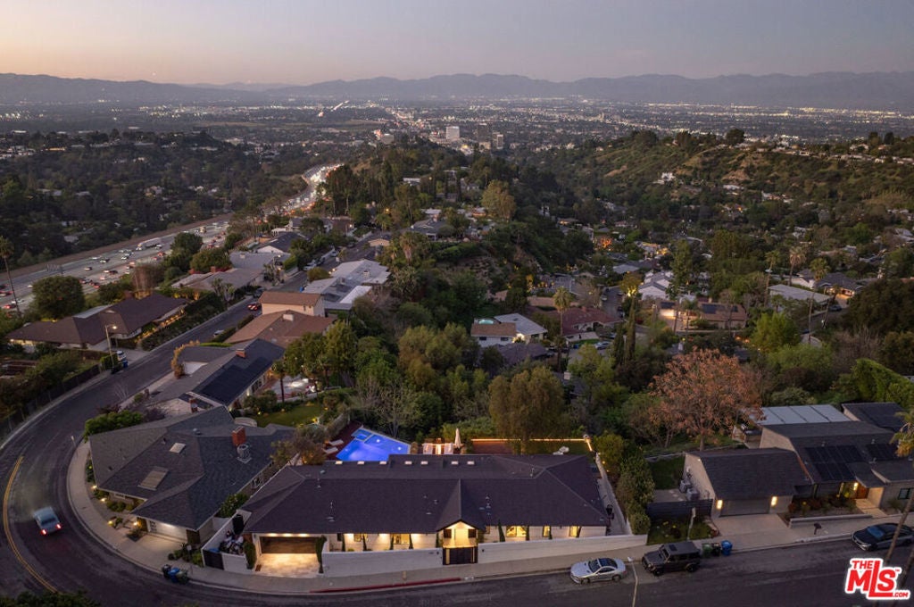 Introducing "The Scadlock MCM," an exceptionally renovated Mid-Century Modern residence ideally positioned on one of Sherman Oaks' most coveted view streets, offering breathtaking north-facing valley vistas enjoyed from nearly every vantage point. Rebuilt from the studs with meticulous craftsmanship, this architectural retreat blends timeless designer finishes with modern luxury and thoughtful functionality. Dramatic 14-foot vaulted ceilings with skylights flood the home with natural light, while expansive large-format Italian flooring and custom walnut built-ins create a warm modern aesthetic throughout the living spaces. The chef's kitchen features premium Miele appliances including dual stovetops, double ovens with steam capability, warming drawers, and a built-in espresso system, complemented by a Sub-Zero refrigeration system and striking Neolith Spanish stone waterfall countertops. Designed for privacy and comfort, the home features SolidCore accordion glass doors, sound-insulated interior walls, and glass hallway doors separating the sleeping quarters from the main entertaining areas. Outdoor living showcases a saltwater infinity-edge pool with Baja shelf, wood decking, fire pit lounge, and outdoor kitchen, surrounded by mature citrus trees. A private detached guest house evokes the feeling of a Bali treehouse retreat, ideal for guests, studio, or wellness space. A dedicated fitness room frames the valley views while a fixed glass panel into the garage creates a striking architectural car gallery moment. Additional amenities include 400-amp electrical service, Lutron smart lighting, Sonos audio, EV charging capability, and advanced fire protection safeguards featuring roof-mounted sprinkler systems and perimeter fire defense protection. Located within the award-winning Roscomare Road Elementary School District and close to the premier dining, shopping, and entertainment the Valley has to offer, with convenient access to the Westside and Beverly Hills. Truly one of the most compelling offerings in the area at this price point.