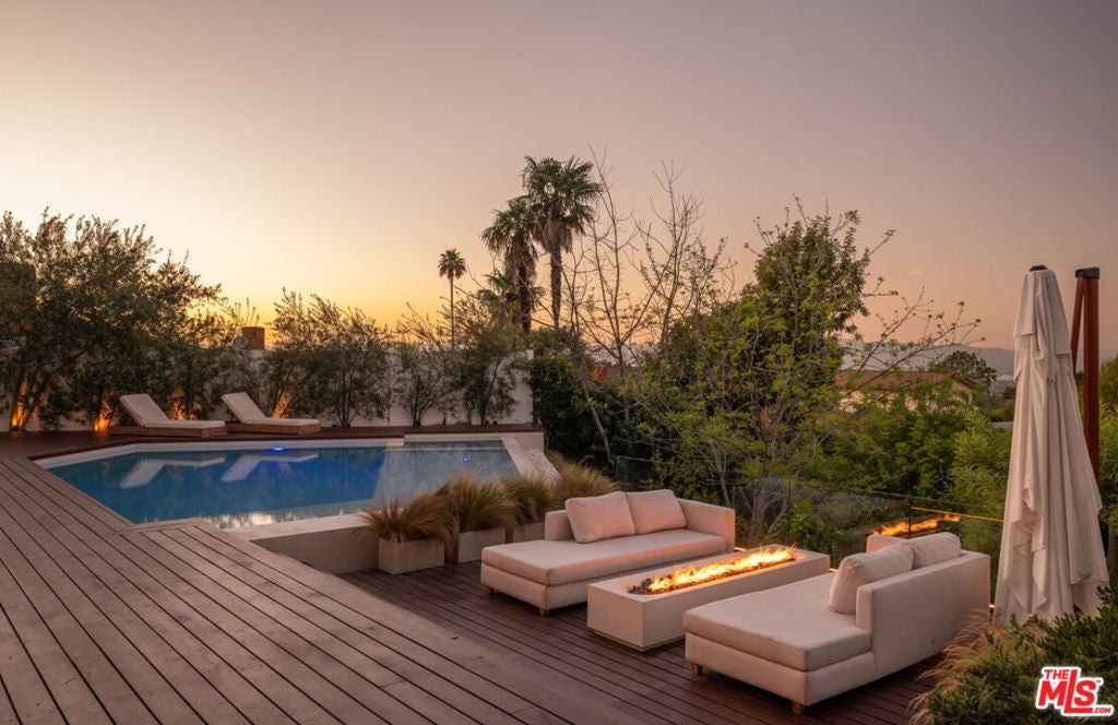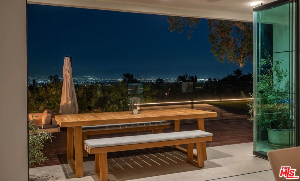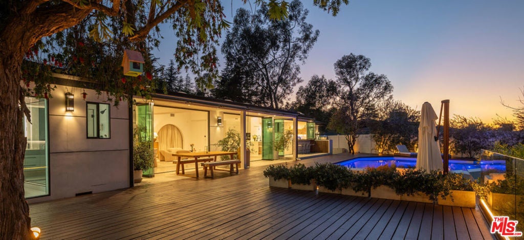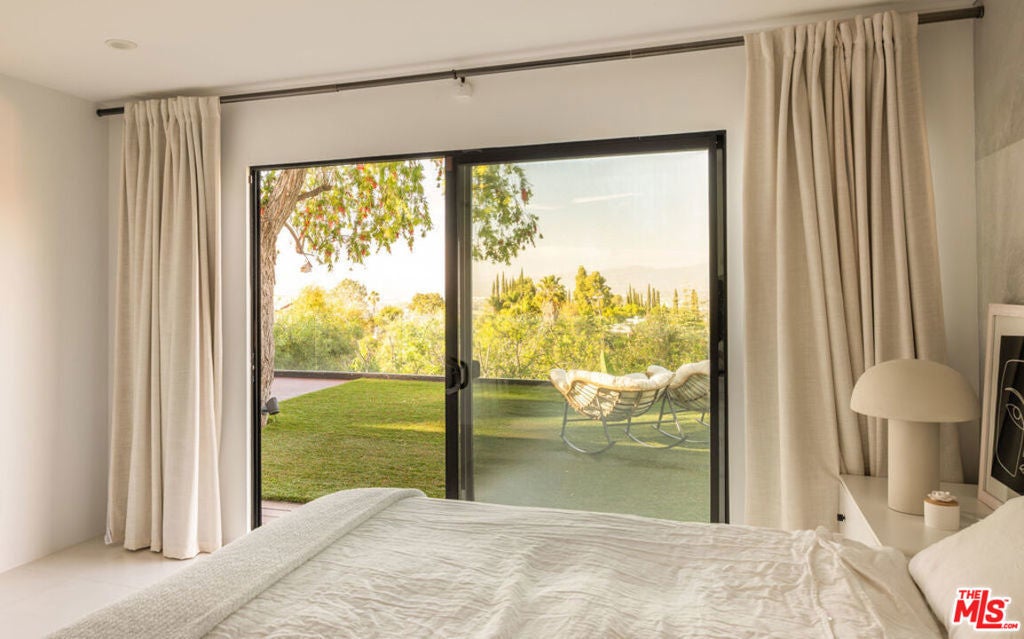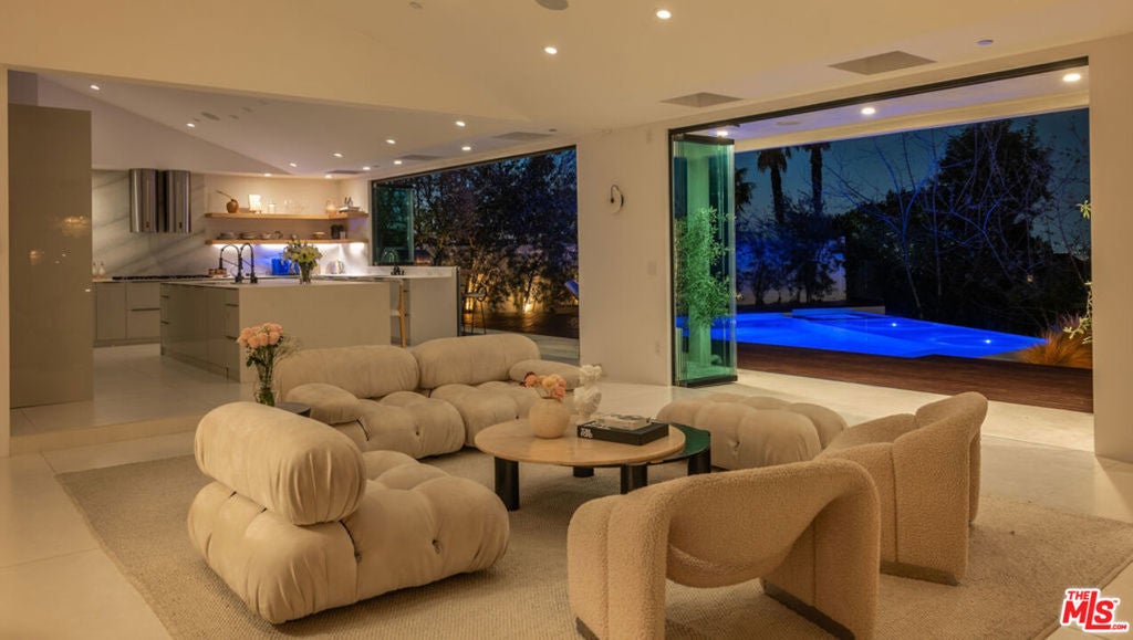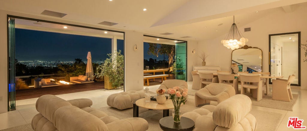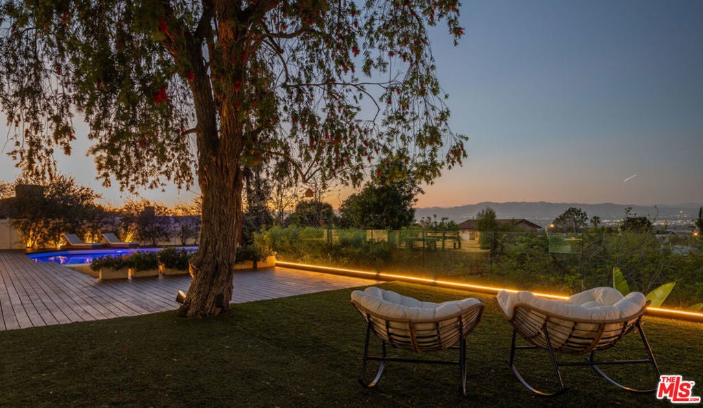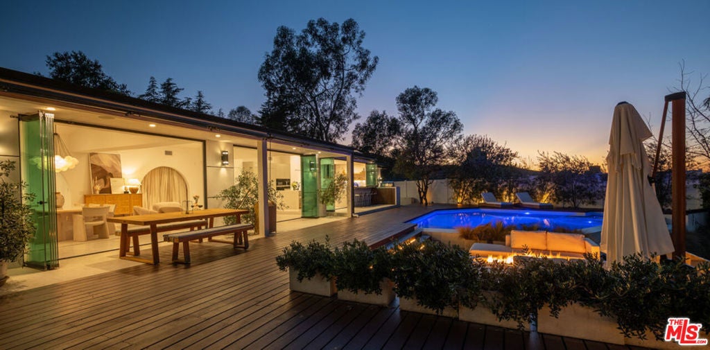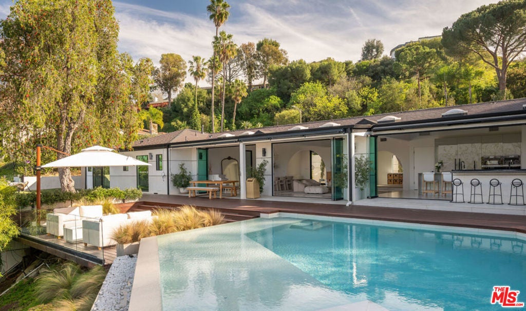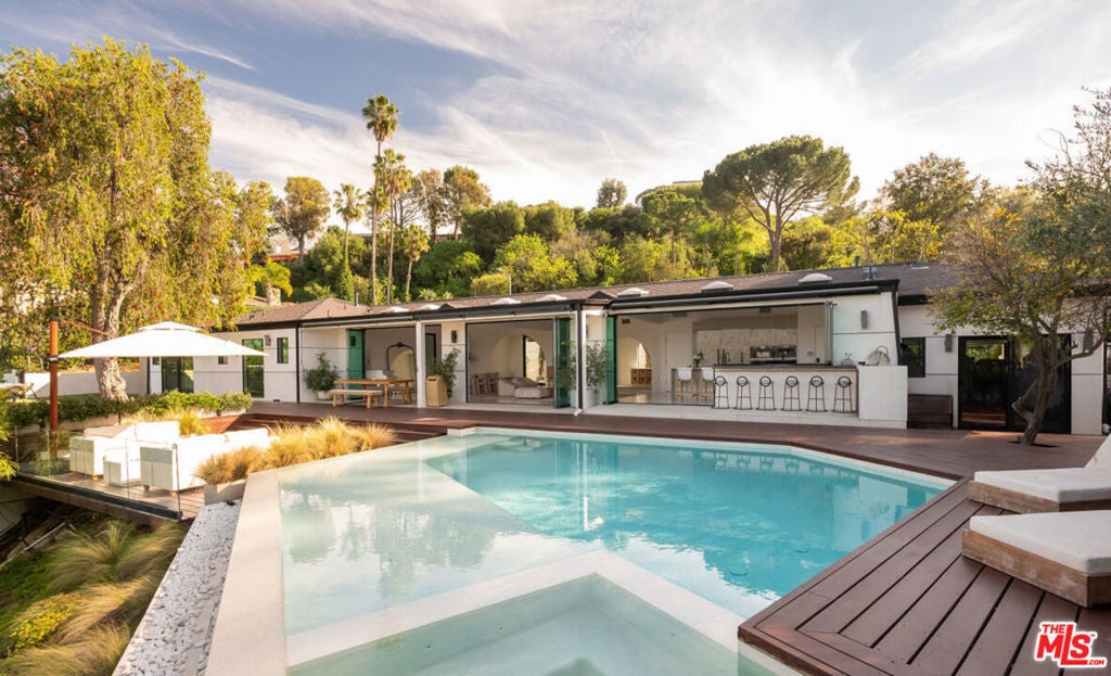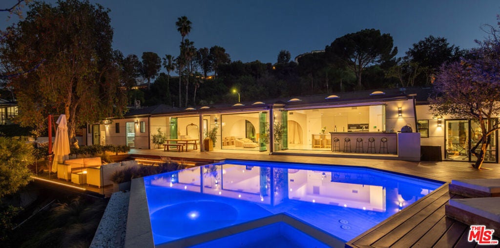Introducing "The Scadlock MCM," an exceptionally renovated Mid-Century Modern residence ideally positioned on one of Sherman Oaks' most coveted view streets, offering breathtaking north-facing valley vistas enjoyed from nearly every vantage point. Rebuilt from the studs with meticulous craftsmanship, this architectural retreat blends timeless designer finishes with modern luxury and thoughtful functionality. Dramatic 14-foot vaulted ceilings with skylights flood the home with natural light, while expansive large-format Italian flooring and custom walnut built-ins create a warm modern aesthetic throughout the living spaces. The chef's kitchen features premium Miele appliances including dual stovetops, double ovens with steam capability, warming drawers, and a built-in espresso system, complemented by a Sub-Zero refrigeration system and striking Neolith Spanish stone waterfall countertops. Designed for privacy and comfort, the home features SolidCore accordion glass doors, sound-insulated interior walls, and glass hallway doors separating the sleeping quarters from the main entertaining areas. Outdoor living showcases a saltwater infinity-edge pool with Baja shelf, wood decking, fire pit lounge, and outdoor kitchen, surrounded by mature citrus trees. A private detached guest house evokes the feeling of a Bali treehouse retreat, ideal for guests, studio, or wellness space. A dedicated fitness room frames the valley views while a fixed glass panel into the garage creates a striking architectural car gallery moment. Additional amenities include 400-amp electrical service, Lutron smart lighting, Sonos audio, EV charging capability, and advanced fire protection safeguards featuring roof-mounted sprinkler systems and perimeter fire defense protection. Located within the award-winning Roscomare Road Elementary School District and close to the premier dining, shopping, and entertainment the Valley has to offer, with convenient access to the Westside and Beverly Hills. Truly one of the most compelling offerings in the area at this price point.