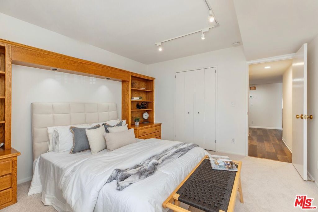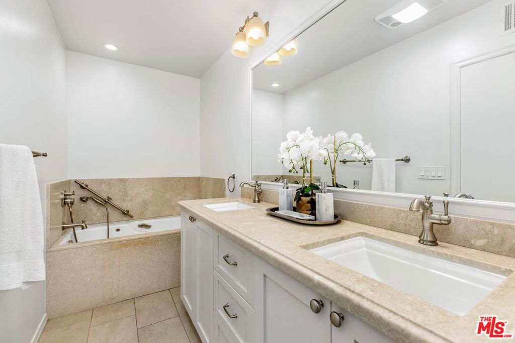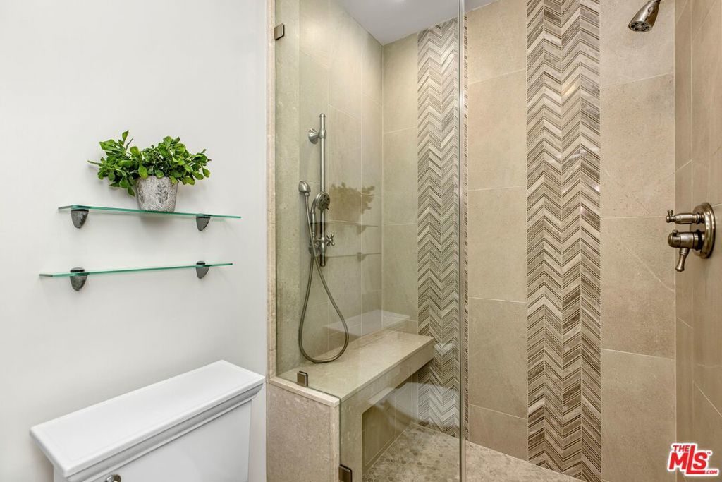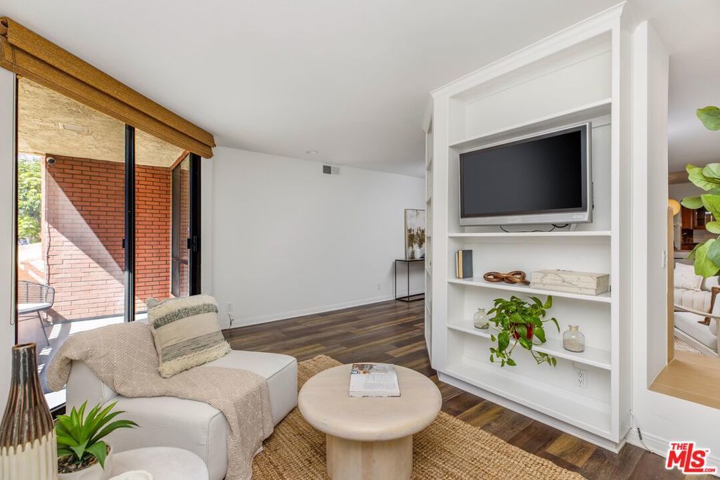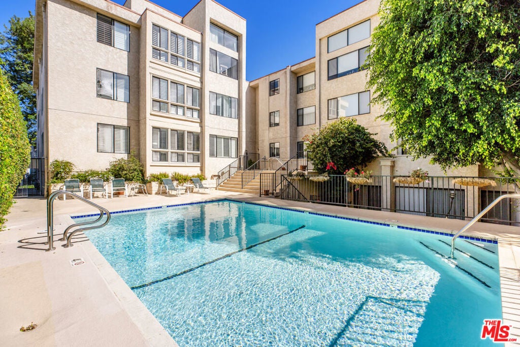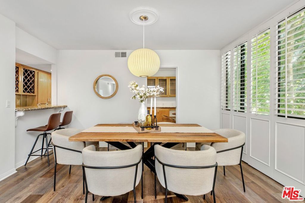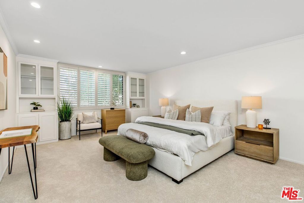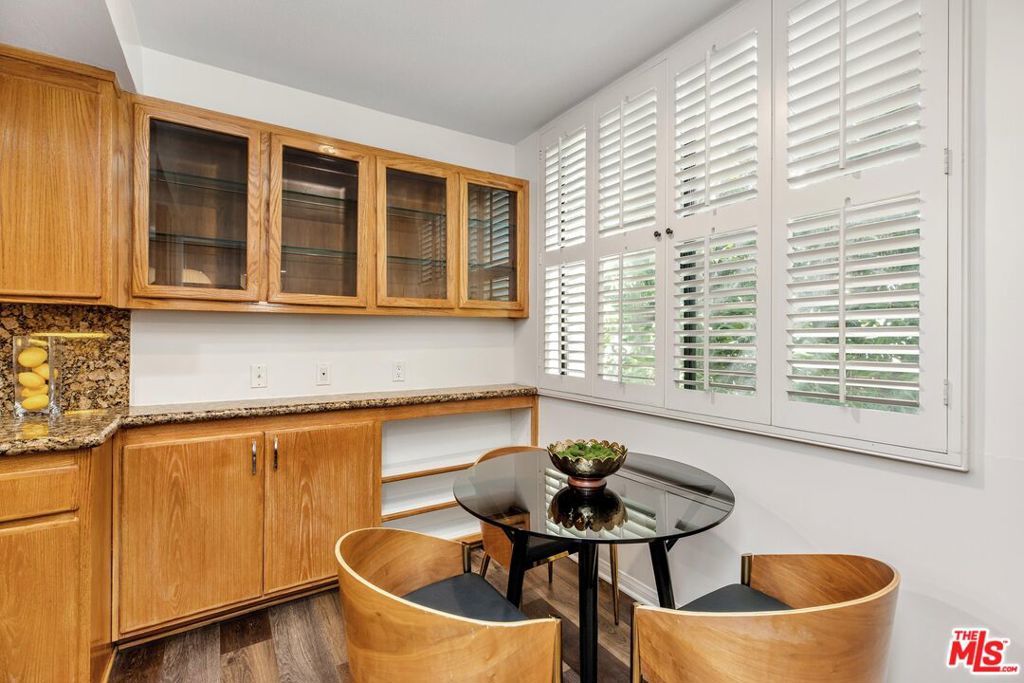 Introducing a beautifully updated corner, end unit that offers the comfort and privacy of a single-family residence, set on a peaceful street South of Ventura Boulevard in Sherman Oaks. This two-bedroom luxury condo spans just under 1800 square feet of living space and enjoys an ideal front-facing position within the building complemented by a private balcony. It shares just one common wall and offers open, light-filled living areas featuring top quality engineered wood floors, generously sized bedrooms, and exceptional building amenities. A double door formal entry leads into a bright dining area anchored by a stylish wet bar with wine racks, bar seating, and custom built-ins. The space flows seamlessly into the living room, featuring charming shutters, a sleek gas fireplace, and recessed lighting throughout. A cozy nook/den off the living room extends to a secluded balcony raised above the street, creating an inviting indoor-outdoor retreat. The expansive kitchen is thoughtfully appointed with a newer JennAir refrigerator, double ovens, marble countertops, custom pull-out drawers, refinished wood cabinetry with ample pantry storage, and a charming breakfast nook. The primary suite impresses with soaring ceilings, dual walk-in closets, additional built-in cabinets with pull outs, and a spa-inspired, en-suite bath featuring a dual vanity, soaking jacuzzi tub, and a herringbone tile walk-in shower with bench seating. The secondary bedroom, privately situated on the opposite wing, includes adjustable track lighting, a custom built-in wall unit with integrated bookshelves and nightstands, a walk-in closet, and an additional full closet. A well-appointed hall bath just off this bedroom offers generous counter space, a large shower, and polished tile flooring. Additional highlights include abundant hallway storage, a laundry closet already set up with a side-by-side washer and dryer, fresh paint throughout, brand-new carpeting in each bedroom, and a newer HVAC system. The vast array of building amenities include two side-by-side garage parking spaces for the unit with dedicated overhead storage, a heated pool and spa, a fitness center, a sauna, a recreation room, and a serene courtyard. HOA dues also include both earthquake and building insurance, water, trash, sewer and professional management. Ideally located near Sherman Oaks Elementary Charter, Whole Foods Market, and the premier dining and shopping along Ventura Boulevard, this home offers refined living in a truly unbeatable location!
