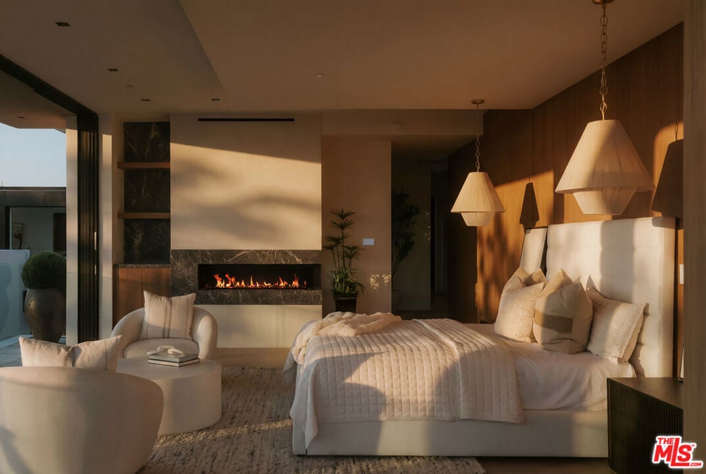 Positioned at the end of a private cul-de-sac in Bel-Air, this newly reimagined architectural estate spans approximately 10,000 square feet and captures sweeping 270-degree views across the Bel-Air Country Club, Pacific Ocean, Catalina Island, Century City skyline, and The Getty. Set behind private gates, the residence delivers scale, privacy, and presence. Walls of floor-to-ceiling glass frame the views and flood the main level with natural light, anchoring a grand great room, formal dining room with fireplace, state-of-the-art theater, and a refined bar with walk-in wine cellar. The chef's kitchen is designed for both performance and presentation, featuring dual islands wrapped in Arrebescato marble, top-tier appliances, and a separate butler's prep kitchen. Automated Fleetwood pocket doors disappear into the walls, opening to expansive terraces, a covered loggia, outdoor BBQ, and a dramatic 62-foot cantilevered pool. Upstairs, the primary suite spans approximately 2,200 square feet, offering a private view terrace, dual baths, and a dedicated lounge or executive office with wet bar. Three additional en-suite bedrooms and a secondary family lounge complete the upper level. Nearly every room commands unobstructed city and ocean views. A statement of design, privacy, and scale, this Bel-Air estate represents a rare offering in one of Los Angeles' most coveted enclaves.