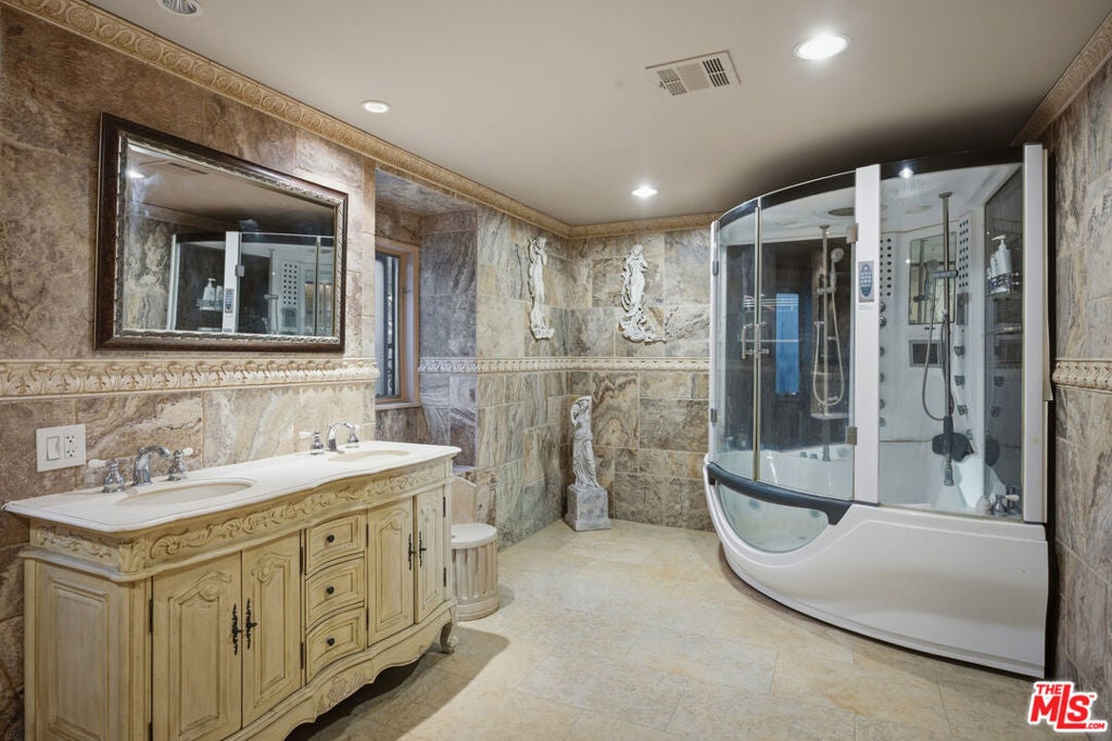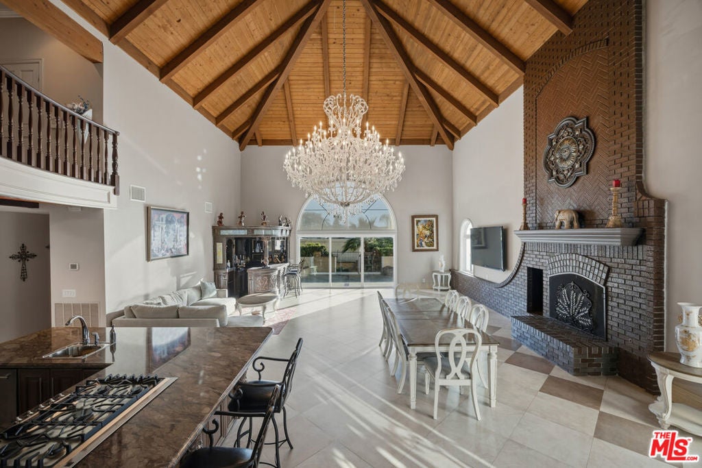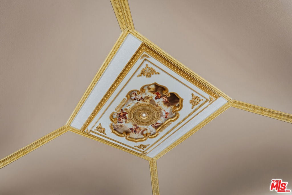 A rare, gated architectural estate bordering Brand Park, approached by a private drive that opens to a palm-lined motor court with fountain. A grand two-story entry with a curved staircase unveils refined architectural details throughout, including statement marble fireplaces, designer chandeliers, and Italian porcelain tile floors. A turreted two story private library offers private access to the primary suite, while formal living and dining rooms transition seamlessly into a dramatic great room crowned by 30-foot beamed ceilings and expansive view windows. The chef's kitchen showcases custom cabinetry, granite countertops, and an oversized island designed for entertaining. From the primary suite, jetliner views stretch across the city. The home features five bedrooms including two primary suites, plus a private two-bedroom attached guest house. Outdoors, a resort-style pool and spa, outdoor kitchen with bar seating, private yard and additional guest parking complete this secluded, legacy-caliber retreat.