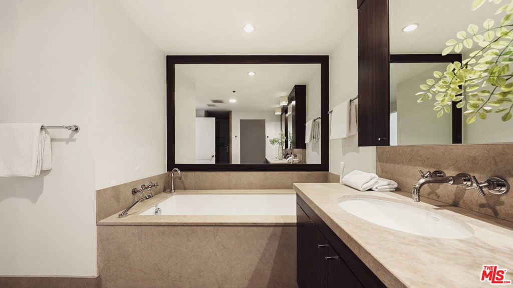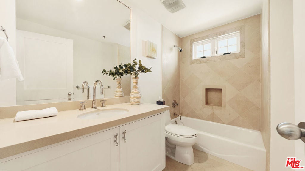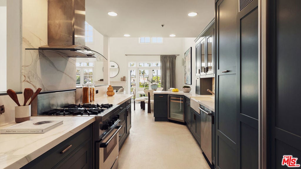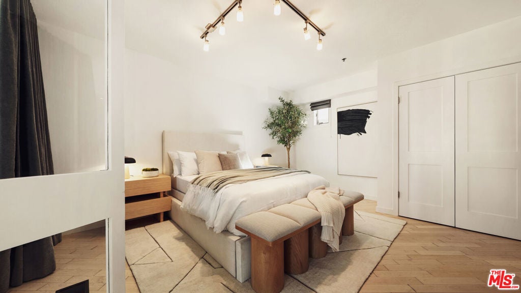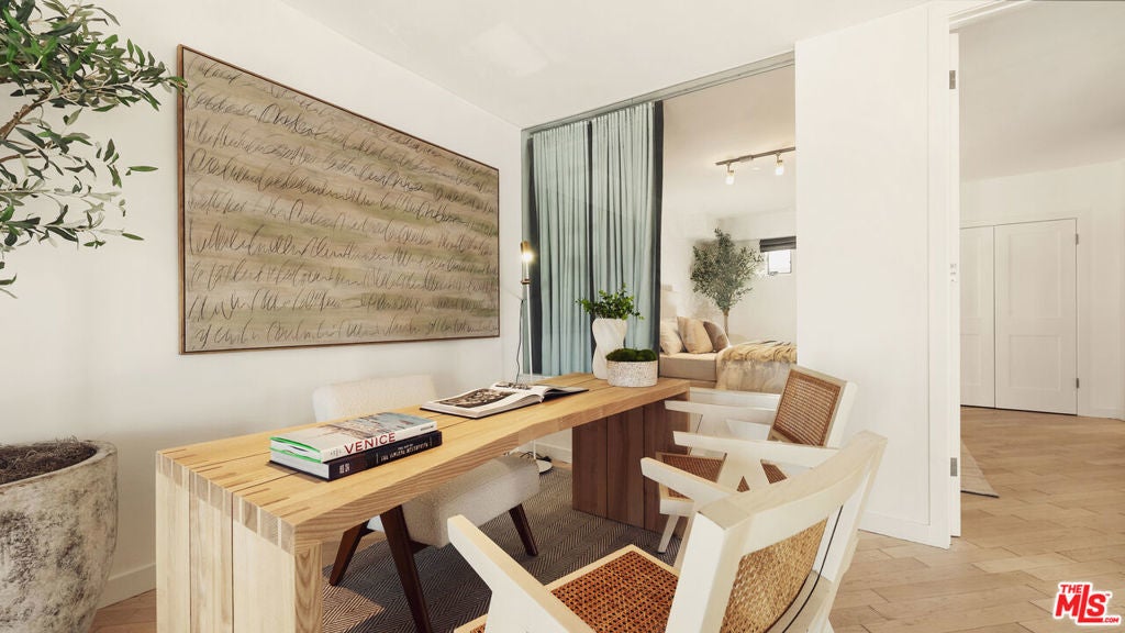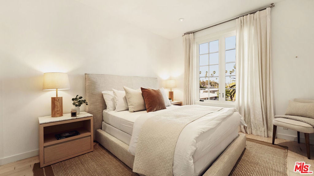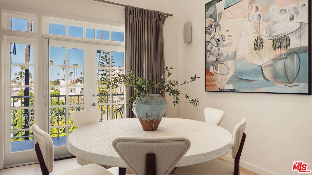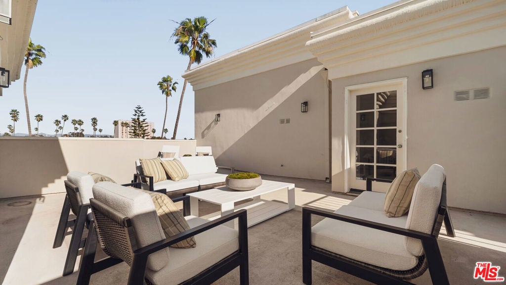 Premier penthouse living just four blocks from the beach and Montana Avenue.This front-facing, two-story residence offers 3 bedrooms, 3 bathrooms, and approximately 2,243 sq ft of light-filled living space. Soaring 18-foot double-height windows and French doors open to a private balcony, creating seamless indoor-outdoor flow. The open-concept living and dining areas connect to a sleek chef's kitchen with top-tier appliances and modern finishes. The main-level primary suite features a custom walk-in closet and spa-inspired bath with soaking tub, separate shower, and dual vanity. A private side patio offers an additional outdoor retreat. A versatile loft and two ensuite bedrooms provide flexible living and privacy. Glass railings enhance the bright, contemporary feel throughout. The showstopper: an expansive, exclusive rooftop deck, remarkably private and ideal for entertaining or sunset lounging. Additional highlights include a dedicated laundry room, multiple storage spaces, and three side-by-side parking spots. A rare penthouse opportunity in one of Santa Monica's most coveted locations.