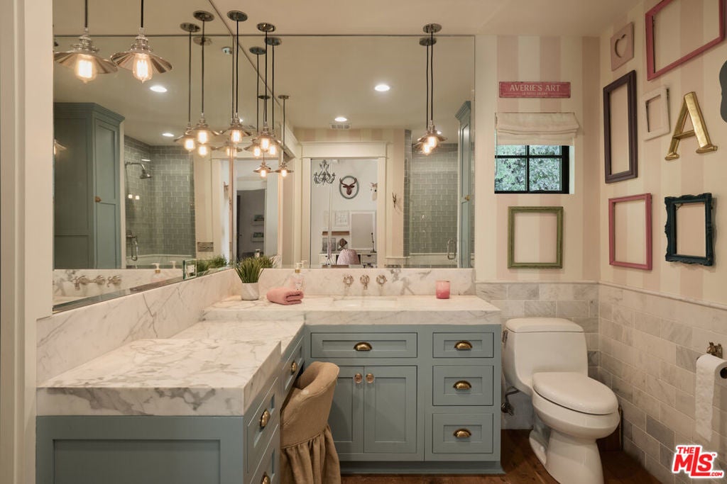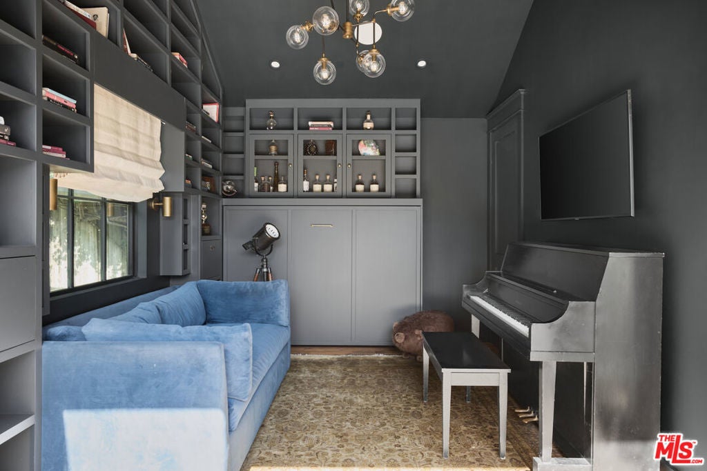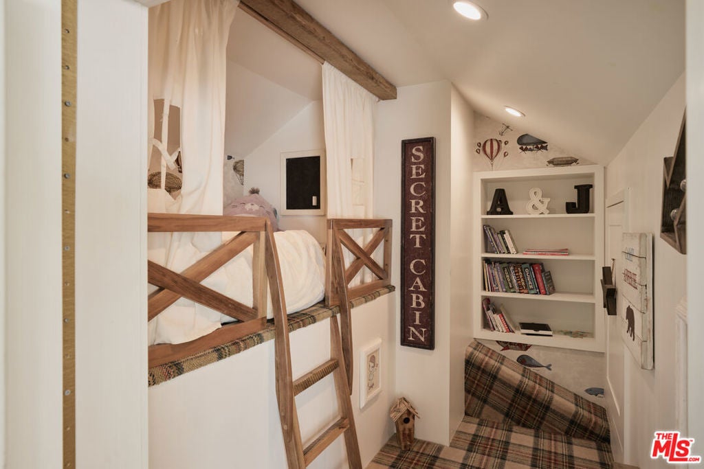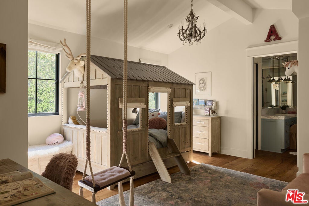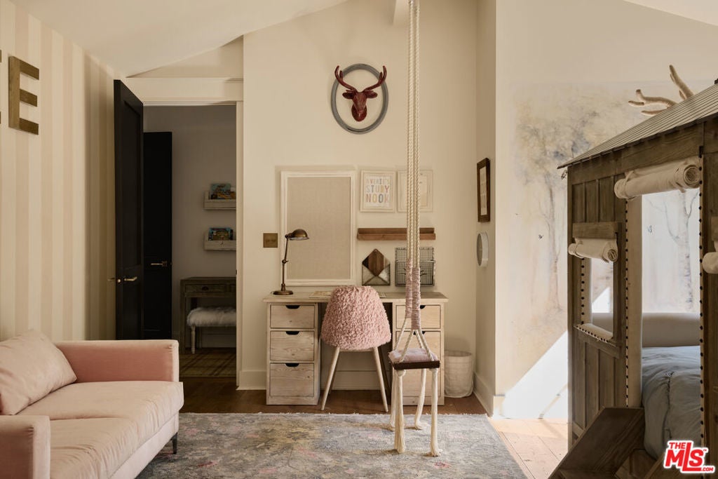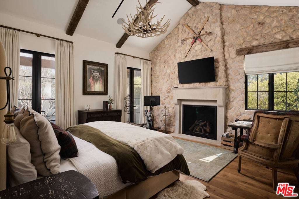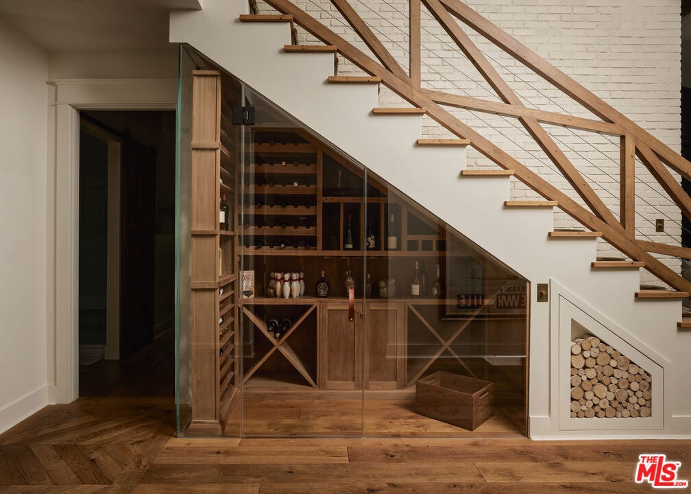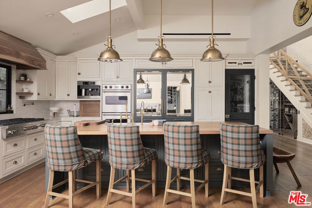 Welcome to this picture-perfect country farm house on an idyllic cul-de-sac, beautifully remodeled with moments tastefully curated for savoring all of life's most wonderful comforts and pleasures. The limewashed tumbled brick facade is complemented by rustic lighting, exposed beams, a barn-style garage door, and porch swing set amidst manicured landscaping. Through the elegant arched glass-paned front door, discover wide-plank wood floors, lofty vaulted ceilings, and organic materials. With organization and space-saving top of mind, every section is thoughtfully optimized. The prize of the foyer is a quaint temperature-controlled under-stair wine store, encased in glass with an old-town feel. The delightful kitchen includes a large island with farm sink, Viking cooktop with hood and pot filler, Miele espresso, custom paneled refrigerator, bread box, and pantry, all accented by brass deVOL Kitchens hardware and fixtures. Nearby, enjoy family gatherings in the sunlit dining area. The European ski lodge-inspired primary suite includes an antique Tuscan farmhouse stone accent wall with fireplace, vaulted ceilings, plumbed coffee system, beverage refrigerator, and sitting area. Its en-suite bath is appointed with a dual-sink vanity, separate soaking tub, oversized rainwater shower, and bay window ledge, while the custom walk-in closet features numerous built-ins. The family room opens to the outside via sliding pocket doors, perfect for indoor-outdoor flow and an al-fresco ambiance. There is also a den/gaming lounge with a speak-easy-style bar as well as a media/television room. Secondary bedrooms and bathrooms are also well-done and light-filled, and they are even equipped with charming day swings for the young at heart. The finished attic has been transformed into a secret hideaway for story time and sleepovers! Modern conveniences and fine details found throughout include authentic French oak floors imported from the Lorraine region, all century-old solid wood beams, Forbes & Lomax switch plates and toggles, and five HVAC systems for optimum climate management. In the backyard, roam and play on the grassy lawn or relax on the sprawling patio. If desired, there is also room for a pool. This fantastic lower Nichols Canyon location in the Hollywood Hills is central to all, close to film studios and just moments to hiking trails, iconic landmarks like the Hollywood Bowl, the Valley, downtown LA, and the Westside.