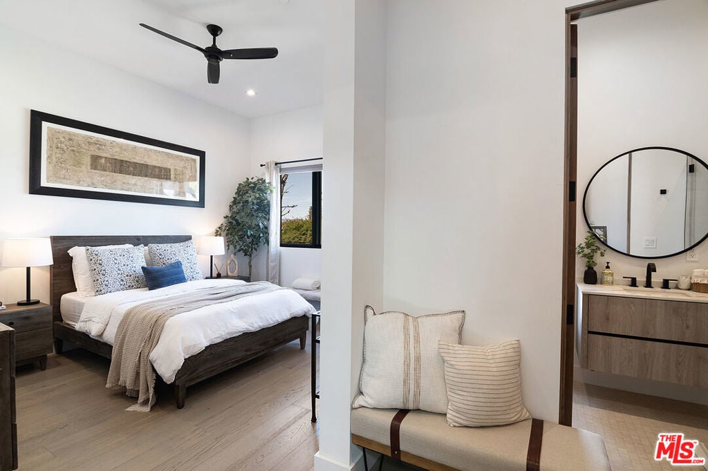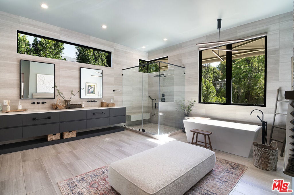 There are homes, and then there are statements. Elevated above the street on a magnificent knoll in the heart of Sherman Oaks, this south-of-the-boulevard modern masterpiece is without question the finest home in the neighborhood and it's not close. From the architecture to the finishes to the upgrades, every detail has been executed at the highest level. This is the one buyers have been waiting for. From the moment you pass through the newly installed secured gated driveway, the experience begins. The property commands attention at every turn, and what awaits inside is nothing short of extraordinary. Step through the front door and the open floor plan takes your breath away soaring ceilings, a formal living room anchored by a floor-to-ceiling marble fireplace, and a striking designer light fixture in the dining area that sets the tone for everything that follows. The staircase alone will stop you in your tracks: all-glass railings with oversized steel rivets form a museum-worthy sculpture that anchors the heart of the home.The chef's kitchen is built for those who love to cook and love to entertain oversized waterfall island, professional-grade stainless appliances, custom cabinetry, and storage that never runs out. A butler's pantry connects the kitchen to the dining room seamlessly, while a full wet bar with flush-mounted wine fridge anchors the opposite side. Sliding Fleetwood glass doors erase the line between indoors and out, opening directly to one of the most impressive backyards in the Valley.Upstairs, four en-suite bedrooms each serve as their own private retreat. The primary suite is in a class of its own a double-sided fireplace warms both the bedroom and the spa-inspired bathroom, creating a true sanctuary at the top of the home.Outside, the resort-style backyard delivers on every level: a zero-edge pool with spa and modern tiled waterfall, a cabana with fireplace and pool-house bathroom, a fully equipped outdoor kitchen, professionally installed turf, lush landscaping, and a plunge sauna. This is not a backyard it's a private retreat you'll never want to leave.Inside, every room has been thoughtfully refined since the original purchase custom wallpaper in the kids' rooms, detailed architectural molding, updated light fixtures and sconces throughout, and rooms repainted in warm greens and blues that give this home a feeling of warmth and livability that newer construction rarely achieves. A brand new AC unit and fully integrated Control 4 smart home system tie it all together.And for those who value privacy and peace of mind, this home delivers at the highest level. Fully gated and secured, it is outfitted with a top-of-the-line, state-of-the-art security system including a front driveway gate, extended side gates with security spikes, 360 hardwired Ring cameras, 8 motion-sensor AJAX cameras covering the full exterior, shatter-proof security film on every downstairs window, and a dedicated safe room. There is simply nothing else on the market that offers this level of protection.This is not the home it was in 2021 it is dramatically better in every way. It shows more beautifully and lives more comfortably. Opportunities like this do not come twice. Don't miss it.