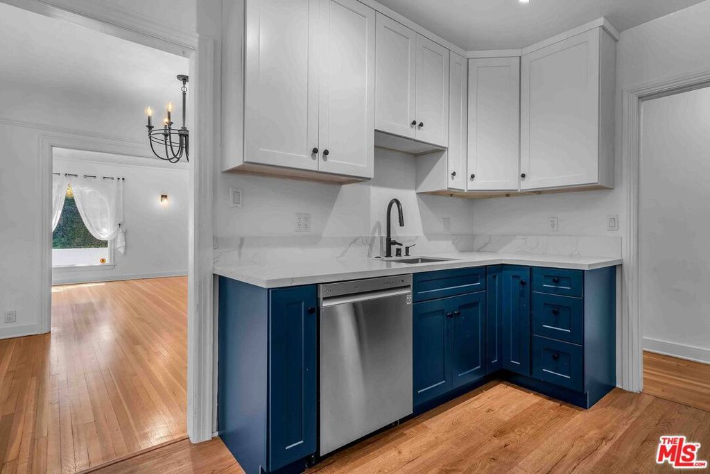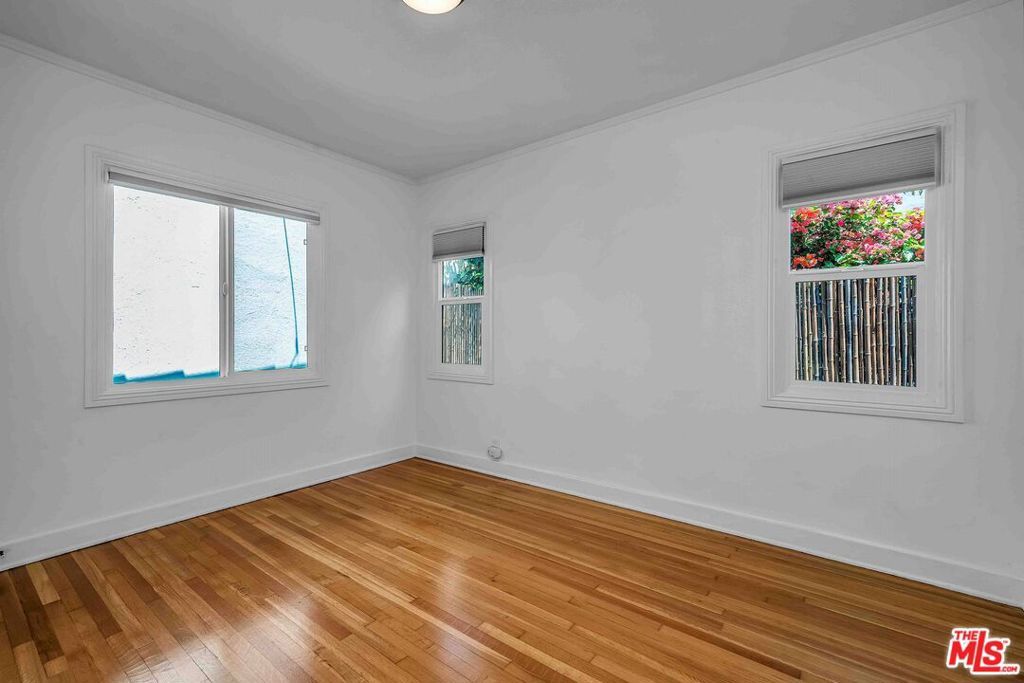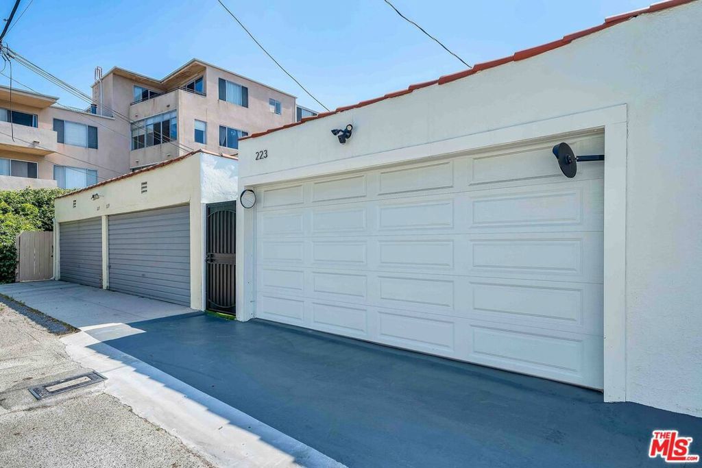 Newly remodeled 2-bedroom, 1.5-bath residence in a prime Beverly Hills location, offered as one of two homes in a charming side-by-side duplex. With its own address, private entrance, and no shared common living spaces, the home offers a rare sense of privacy and a single-family-style living experience in the heart of the city. Surrounded by lush landscaping, the residence features French windows in both the living and dining rooms, a decorative Batchelder fireplace, and expansive living and dining areas highlighted by original oak hardwood floors throughout. The updated kitchen is appointed with new cabinetry, quartz countertops, and stainless-steel appliances, including a range with overhead vent, dishwasher, and refrigerator. The dining room opens to a side yard and provides convenient access to both the front and rear of the property. A private patio with a retractable automated awning creates a welcoming outdoor setting, ideal for morning coffee or relaxed evening entertaining. Additional highlights include central heating and air conditioning, a private laundry room with new washer and dryer, located (reserved exclusively for this residence), plus additional storage space. The property also includes controlled access to a two-car garage with EV charging capability, offering flexibility for parking or potential use as a home office, gym, art studio, or creative workspace.