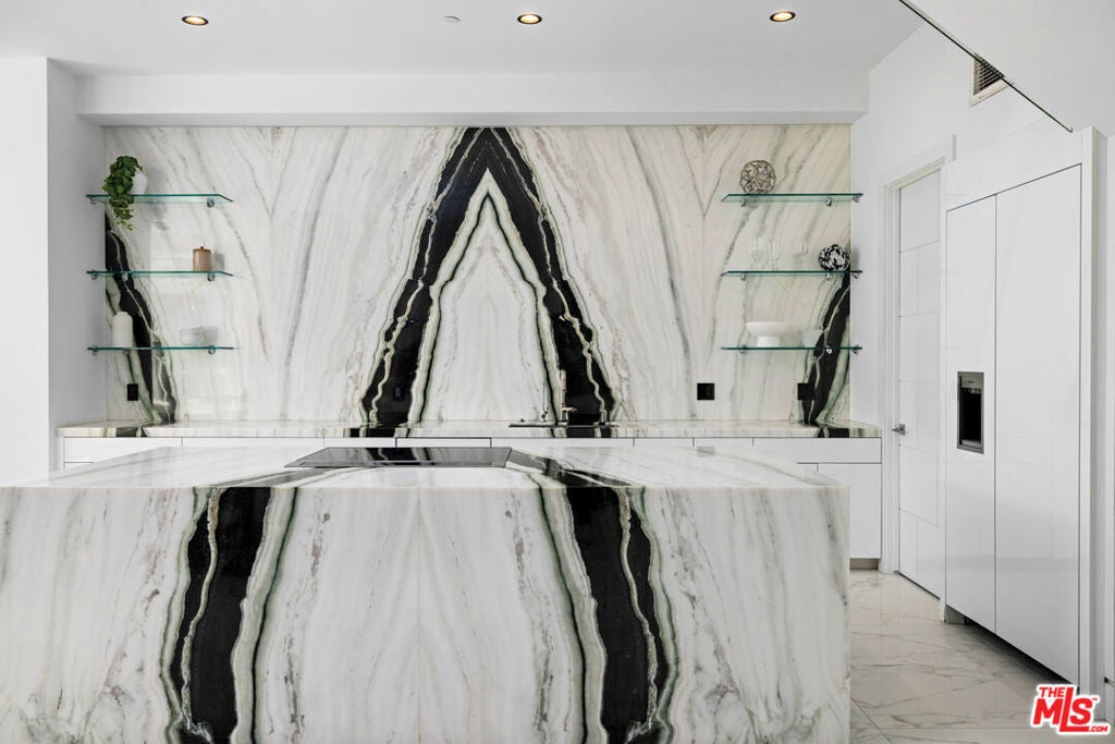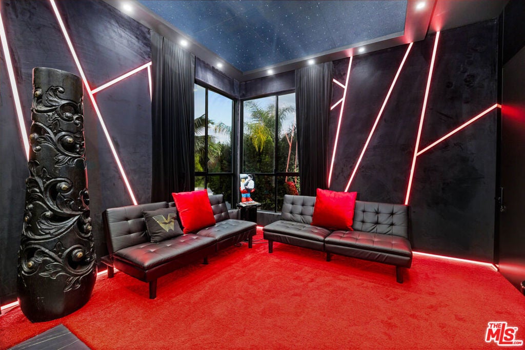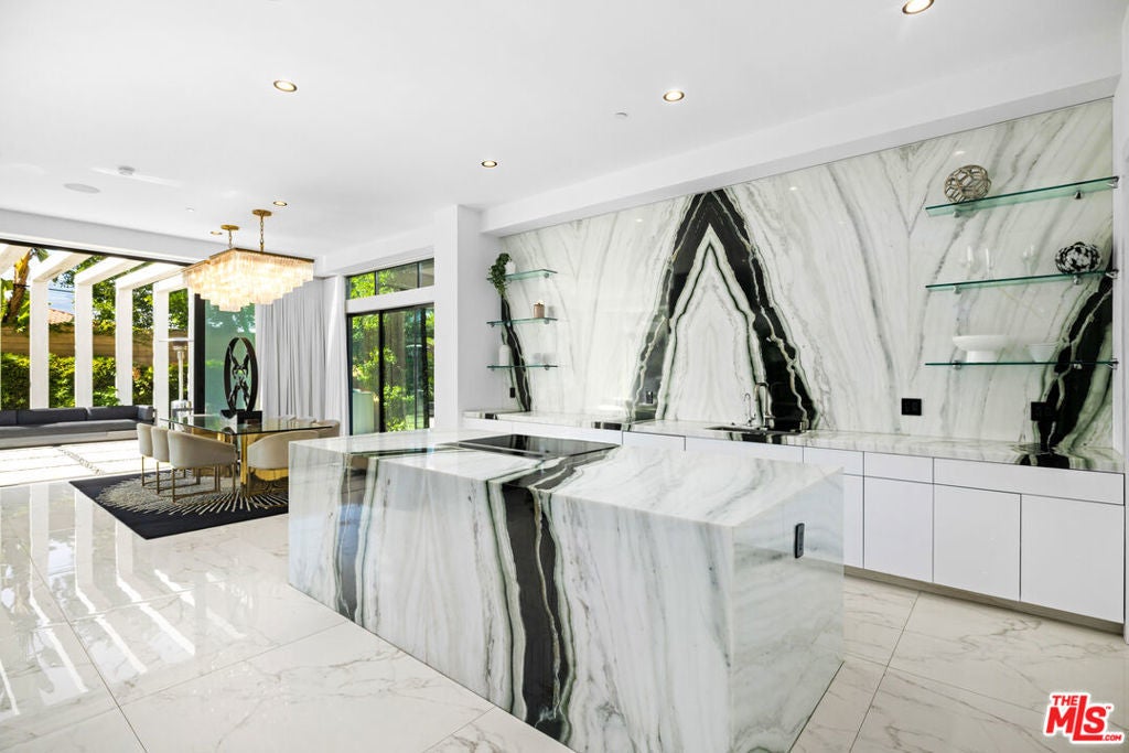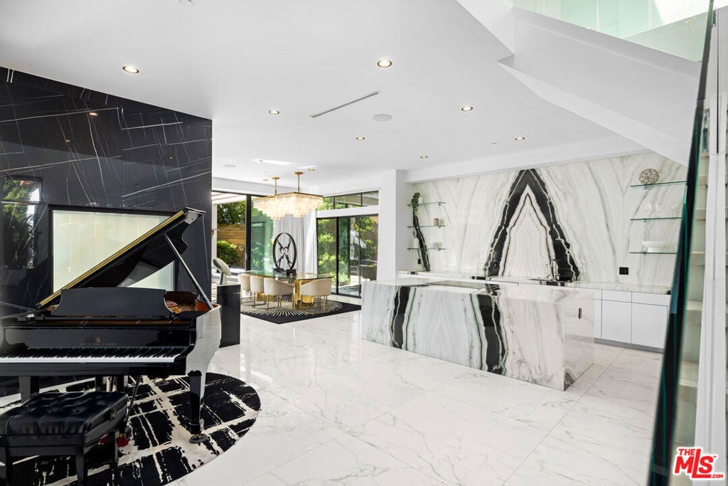 Set behind 10 feet private gates in prime Encino, this bold contemporary estate is designed for those who value space, privacy, and a true entertainer's layout. With three bedrooms all located upstairs and two professional music studios, one downstairs and one upstairs, the home offers a rare blend of creative functionality and modern design. Inside, soaring ceilings and dramatic floor to ceiling shatterproof glass create an immediate sense of scale and light. White oak floors run throughout the open concept layout, connecting the main living areas with effortless flow. The design is clean and striking, yet warm and inviting, ideal for both everyday living and hosting on any scale. The kitchen commands attention with an oversized Calacatta quartz island, custom cabinetry, and appliances, all opening directly to expansive living and dining spaces that overlook the backyard. A statement wood staircase with integrated step lighting leads upstairs, where all four bedrooms are thoughtfully positioned for privacy. The primary suite is both spacious and refined, featuring double door entry, a private balcony, two custom walk in closets, and a spa style bath with a freestanding soaking tub and sleek, modern finishes. The backyard is built for enjoyment, featuring a pool, spa, water feature, generous lawn, BBQ area, and multiple seating and entertaining zones enhanced by full surround sound. Whether hosting large gatherings or enjoying a quiet evening, the outdoor space delivers versatility and impact. With paid off solar, advanced security, gated parking, a two car garage with direct access, basketball half court, EV charger, and ample storage, this home checks every box. Contemporary, private, and thoughtfully designed, this Encino property stands out for its scale, creativity, and lifestyle appeal.