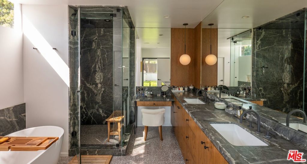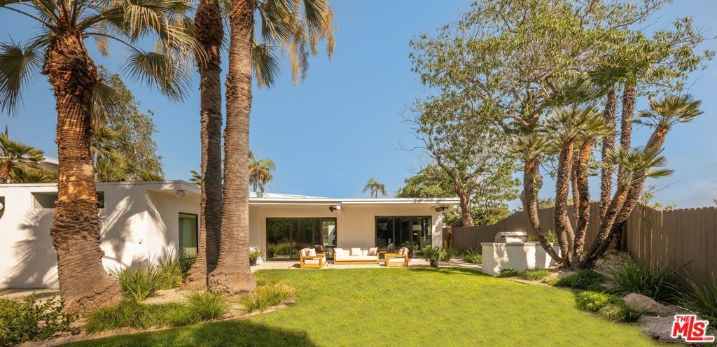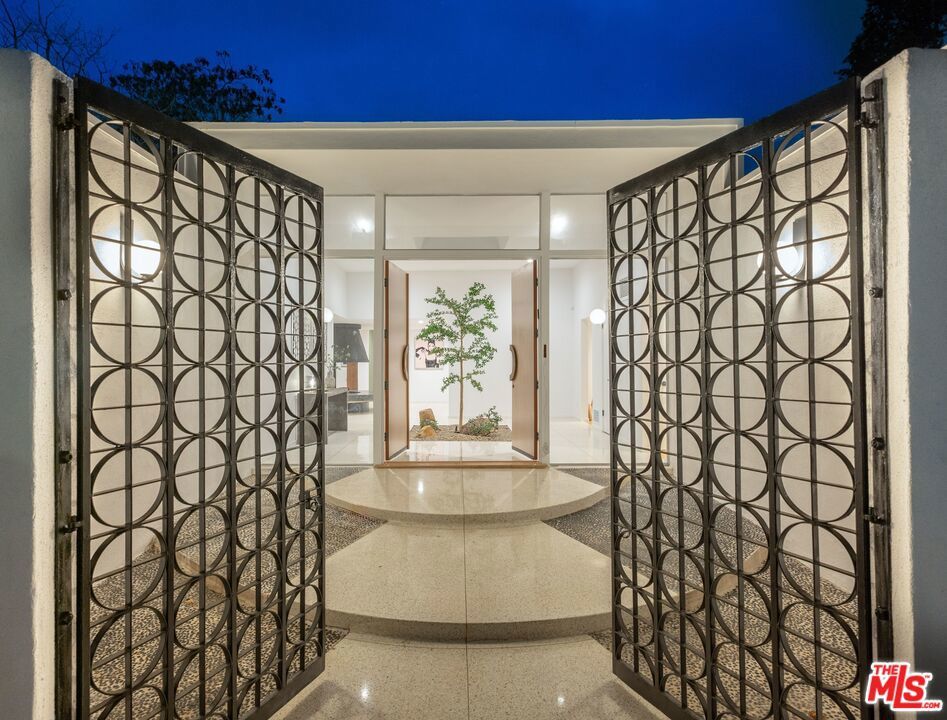 A CLASSIC LA TURN-KEY MID-CENTURY, RIVALING THE TIMELESS APPEAL OF THE ICONIC CASE STUDY HOMES. Set on an expansive three-quarter-acre west-facing lot, the single-story residence seamlessly marries breathtaking canyon views with an effortless indoor-outdoor lifestyle. The home has been thoughtfully reimagined for contemporary living while preserving its authentic mid-century soul. Original brass-bordered terrazzo floors and rich herringbone hardwood create a foundation of timeless elegance, while expansive walls of glass bathe the interiors in natural light and frame serene canyon vistas. A dramatic skylight adds another layer of illumination, and the iconic round black terrazzo fireplace serves as a striking focal point that anchors the living space. Spanning approximately 3,100 square feet, the residence offers four bedrooms and three-and-a-half bathrooms, complemented by thoughtful entertaining spaces. The spacious primary suite features a walk-in closet and a luxurious bathroom with a steam shower, creating a true spa-like retreat. The dining area includes a sleek wet bar perfect for hosting, while the family room showcases custom built-in cabinetry that seamlessly blends form and function. A dedicated game room and spacious mudroom/laundry complete the interior layout. The outdoor spaces are equally impressive, featuring a resort-style pool and spa, professional BBQ area, and expansive flat grassy yard - all designed for both intimate gatherings and grand-scale entertaining. A two-car garage with direct access and a circular motor court with ample parking. This is a rare, turnkey offering in prime Bel Air - an architectural gem where classic mid-century design meets modern luxury in a truly exceptional canyon setting.