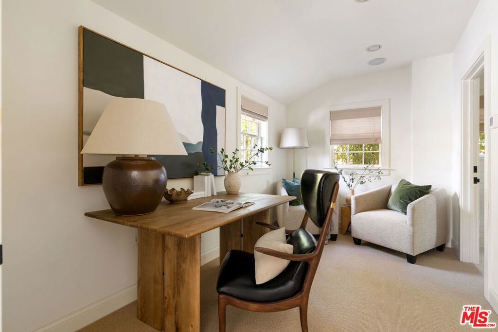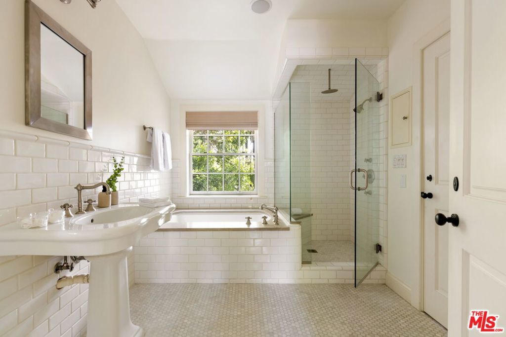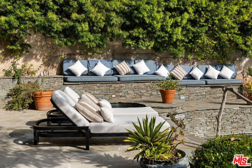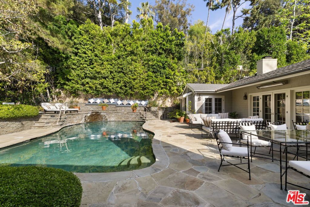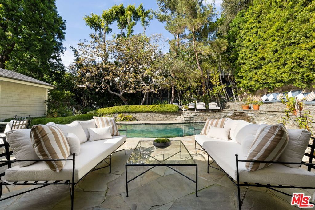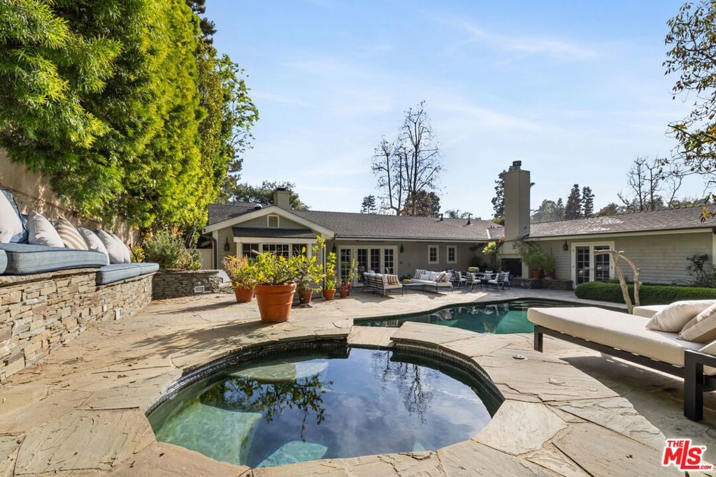 Set behind gates on a rare, expansive flat lot north of Sunset, this romantic East Coast Traditional offers privacy, charm, and timeless appeal in one of Brentwood's most coveted settings. A gated driveway and two motor courts provide abundant off-street parking and lead to a generous two-car garage, while a charming gravel path welcomes you to the formal entry. Designed for elegant living and effortless indoor-outdoor entertaining, the home features a gracious living room with fireplace and a formal dining room, both opening through French doors to lush grounds with mature trees, gardens, a sparkling pool and spa, and multiple patios. Updated throughout, the residence includes a spacious chef's kitchen with top-of-the-line appliances overlooking a large family room. The main level offers four bedrooms, including staff quarters, and 5.5 baths. The primary suite features dual baths, dual closets, and a sitting area, while two additional bedrooms occupy a private wing. Upstairs, a second primary suite currently configured as a media or family room includes its own bath and adjoining office. Ideally located near Brentwood Village, the shops and restaurants along San Vicente, top schools, and convenient access to the 405, this warm and inviting home presents a rare opportunity to enjoy classic architecture and serene surroundings in one of the Westside's most desirable neighborhoods.
