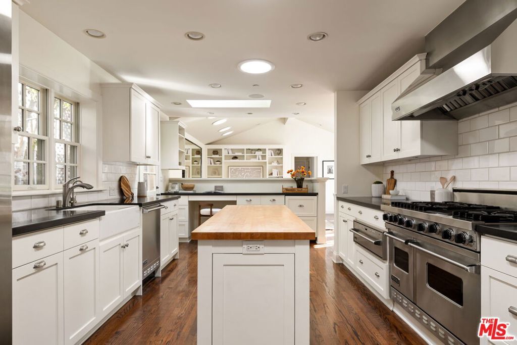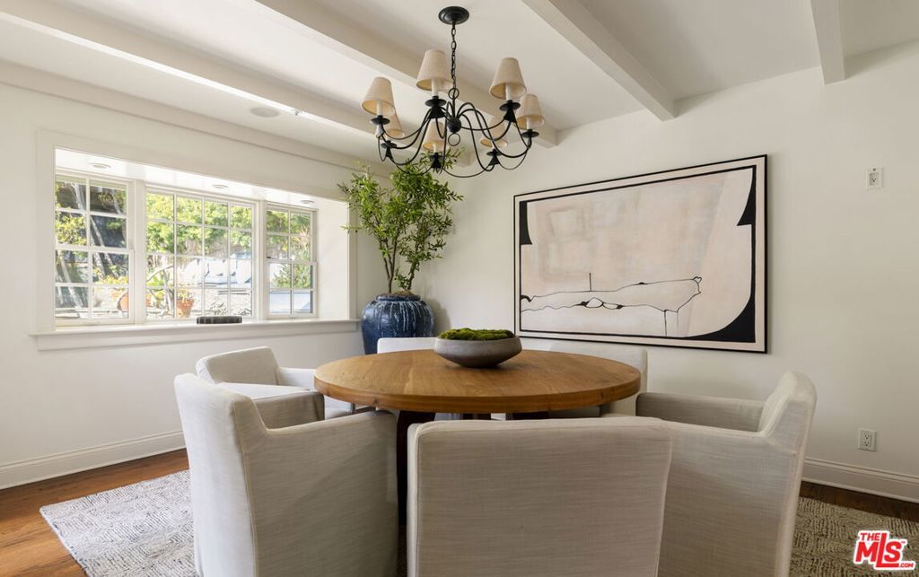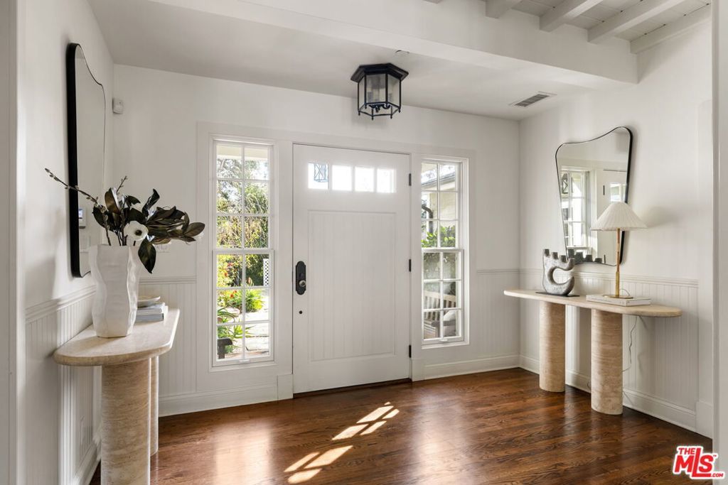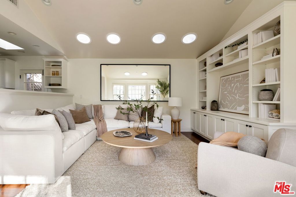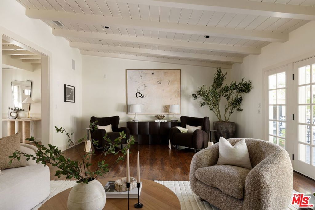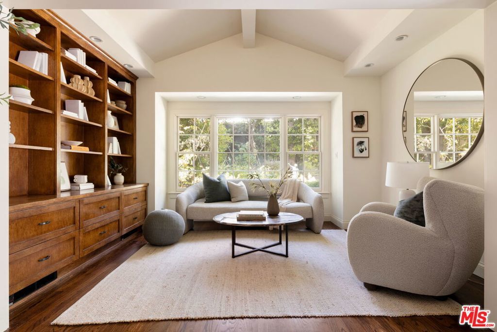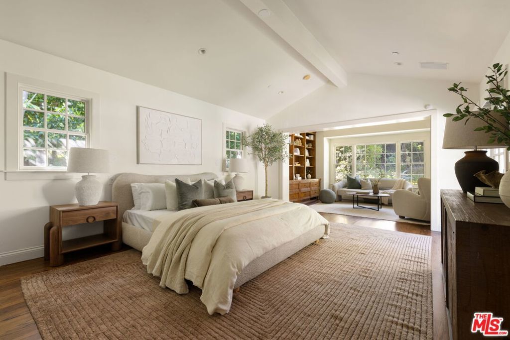 Set behind gates on a rare, expansive flat lot north of Sunset, this romantic East Coast Traditional offers privacy, charm, and timeless appeal in one of Brentwood's most coveted settings. A gated driveway and two motor courts provide abundant off-street parking and lead to a generous two-car garage, while a charming gravel path welcomes you to the formal entry. Designed for elegant living and effortless indoor-outdoor entertaining, the home features a gracious living room with fireplace and a formal dining room, both opening through French doors to lush grounds with mature trees, gardens, a sparkling pool and spa, and multiple patios. Updated throughout, the residence includes a spacious chef's kitchen with top-of-the-line appliances overlooking a large family room. The main level offers four bedrooms, including staff quarters, and 5.5 baths. The primary suite features dual baths, dual closets, and a sitting area, while two additional bedrooms occupy a private wing. Upstairs, a second primary suite currently configured as a media or family room includes its own bath and adjoining office. Ideally located near Brentwood Village, the shops and restaurants along San Vicente, top schools, and convenient access to the 405, this warm and inviting home presents a rare opportunity to enjoy classic architecture and serene surroundings in one of the Westside's most desirable neighborhoods.