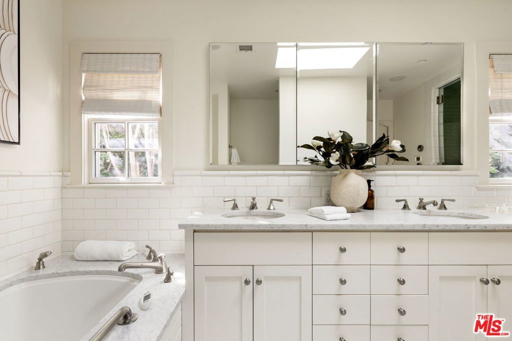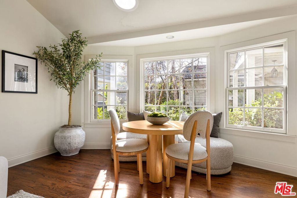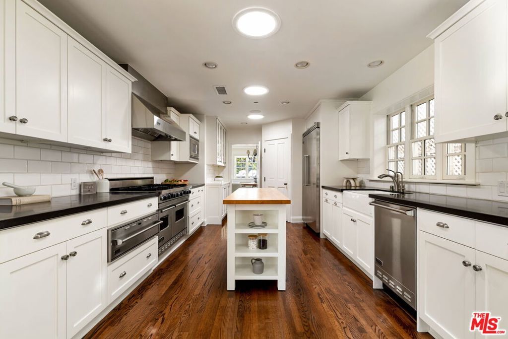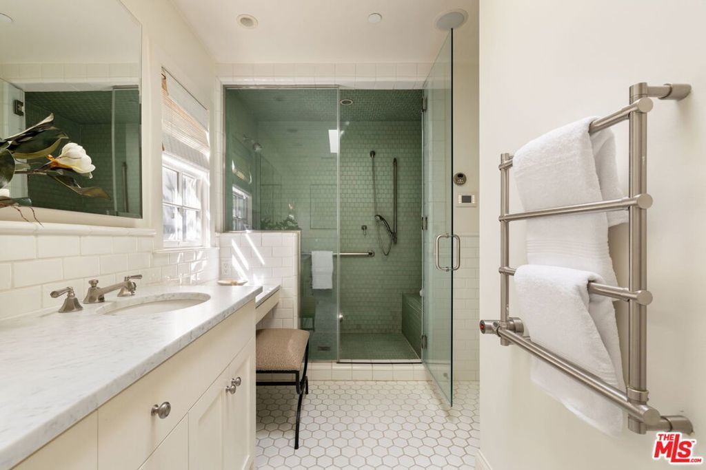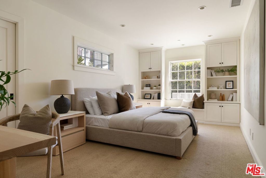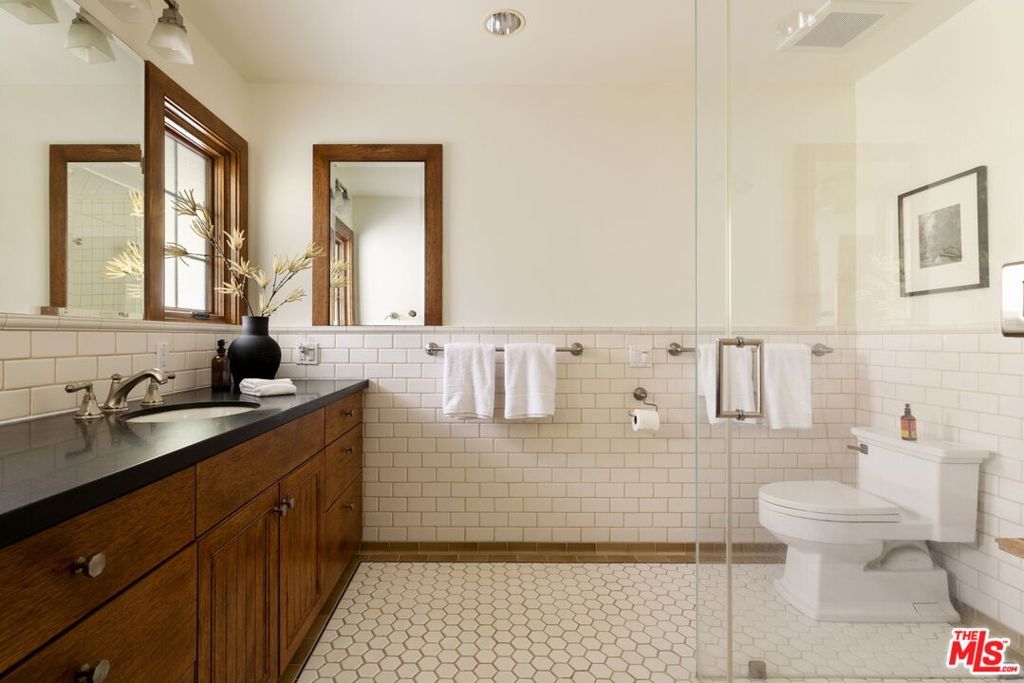 Set behind gates on a rare, expansive flat lot north of Sunset, this romantic East Coast Traditional offers privacy, charm, and timeless appeal in one of Brentwood's most coveted settings. A gated driveway and two motor courts provide abundant off-street parking and lead to a generous two-car garage, while a charming gravel path welcomes you to the formal entry. Designed for elegant living and effortless indoor-outdoor entertaining, the home features a gracious living room with fireplace and a formal dining room, both opening through French doors to lush grounds with mature trees, gardens, a sparkling pool and spa, and multiple patios. Updated throughout, the residence includes a spacious chef's kitchen with top-of-the-line appliances overlooking a large family room. The main level offers four bedrooms, including staff quarters, and 5.5 baths. The primary suite features dual baths, dual closets, and a sitting area, while two additional bedrooms occupy a private wing. Upstairs, a second primary suite currently configured as a media or family room includes its own bath and adjoining office. Ideally located near Brentwood Village, the shops and restaurants along San Vicente, top schools, and convenient access to the 405, this warm and inviting home presents a rare opportunity to enjoy classic architecture and serene surroundings in one of the Westside's most desirable neighborhoods.