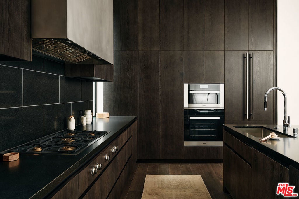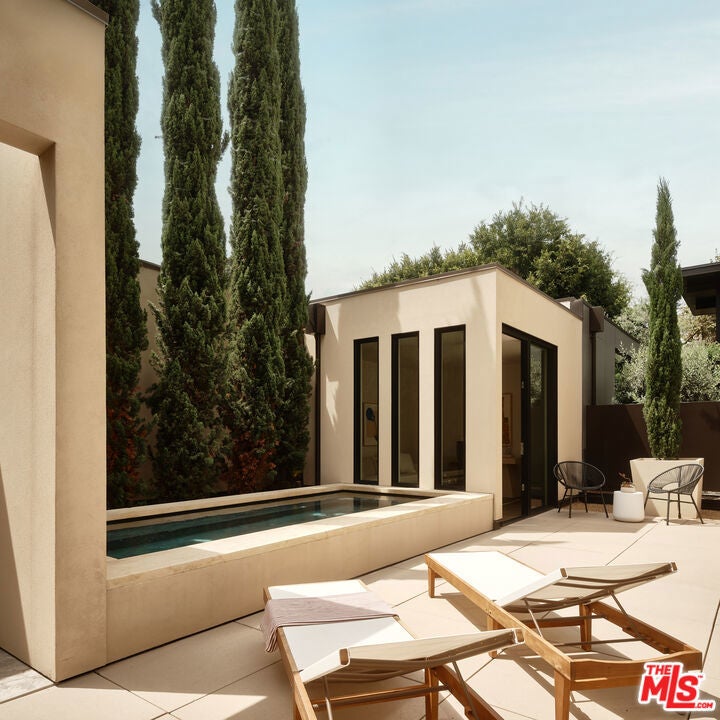 Brick House by Olson Kundig at 8899 Beverly | This distinctive architectural residence combines the privacy of a single-family home with the services of a luxury building in the heart of West Hollywood. One of only eight signature houses within the development, Brick House celebrates the warmth and texture of clay-fired brick through Olson Kundig's expressive material design, giving the home its unmistakable personality and mid-century spirit.The residence offers three bedrooms and two and a half bathrooms. A brick-surrounded fireplace anchors the living room, while Fleetwood doors open wide to the sunny private courtyard for effortless indoor-outdoor living. The kitchen features an oversized island with ample room for meal preparation and casual dining. Interior finishes include dark-stained quarter-sawn walnut casework and wood flooring throughout.Upstairs, the primary suite opens to a private balcony with views of the Hollywood Hills and includes a walk-in closet and spa-like ensuite bathroom.The sunny Mediterranean-inspired courtyard is centered around an oversized outdoor spa framed by sandstone pavers and cypress trees. A detached studio on one side of the courtyard offers a peaceful retreat-ideal for an office, meditation room, home gym, or artist studio- while the opposite side includes an outdoor shower and enclosed powder room. Among the most character-driven homes in the collection, Brick House offers the privacy of a detached architectural residence paired with the convenience and services of a full-service building. Located in one of West Hollywood's most walkable neighborhoods. As part of the Olson Kundig-designed 8899 Beverly development, homeowners enjoy access to 24-hour concierge and property management services, a state-of-the-art fitness center, and a landscaped amenity deck with resort-style pool and spa and a custom outdoor kitchen. One of the final remaining homes available in the development, Brick House offers a rare opportunity to own a fully private, architecturally significant residence with the services and amenities of a world-class enclave.