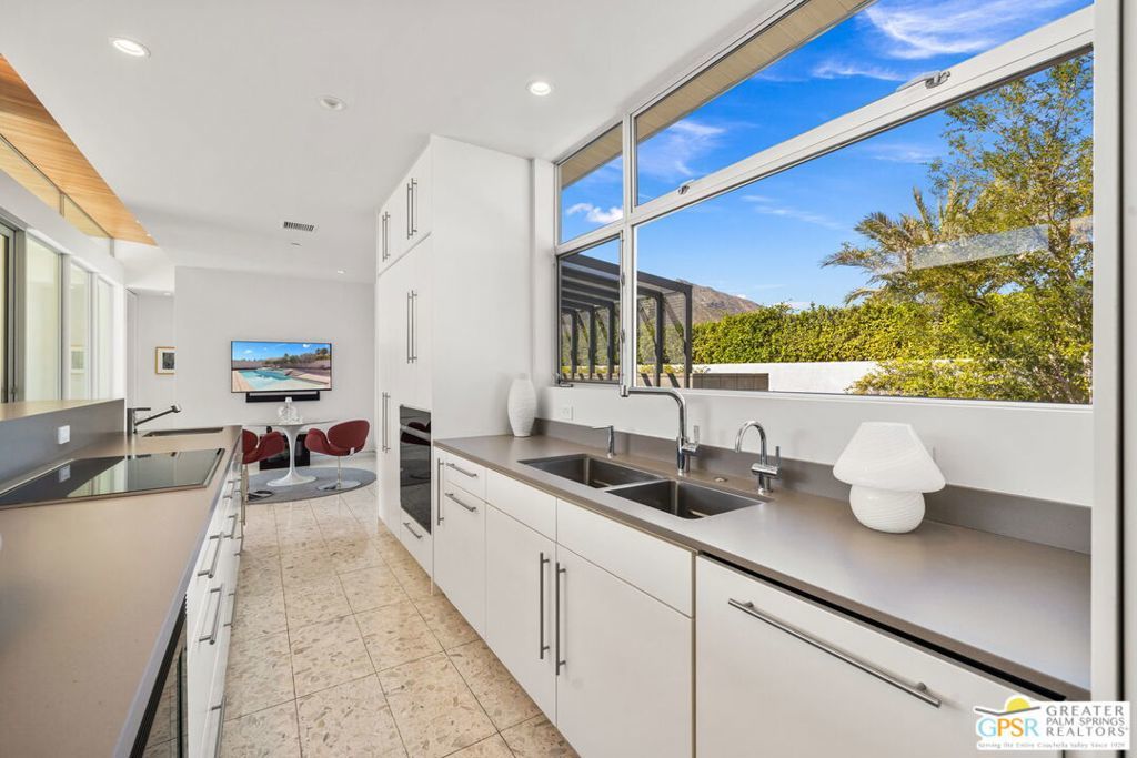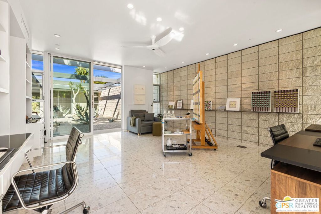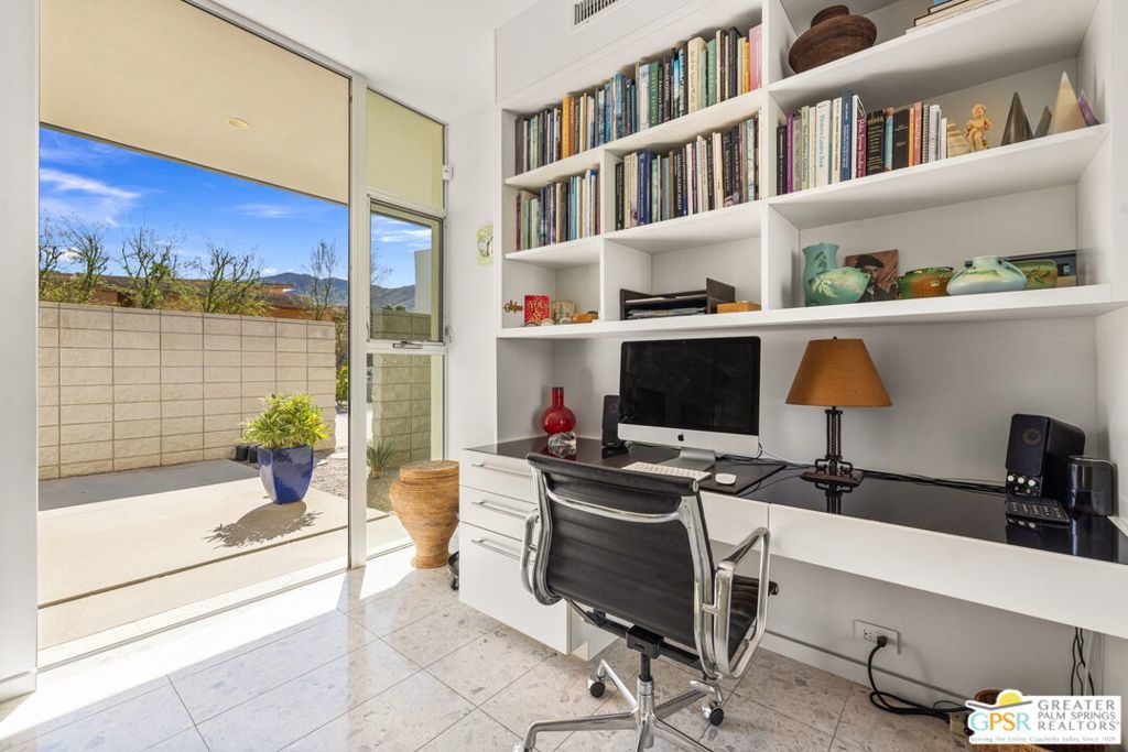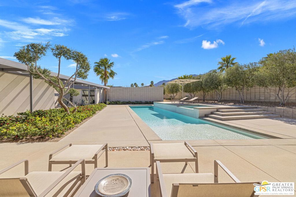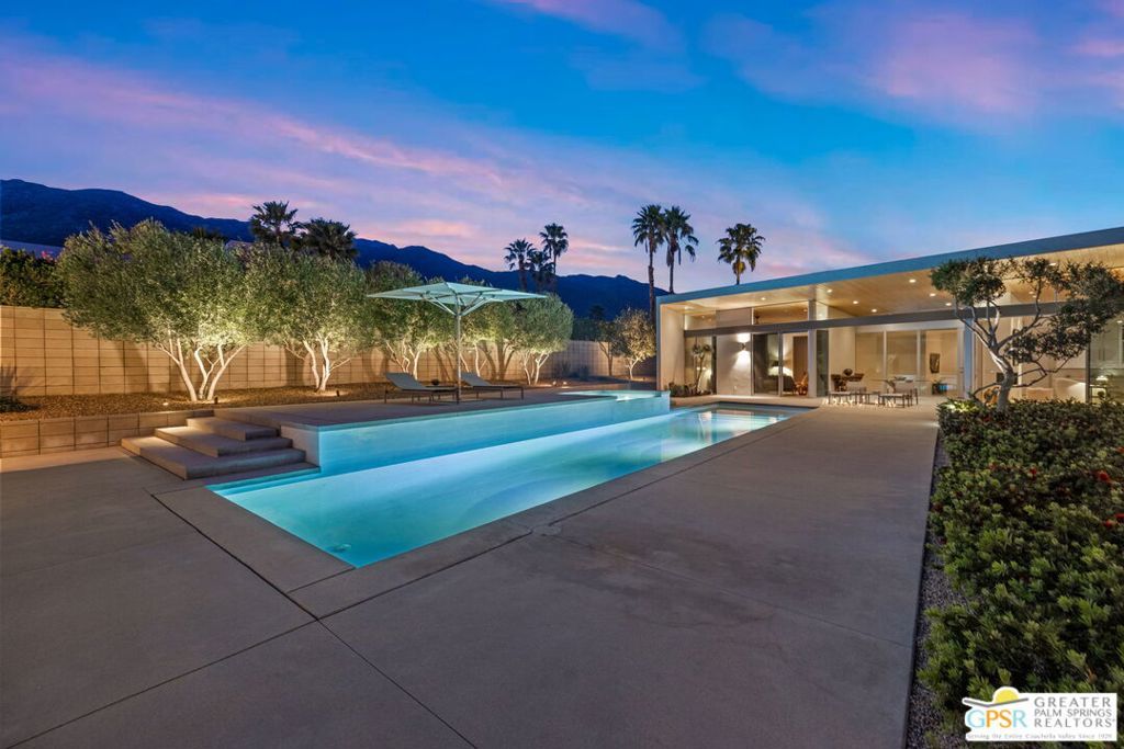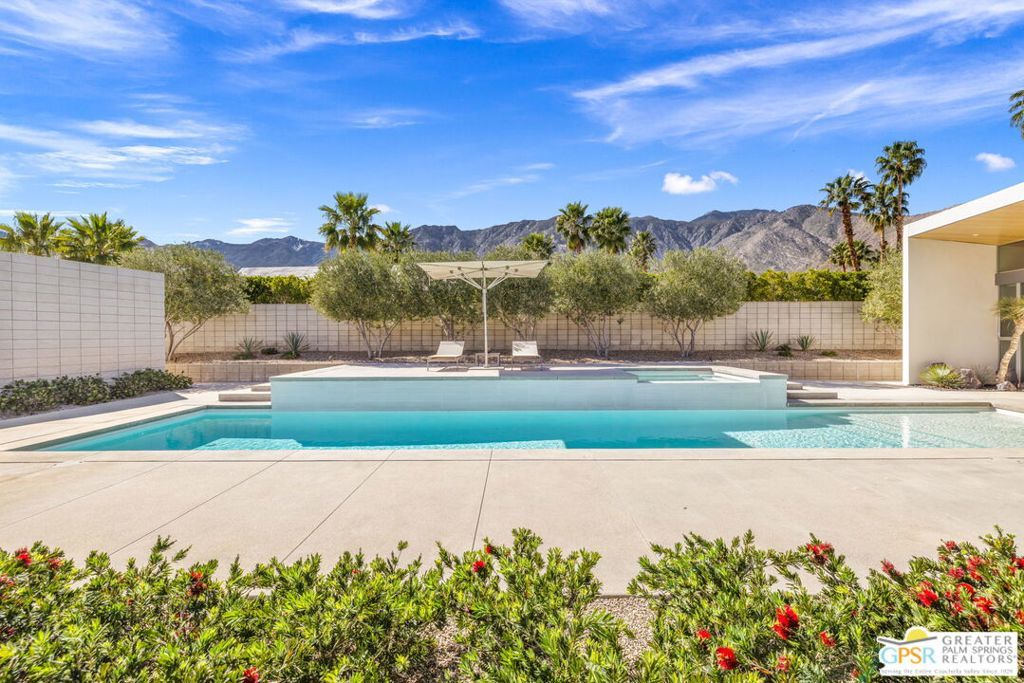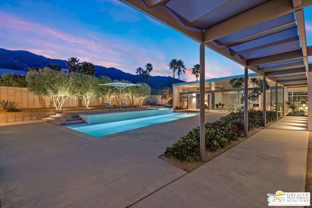 A bold expression of modern desert architecture, this striking estate designed by award-winning architect Lance O'Donnell stands as a masterwork of design, light, and landscape framed by sweeping 360-degree mountain views in every direction. Completed in 2017, the residence is a study in precision and intention, where materials, orientation, and environment converge to create a home that is as intelligent as it is beautiful. From the moment of arrival, the architecture makes a statement. A facade of split-face concrete block and Corten steel introduces a palette that is both grounded and sculptural, setting the tone for interiors that unfold with clarity and purpose. Terrazzo floors run seamlessly throughout, while expansive walls of glass dissolve the boundary between indoors and out, capturing the changing light of the desert from sunrise to sunset. The home is thoughtfully composed as a private compound, offering a 2-bedroom, 2.5-bath main residence alongside a detached 1 bedroom, 1 bath guest house - ideal for hosting while maintaining a sense of retreat. The floor plan is carefully calibrated to the path of the sun, maximizing natural light in winter and minimizing heat in summer, a subtle yet powerful expression of architectural intelligence. At the heart of the home, the kitchen is both refined and functional, featuring Sub-Zero and Wolf appliances, induction cooking, and a generous walk-in pantry - all opening to living and dining spaces that flow effortlessly to the courtyard beyond. Outdoor living becomes an immersive experience. A private interior courtyard anchors the home, centered around a saltwater pool and spa, fire feature, and multiple gathering areas framed by mature landscaping and uninterrupted mountain views. This is a setting designed not just for entertaining, but for living in rhythm with the desert. Equally impressive is the home's performance. Dual solar arrays, advanced water filtration, four-zone climate control, UV-protected glazing, motorized shading, and fully integrated smart systems deliver a level of efficiency and control that matches the home's architectural pedigree. Gated and private, with dual driveways, a two-car garage, and additional covered parking, the property offers both presence and practicality. Architectural, intentional, and quietly extraordinary. This is not simply a home, but a modern desert statement.