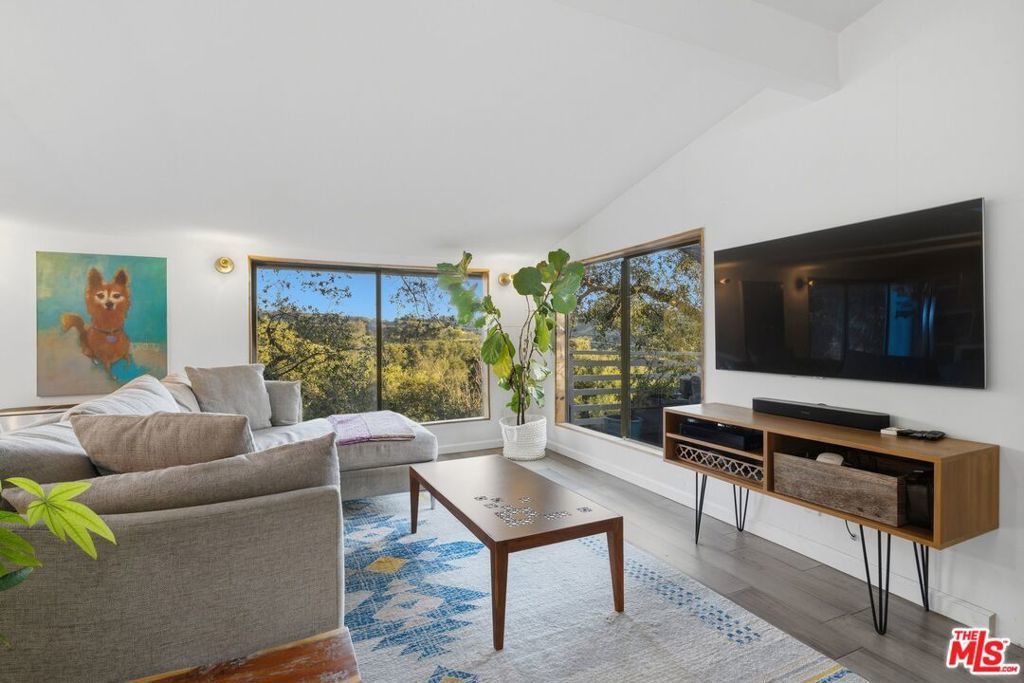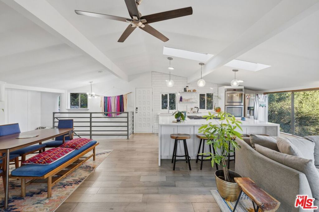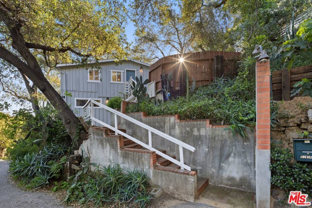 Rebuilt from the ground up with permits in 2017, this Topanga Canyon home blends the character of its 1925 roots with the comfort of a thoughtfully modernized retreat. The result is a serene, light-filled home with sweeping cross-canyon views, an open floor plan, and a connection to the outdoors that defines life in the canyon. Inside, skylights and large windows flood the main living areas with natural light throughout the day while framing panoramic cross-canyon views from multiple vantage points. The open floor plan connects living spaces effortlessly, and the main level includes a beautifully updated full bathroom with a soaking tub. Outdoor living is a natural extension of the home, with a large deck featuring multiple dedicated seating areas that open directly off the main living space. Before you even step inside, a waterfall fountain and the home's historic entry steps set the tone for everything that follows. The lower level houses all three bedrooms and a second full bathroom, each with its own separate exterior access ideal for guests, family, or simply moving through daily life on your own terms. Bonus spaces include a dedicated yoga and meditation studio toward the rear of the property, a quiet, purposeful room grounded in the natural environment surrounding it, and a generously sized, secure, dry storage room tucked beneath the house. Trail access begins at the property line, opening into some of the finest hiking and trail running in the region. Topanga State Park and the Santa Monica Mountains National Recreation Area offer miles of oak woodland, chaparral, and open meadow, with views stretching from the peaks to the sea. Nearby creek access adds swimming holes, birding spots, and quiet places to simply sit and listen. Tucked between the mountains and minutes from Woodland Hills and Pacific Coast Highway, Topanga is one of the last true communities in Los Angeles County where people know each other, show up for each other, and choose to stay from the Sunday farmers market to the trails just outside your door. Thoughtfully rebuilt, carefully maintained, and entirely specific to the life that draws people here. Those who find this place rarely want to leave.