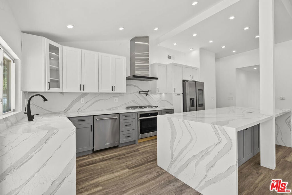 Located south of the boulevard in Woodland Hills, this remodeled home offers 3 bedrooms and 2.5 bathrooms with a functional open floor plan. The interior features wide-plank flooring, recessed lighting, and a modern kitchen equipped with quartz countertops, custom cabinetry, a center island, and stainless steel appliances. The backyard features a private pool, patio, and landscaped surroundings that provide a dedicated outdoor space. The layout includes a primary suite, two additional bedrooms, and updated bathrooms with contemporary finishes. The property is situated minutes from Ventura Boulevard, with access to nearby shopping, dining, and local amenities.