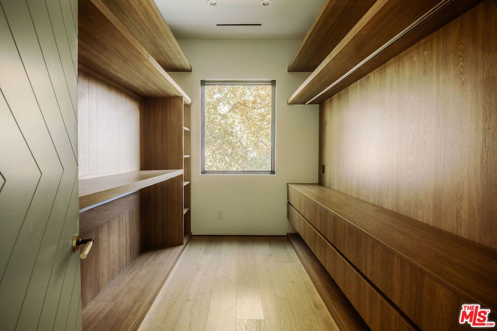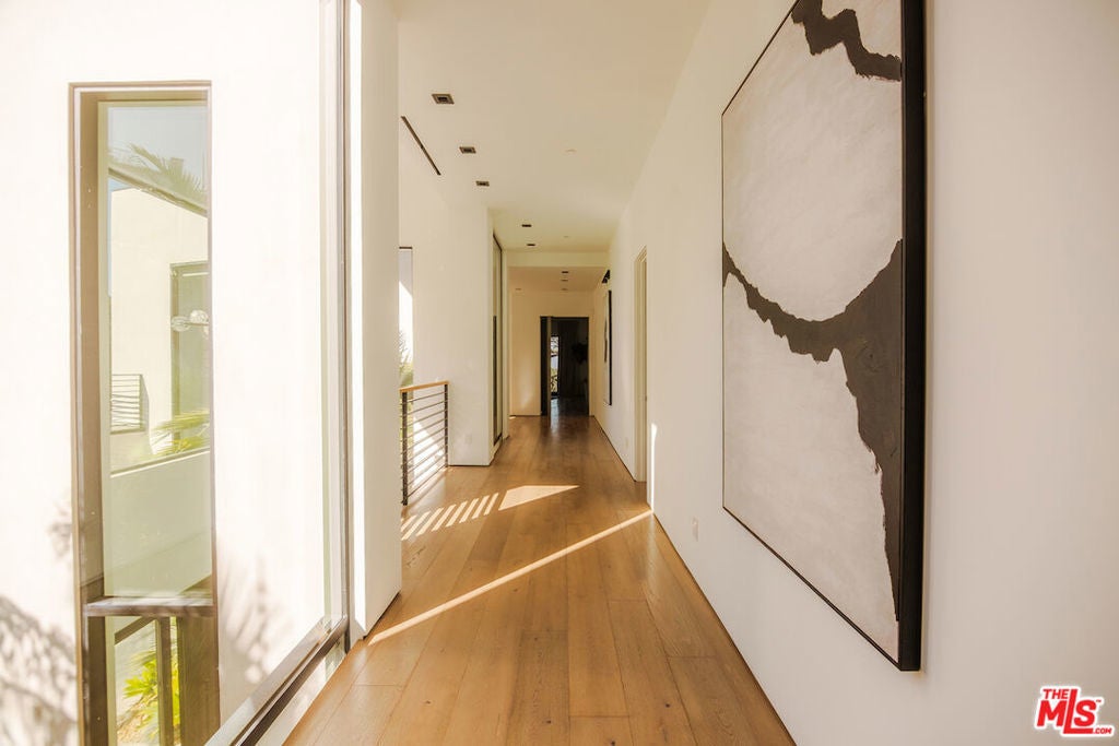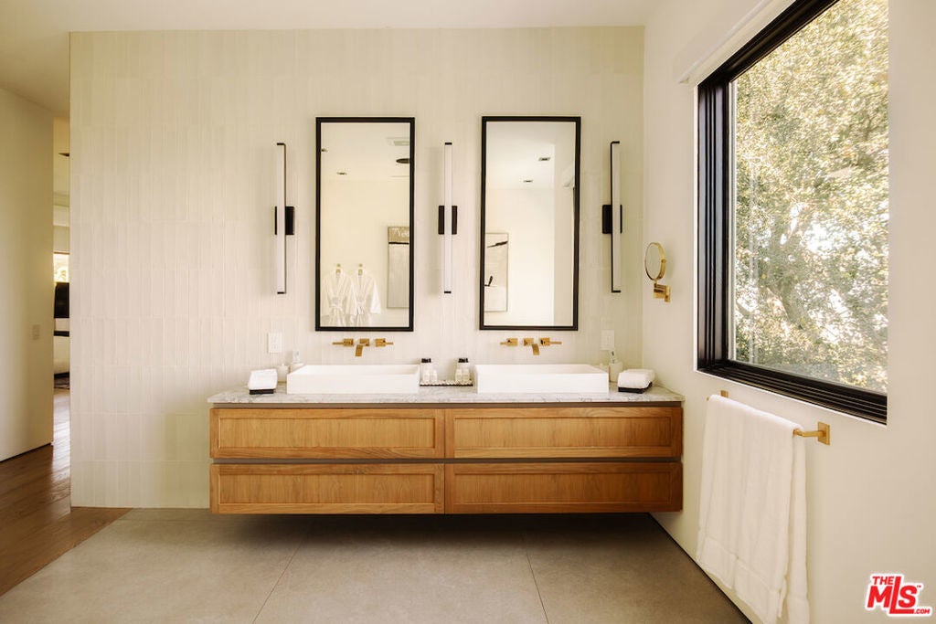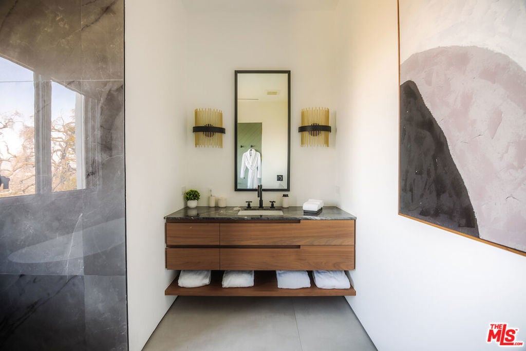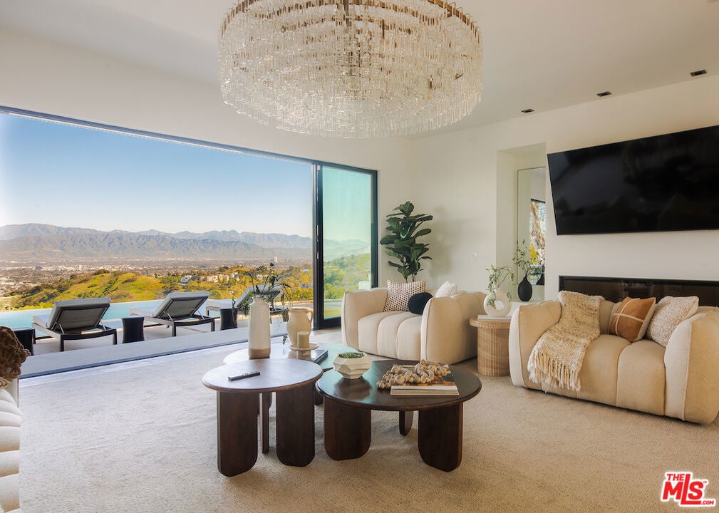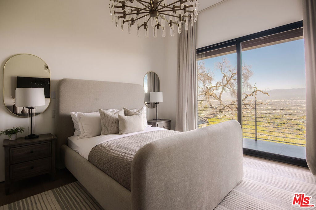 An unparalleled retreat offering complete privacy along Mulholland Drive. A private driveway leads into the secure, one-of-a-kind, gated compound with breathtaking 220-degree views, ensuring seclusion, splendor, and exclusivity. The home features 6 bedrooms, 6 bathrooms, and timeless sophistication. Upon arrival at the gated motor court, a striking waterfall greets you, accompanied by a double and single garage and additional parking. Entering through a pivot door, every room opens into expansive views. The main floor is designed for entertaining, offering formal and casual living spaces, a dining room, and an en-suite bedroom with European oak floors throughout. The kitchen embodies refined elegance, featuring bleached walnut and elephant grey paneling, a 36-inch sink, Thermador and Wolf appliances, two dishwashers, a dual-zone wine fridge, and a spacious hidden walk-in pantry. The upper floor, accessible from east and west wing staircases, includes the spacious primary suite, 3 additional en-suite bedrooms, an office, and a laundry room. The primary suite boasts two expansive walnut-clad walk-in closets, a luxurious bathroom with leathered marble finishes, and a private living area with wrap-around balconies. The outdoor spaces are highlighted by an infinity pool, a large grassy al fresco dining area, and mature oak trees that frame the panoramic views, harmonizing the home with its natural surroundings. This residence epitomizes privacy, natural beauty, and impeccable design.