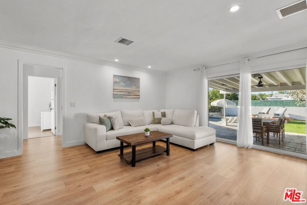 Newly renovated single-level pool home in prime Woodland Hills, adjacent to coveted Walnut Acres and zoned to top-rated charter schools: Welby Way Charter Elementary, Hale Charter Academy, and El Camino Real Charter High School. This beautifully updated 4-bedroom, 3-bathroom home offers approximately 1,845 sq ft of thoughtfully designed living space with an open-concept layout filled with natural light. Enter through the oversized modern pivot door into a dramatic foyer with soaring ceilings that lead to the spacious living and dining areas. The updated kitchen features white shaker cabinetry, stainless steel appliances, and a large center island, opening to the great room with a modern fireplace and stacked-stone media wall. Sliding doors lead to the private resort-style backyard. Completed in 2023, the backyard features a sleek modern pool and spa with Baja shelf, UV filtration system, and turf lawn ideal for relaxing or entertaining. The primary suite offers a walk-in closet and spa-inspired bath with a floating dual-sink vanity and walk-in shower. Three additional bedrooms provide flexible space for family, guests, or a home office. Additional highlights include updated HVAC, upgraded electrical panel, improved insulation, and luxury flooring throughout. Conveniently located near The Village at Westfield Topanga, Westfield Topanga Mall, scenic hiking trails, the Rams Training Facility, and Calabasas Commons.