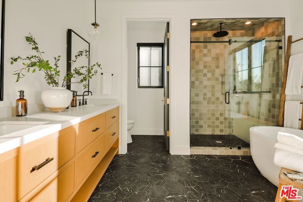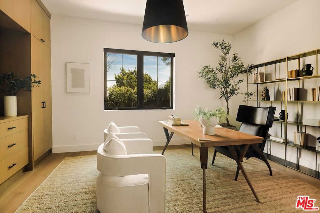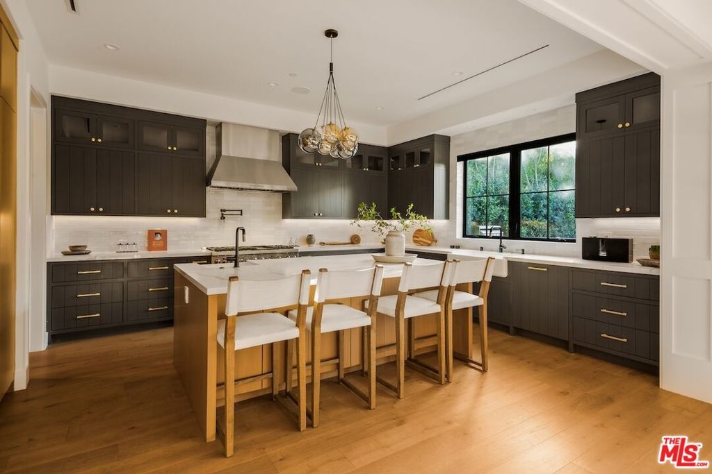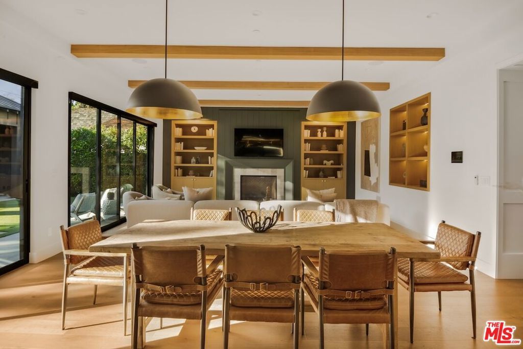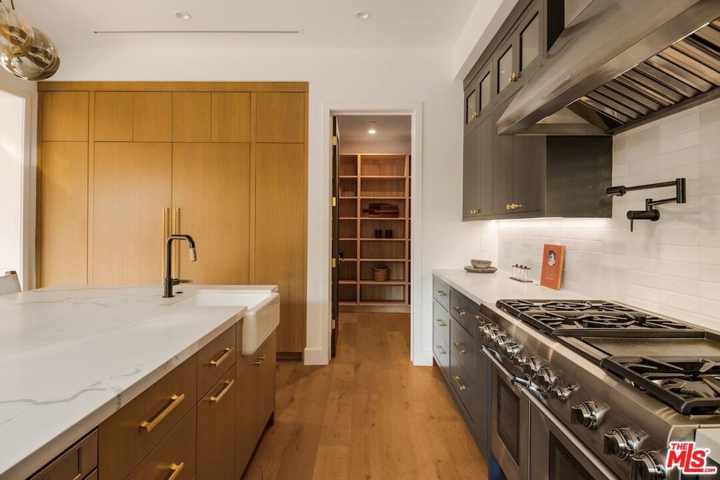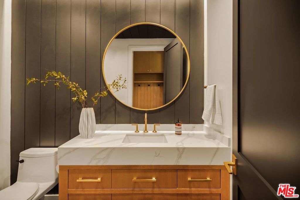 Private and gated in the desirable West Toluca Lake enclave and adjacent to Studio City, this exceptional modern farmhouse by Core Homes blends timeless craftsmanship with elevated California living. The home offers both tranquillity and convenience in one of L.A.'s most coveted pockets. Designed with meticulous attention to detail, the smart home features wide-plank wood flooring, a full Control4 system, handcrafted millwork, custom shelving, and designer lighting throughout. The gourmet chef's kitchen is the heart of the home, showcasing a seated island with dramatic quartz waterfall countertops, wine storage, premium Thermador appliances, dual farmhouse sinks, and a generous walk-in pantry. The open-concept living and dining spaces are anchored by a statement fireplace and framed by expansive floor-to-ceiling windows that open seamlessly to the sun-drenched backyard, creating the ultimate indoor-outdoor lifestyle. The main level also includes a private ensuite bedroom currently styled as an office, along with a powder room and an oversized laundry room with abundant storage. Upstairs, the impressive primary suite features vaulted ceilings, a large private balcony, dual walk-in closets, and a spa-inspired bath with soaking tub and oversized shower. Secondary bedrooms are equally well-appointed, each filled with natural light and offering ensuite bathrooms and ample closet space. Designed for effortless entertaining, the resort-style backyard features a sparkling pool and spa with a Baja shelf, mature landscaping, an outdoor kitchen, dining area, and a cabana complete with its own pool bath, along with an outdoor shower. Conveniently located by Easy Street Burgers, VERSE Speak Easy and Ca de Sole for effortless dining and entertainment.