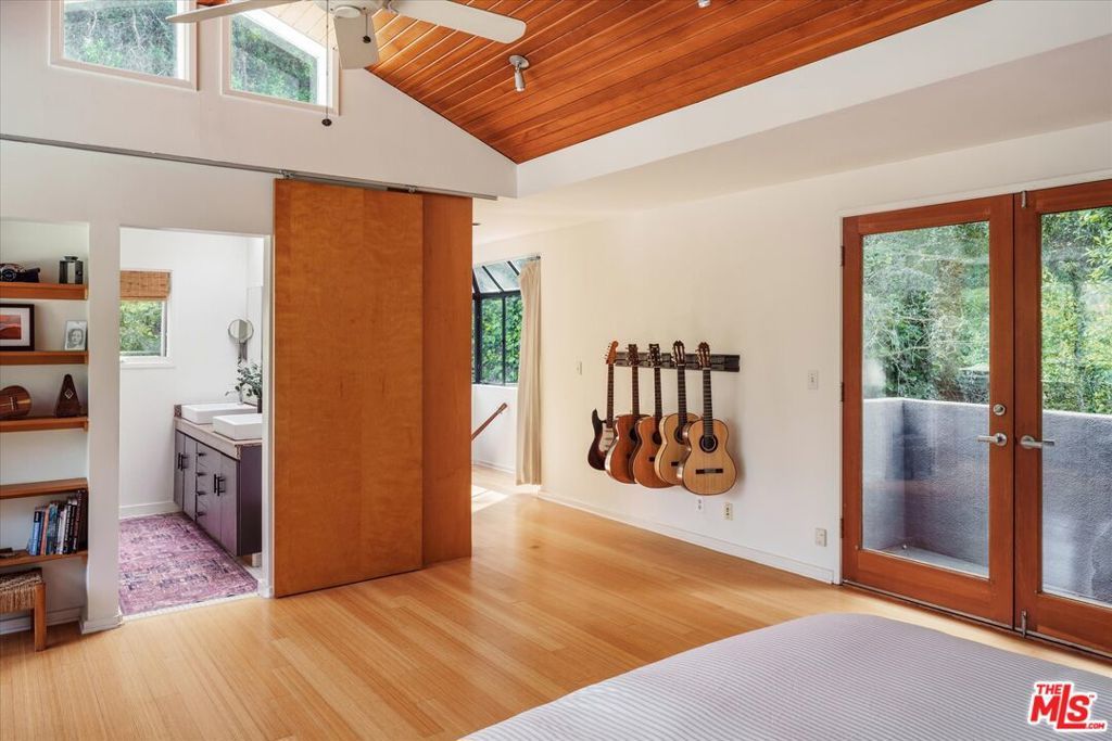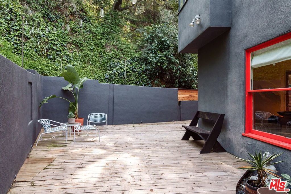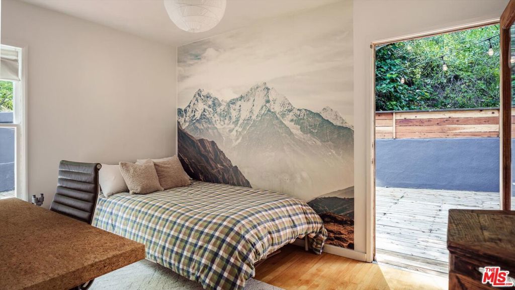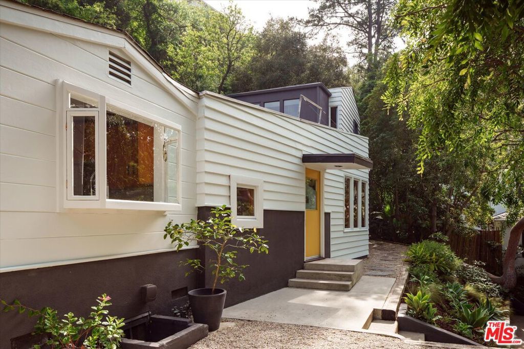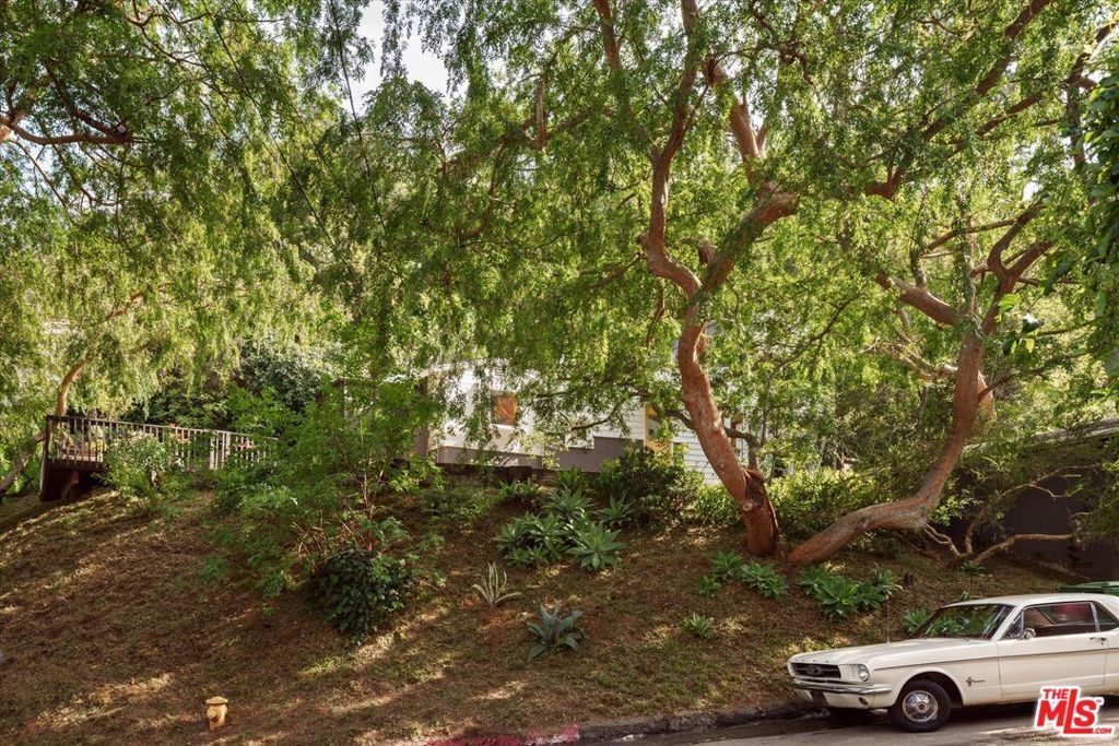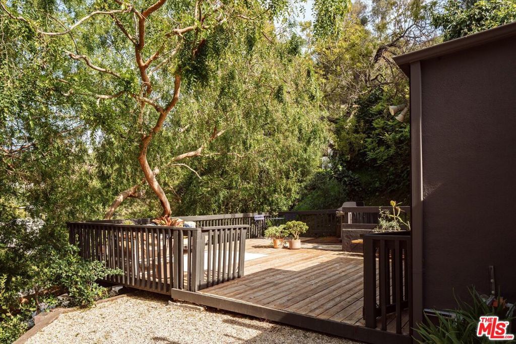 Perched above the street and screened by mature foliage, this mid-century Laurel Canyon treehouse is a peaceful retreat where architecture and nature meet. Built for inspiration, tucked away from view yet moments from the pulse of the city, the design nods to classic mid-century design with subtle aesthetic touches reminiscent of Frank Gehry - skylights, warm natural materials, and light that shifts beautifully throughout the day - creating a seamless connection between indoors and the surrounding canyon landscape. Inside, the house offers three bedrooms and two baths, thoughtfully arranged for easy living - lovely flow of airy common spaces, with 2 bedrooms on the main level and the primary suite and sunroom occupying the entire upper floor. Outside, on an over 9000sf lot, the generous and expansive deck and yard areas are ideal for morning coffee, dinners al fresco, play and rest. From every vantage point, you see layers of green and sky - offering privacy, calm, and inspiration. This is more than a home, it's a creative haven, a peaceful escape, and a rare opportunity to live immersed in the beauty, spirit and wonder of the canyon. There is a detached 2 car garage on street level and ample street parking. Wonderland School District.