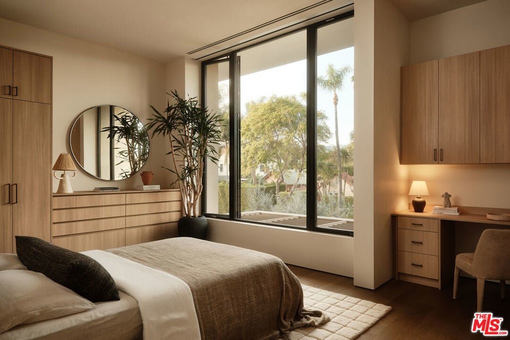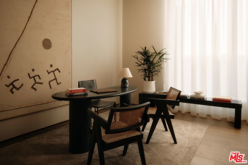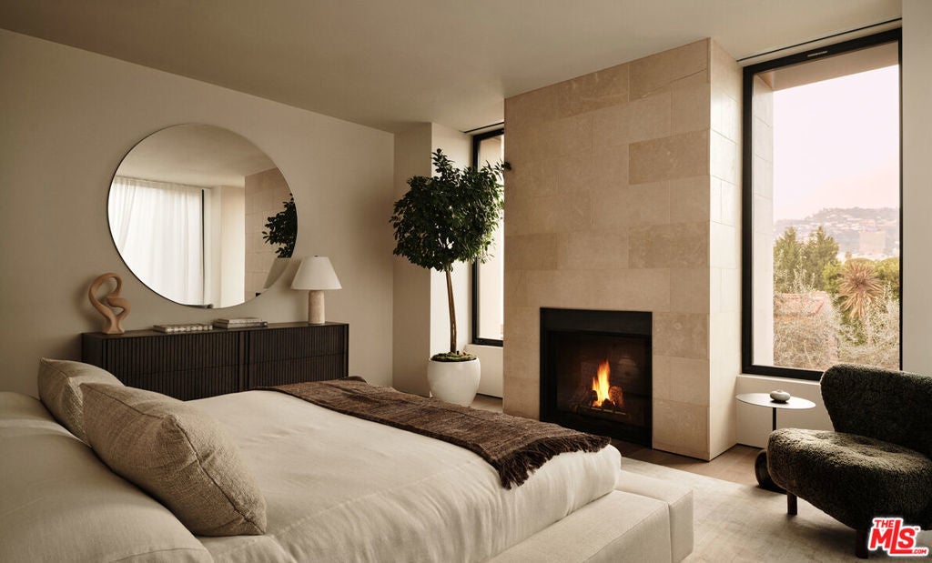 Stone House by Olson Kundig at 8899 Beverly is a singular architectural residence offering a rare combination of privacy, scale, and full-service luxury in the heart of West Hollywood. One of only eight signature homes within this acclaimed development, and the largest of the collection, Stone House is the only one of its kind. The four-bedroom, four-and-a-half-bath home spans over 3,600 square feet and is defined by a refined interplay of light champagne steel and substantial limestone that carries from the exterior through a formal sequence of interior spaces.A distinctive axial layout creates a natural flow throughout the home, centered on a dramatic double-height entry and living space. A sculptural, double-sided fireplace anchors the central living area, opening to both the front garden and the interior. A bespoke custom stair with exposed structural steel is paired with a glass guard, leading to an interior steel bridge above the central living area. Fleetwood operable sliding doors extend the living spaces and kitchen to a private backyard retreat with a plunge pool and spa. Interior finishes are warm and cohesive, with wood flooring throughout and plain-sawn oak cabinetry carried consistently across the home. The kitchen is fully integrated with custom-paneled cabinetry and a premium suite of Gaggenau and Miele appliances. The primary bedroom is a true sanctuary, featuring a fireplace, dual walk-in closets, and a spa-like bathroom finished in Crema Ella marble with a freestanding soaking tub. All four bedrooms feature custom closets and built-ins. As part of the Olson Kundigdesigned 8899 Beverly development, homeowners enjoy access to 24-hour concierge and property management services, a state-of-the-art fitness center, and a landscaped amenity deck with resort-style pool and spa and a custom outdoor kitchen. One of only four remaining homes in the development, Stone House offers a rare opportunity to own a fully private, architecturally significant residence with the services and amenities of a world-class enclave.