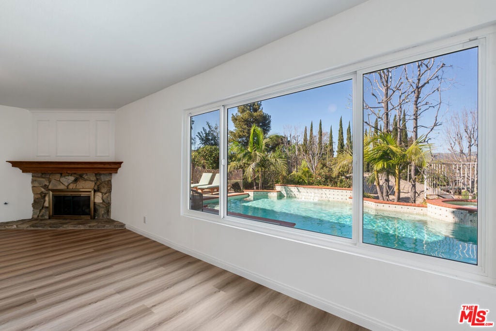 Located on a quiet cul-de-sac in desirable West Simi Valley, this expansive pool home offers space, versatility, and scenic hillside views. Spanning approximately 4,073 sq ft, the residence features 5 bedrooms plus an office and 6 bathrooms, including a convenient main-level bedroom with full bath, ideal for guests, multigenerational living, or a private workspace. Designed for both everyday living and entertaining, the home offers multiple gathering spaces including a formal living room, dining room, and a spacious family room. Fireplaces in the living room, dining room, and primary bedroom add warmth and character throughout. The kitchen is well-appointed with granite countertops, stainless steel appliances, dual ovens, a cooktop, solid maple cabinetry, and a charming breakfast nook.Upstairs, the expansive primary suite serves as a private retreat featuring its own fireplace, walk-in closet, spacious bath with separate tub and shower, and beautiful views from the bedroom. The backyard is designed for true Southern California indoor-outdoor living with a private pool and spa, outdoor fire pit, and a covered outdoor bar and entertaining area complete with ample seating and TV, perfect for hosting gatherings or relaxing evenings. Mature fruit trees including oranges, blood oranges, grapefruit, and kumquat provide a tasty seasonal harvest. Additional highlights include rare RV access with a built-in RV dump, a wet bar, laundry room with chute, attached garage, and a generous lot in one of West Simi Valley's most established neighborhoods.