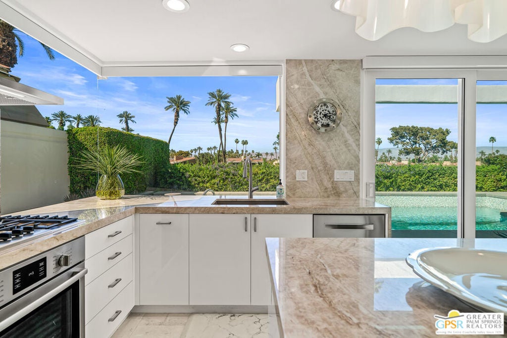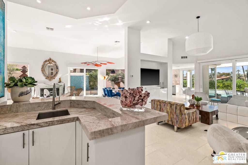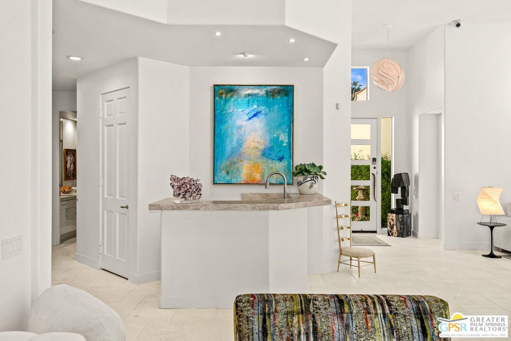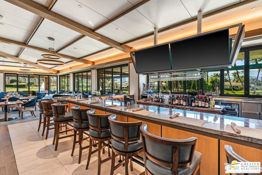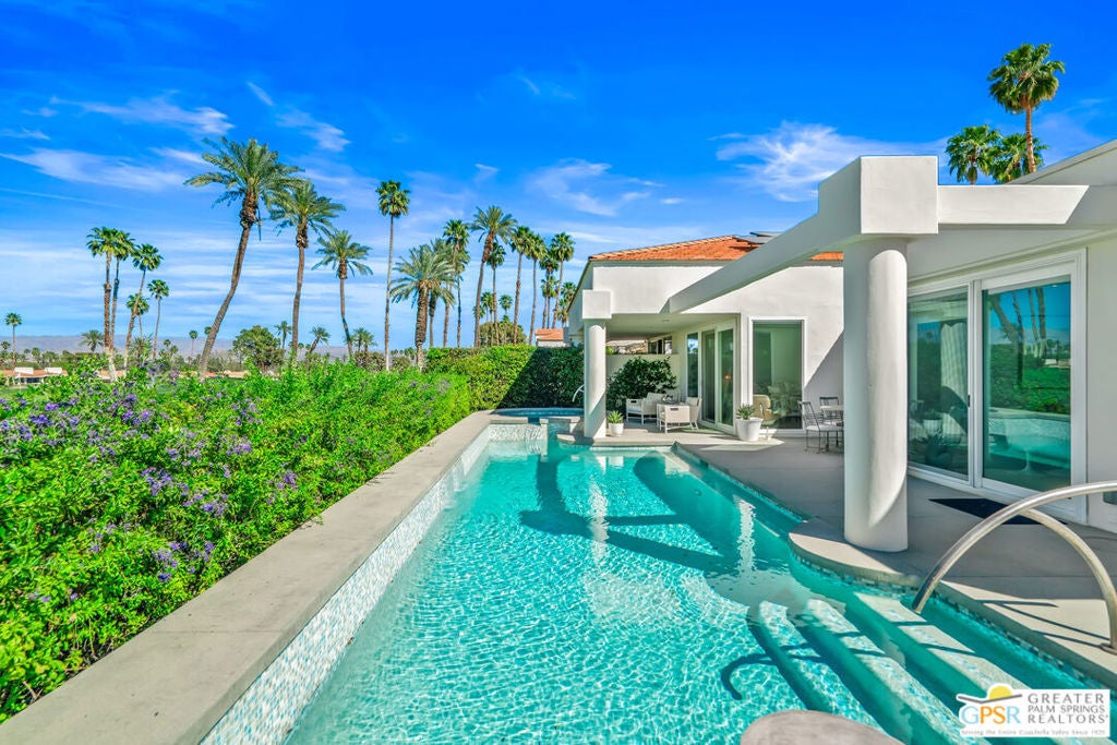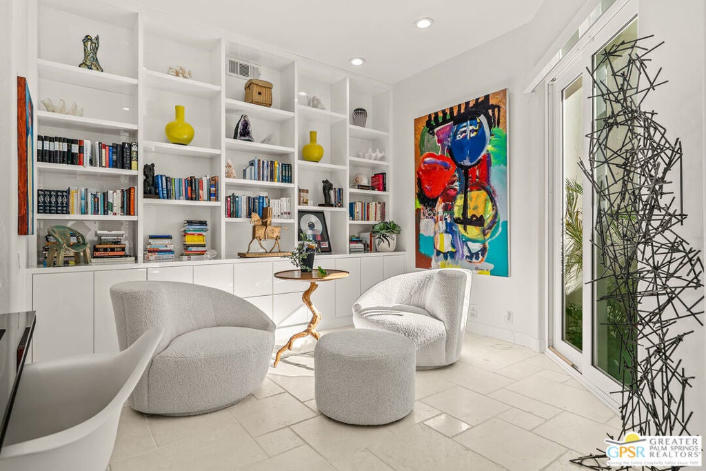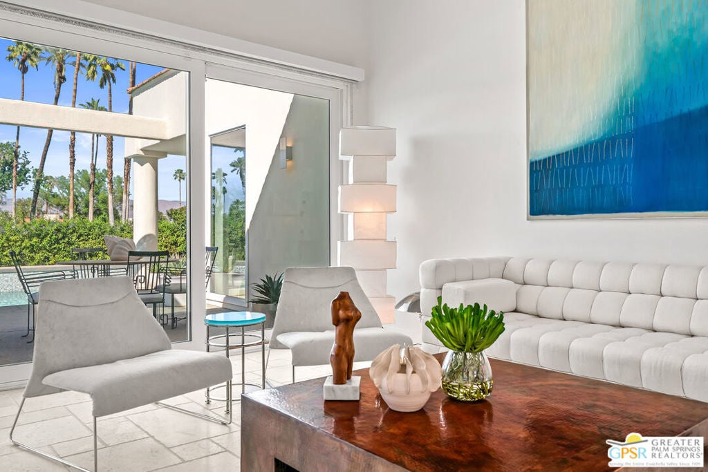 Effortless desert living starts here! Located in Desert Horizons Country Club in Indian Wells, this beautifully updated 2,568 sq. ft. home offers a light, easy lifestyle with refined style throughout. The three-bedroom, three-bath layout (with the third bedroom used as a library) features soaring ceilings and expansive NEW windows and doors that fill the home with soft natural light. Open living spaces create a seamless flow that's both inviting and functional. Recent UPGRADES include new limestone flooring, marble fireplace, motorized shades, WiFi thermostats, AC in the garage, modern built-ins and custom outdoor gates. Owned solar (28 panels with Net 2 metering) adds efficiency and peace of mind. The private backyard is designed for relaxation, with a remodeled pool and spa, custom concrete hardscape, lush desert landscaping, and a tranquil mosaic tiled fountain perfect for quiet mornings or evening gatherings. Residents of Desert Horizons Country Club enjoy the very best of country club living, including a newly renovated clubhouse, state-of-the-art fitness center, and an impressive courts complex. This remarkable property offers many additional upgraded features and must truly be experienced in person to appreciate its beauty, tranquility, and sophisticated design. Come see this exceptional desert home for yourself!