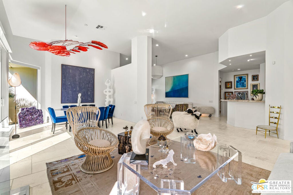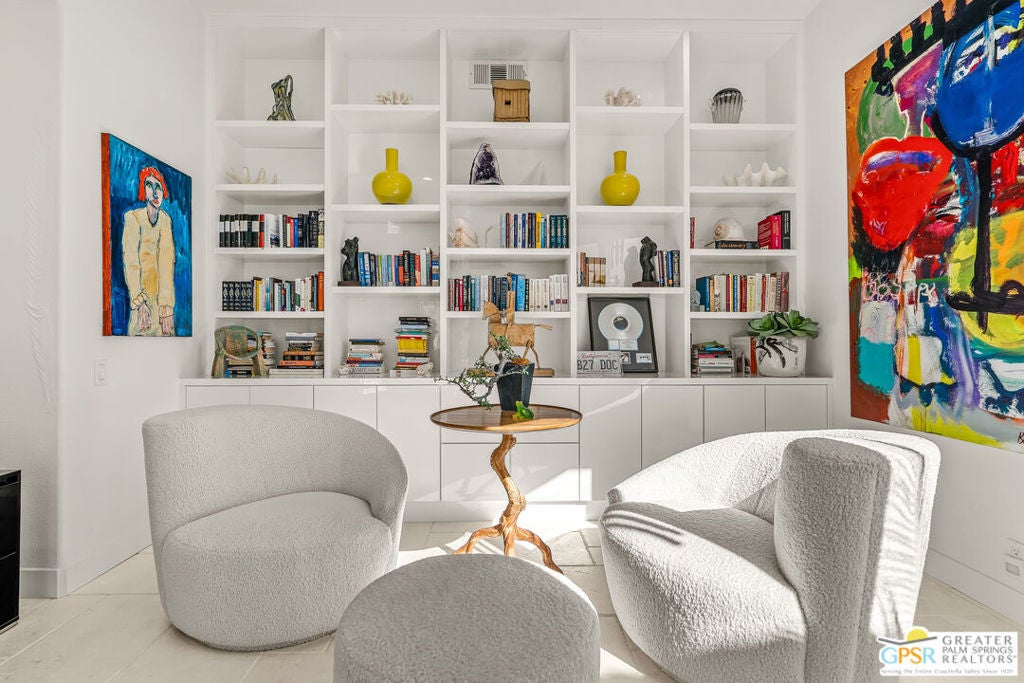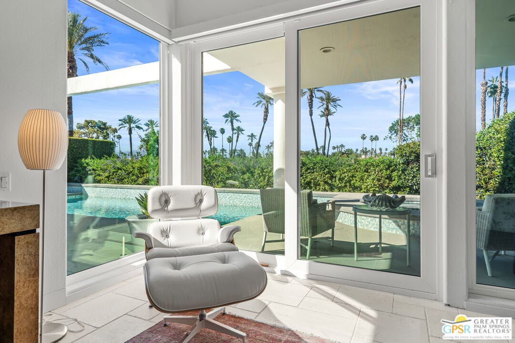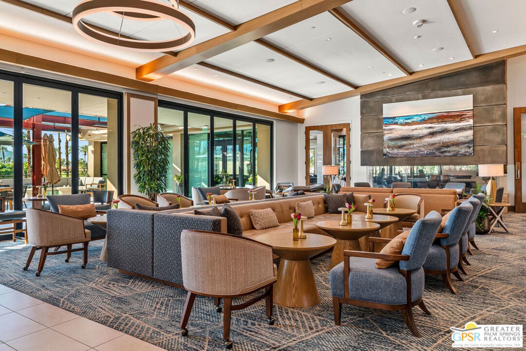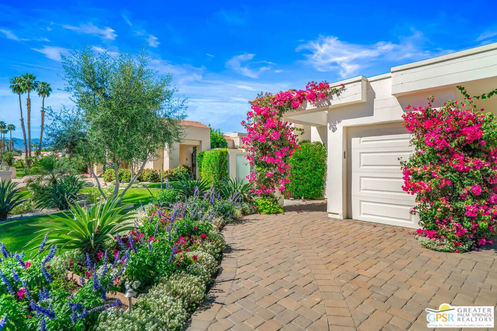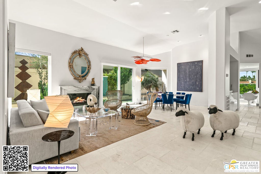 Effortless desert living starts here! Located in Desert Horizons Country Club in Indian Wells, this beautifully updated 2,568 sq. ft. home offers a light, easy lifestyle with refined style throughout. The three-bedroom, three-bath layout (with the third bedroom used as a library) features soaring ceilings and expansive NEW windows and doors that fill the home with soft natural light. Open living spaces create a seamless flow that's both inviting and functional. Recent UPGRADES include new limestone flooring, marble fireplace, motorized shades, WiFi thermostats, AC in the garage, modern built-ins and custom outdoor gates. Owned solar (28 panels with Net 2 metering) adds efficiency and peace of mind. The private backyard is designed for relaxation, with a remodeled pool and spa, custom concrete hardscape, lush desert landscaping, and a tranquil mosaic tiled fountain perfect for quiet mornings or evening gatherings. Residents of Desert Horizons Country Club enjoy the very best of country club living, including a newly renovated clubhouse, state-of-the-art fitness center, and an impressive courts complex. This remarkable property offers many additional upgraded features and must truly be experienced in person to appreciate its beauty, tranquility, and sophisticated design. Come see this exceptional desert home for yourself!