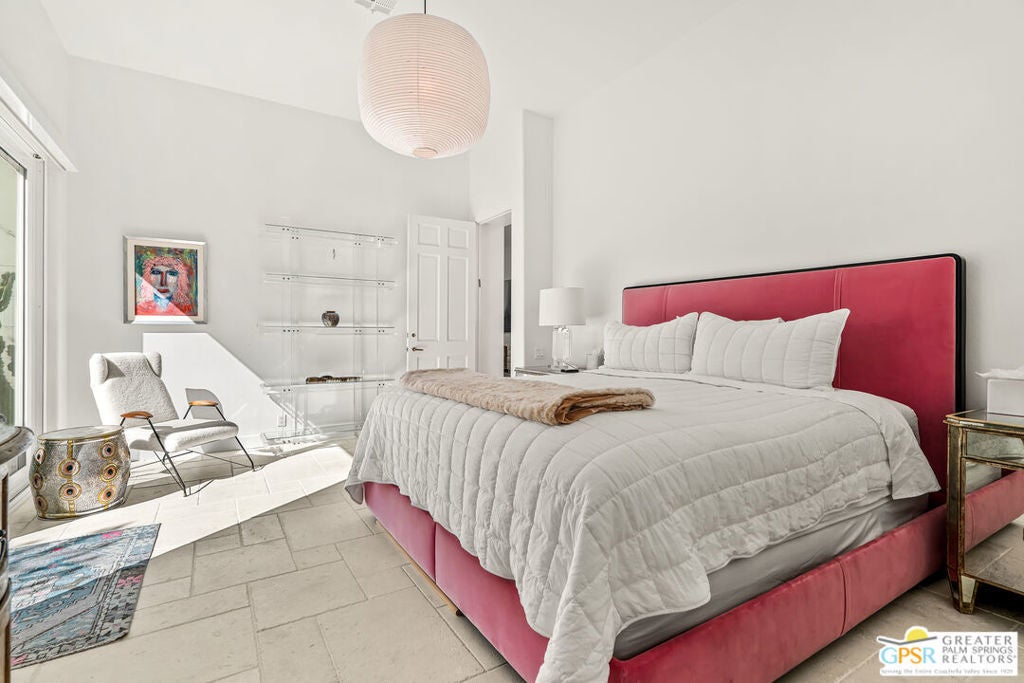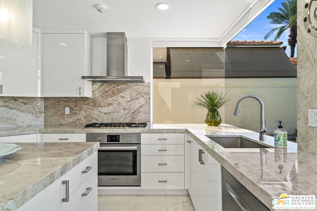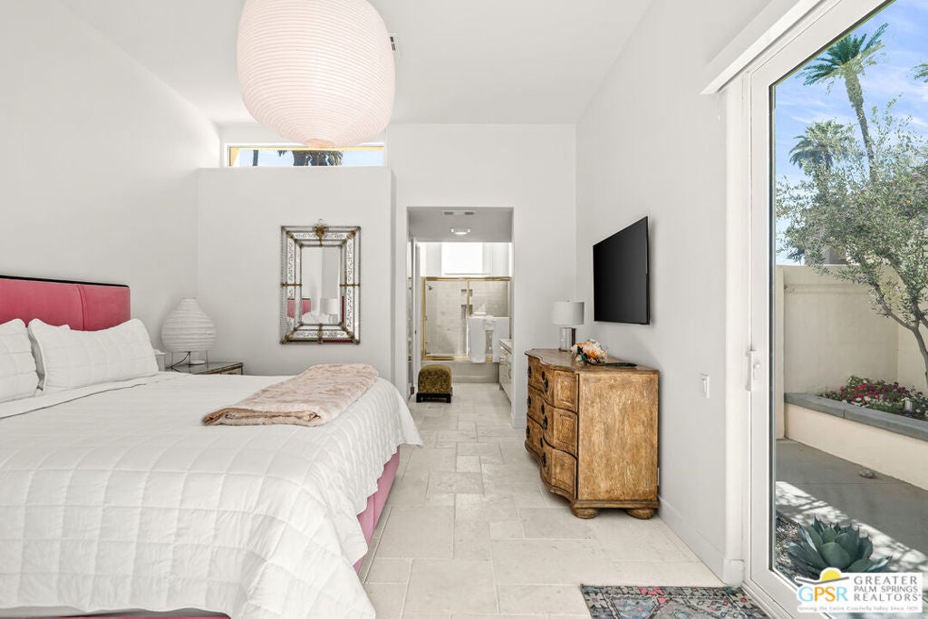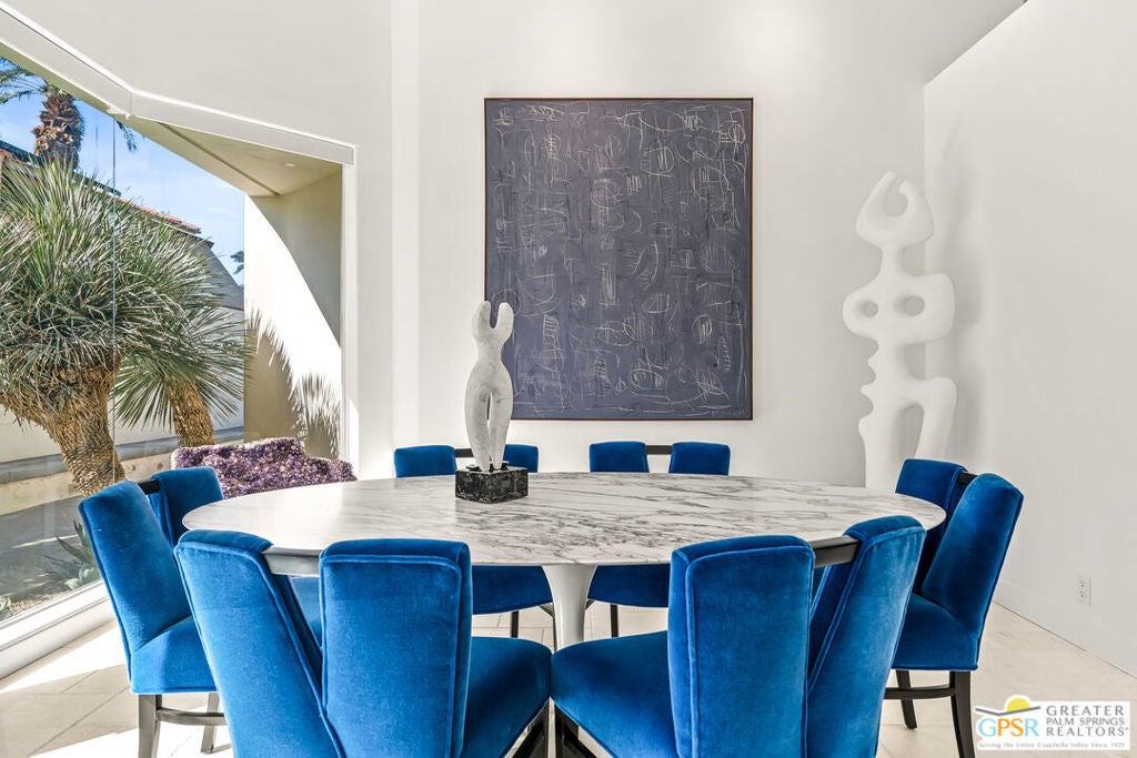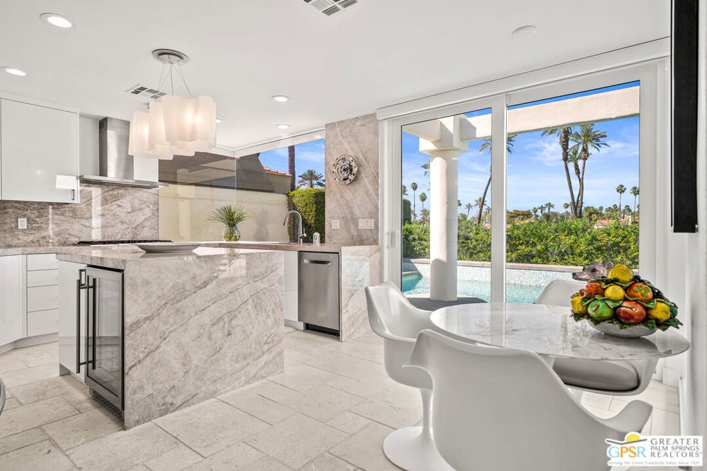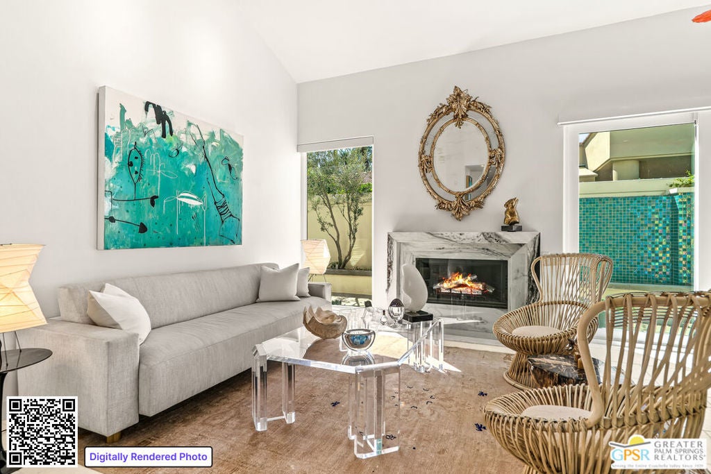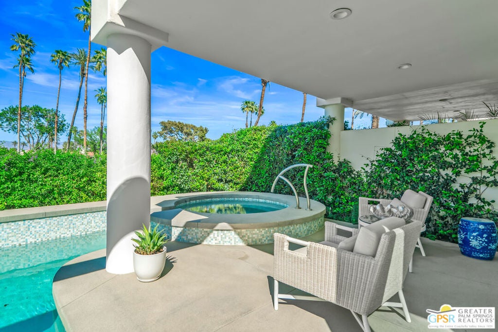 Effortless desert living starts here! Located in Desert Horizons Country Club in Indian Wells, this beautifully updated 2,568 sq. ft. home offers a light, easy lifestyle with refined style throughout. The three-bedroom, three-bath layout (with the third bedroom used as a library) features soaring ceilings and expansive NEW windows and doors that fill the home with soft natural light. Open living spaces create a seamless flow that's both inviting and functional. Recent UPGRADES include new limestone flooring, marble fireplace, motorized shades, WiFi thermostats, AC in the garage, modern built-ins and custom outdoor gates. Owned solar (28 panels with Net 2 metering) adds efficiency and peace of mind. The private backyard is designed for relaxation, with a remodeled pool and spa, custom concrete hardscape, lush desert landscaping, and a tranquil mosaic tiled fountain perfect for quiet mornings or evening gatherings. Residents of Desert Horizons Country Club enjoy the very best of country club living, including a newly renovated clubhouse, state-of-the-art fitness center, and an impressive courts complex. This remarkable property offers many additional upgraded features and must truly be experienced in person to appreciate its beauty, tranquility, and sophisticated design. Come see this exceptional desert home for yourself!