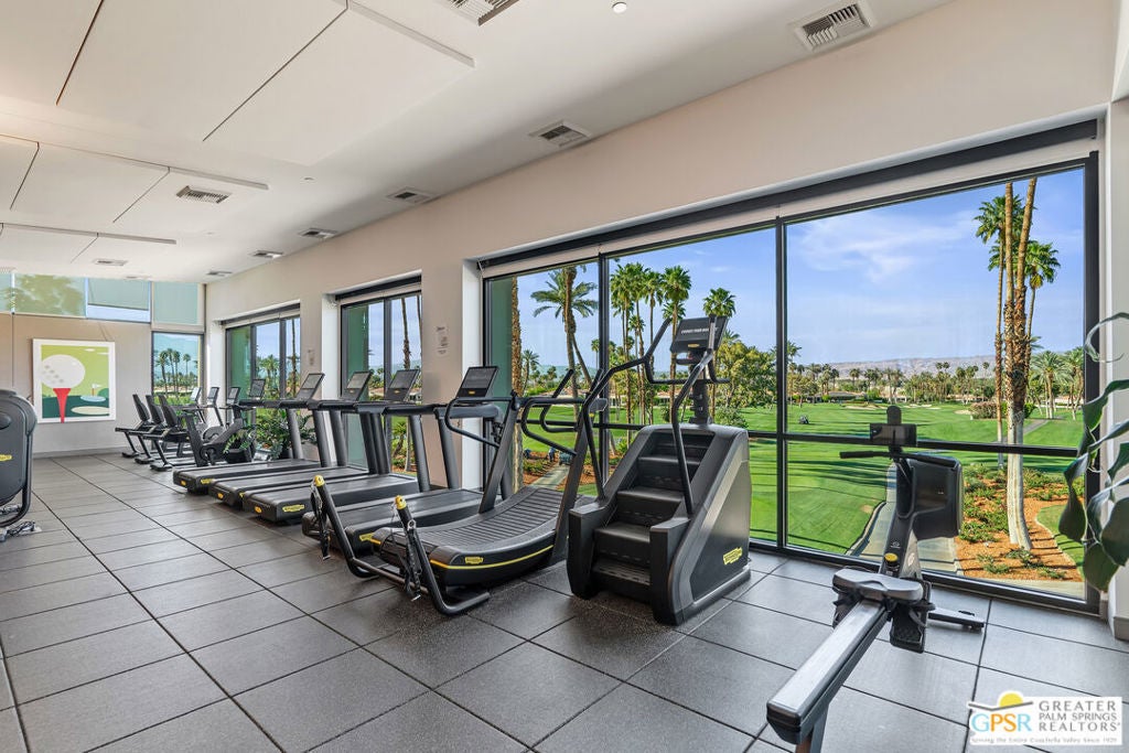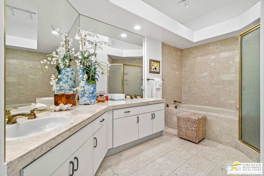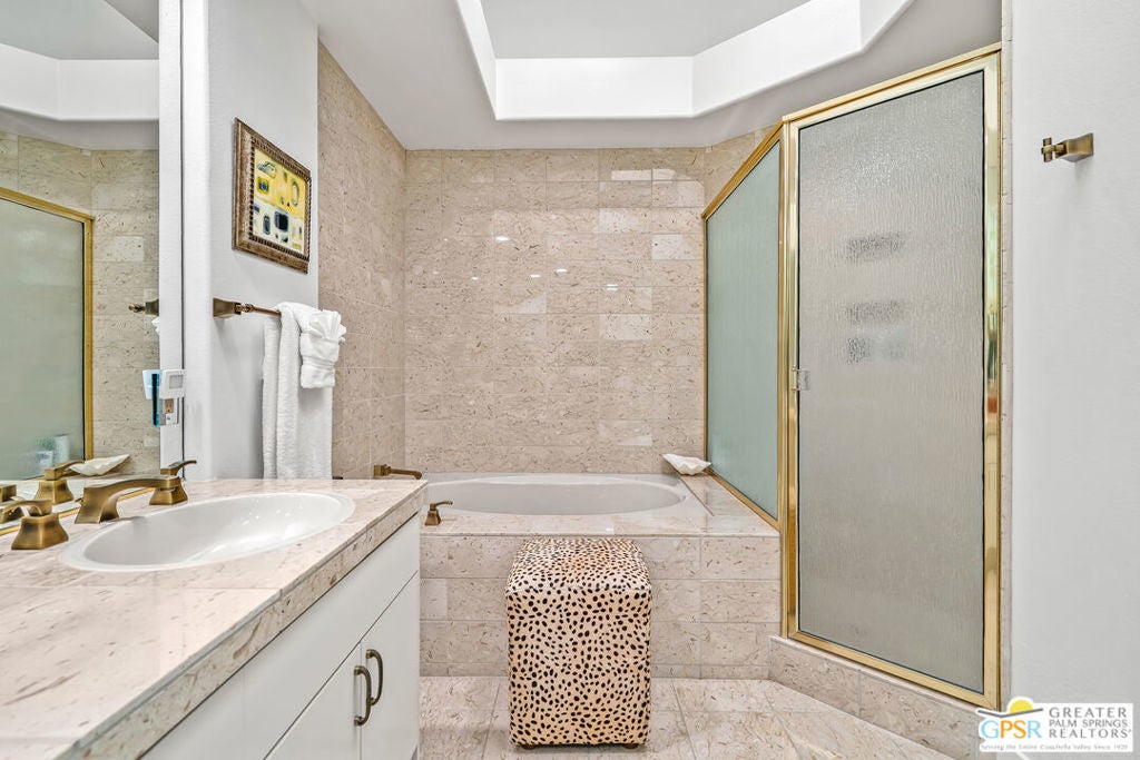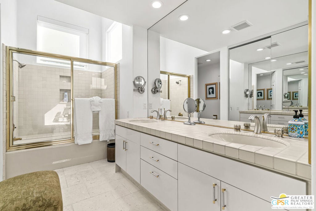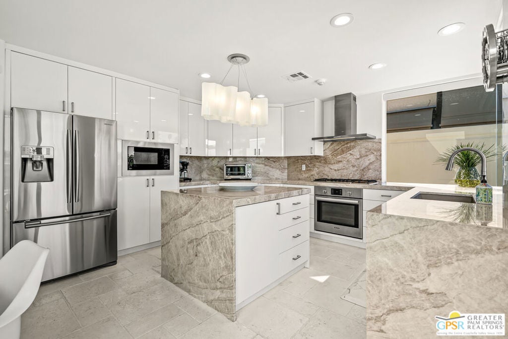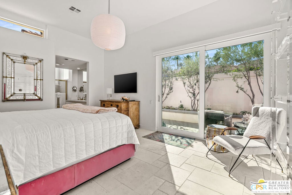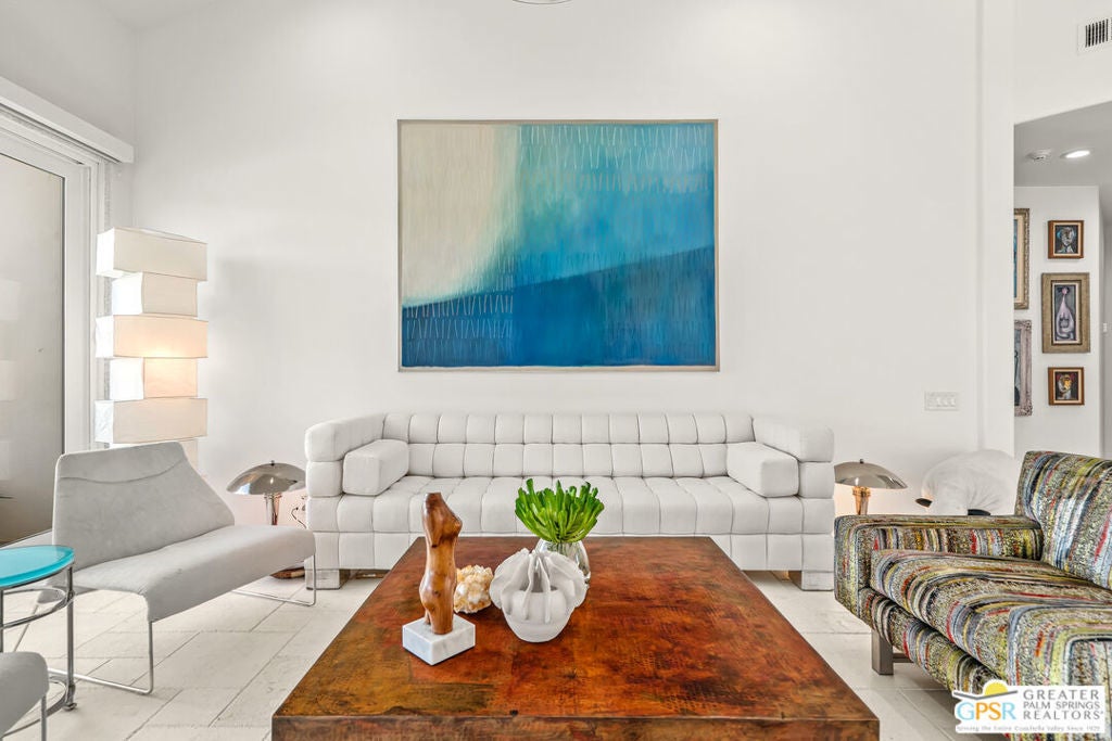 Effortless desert living starts here! Located in Desert Horizons Country Club in Indian Wells, this beautifully updated 2,568 sq. ft. home offers a light, easy lifestyle with refined style throughout. The three-bedroom, three-bath layout (with the third bedroom used as a library) features soaring ceilings and expansive NEW windows and doors that fill the home with soft natural light. Open living spaces create a seamless flow that's both inviting and functional. Recent UPGRADES include new limestone flooring, marble fireplace, motorized shades, WiFi thermostats, AC in the garage, modern built-ins and custom outdoor gates. Owned solar (28 panels with Net 2 metering) adds efficiency and peace of mind. The private backyard is designed for relaxation, with a remodeled pool and spa, custom concrete hardscape, lush desert landscaping, and a tranquil mosaic tiled fountain perfect for quiet mornings or evening gatherings. Residents of Desert Horizons Country Club enjoy the very best of country club living, including a newly renovated clubhouse, state-of-the-art fitness center, and an impressive courts complex. This remarkable property offers many additional upgraded features and must truly be experienced in person to appreciate its beauty, tranquility, and sophisticated design. Come see this exceptional desert home for yourself!