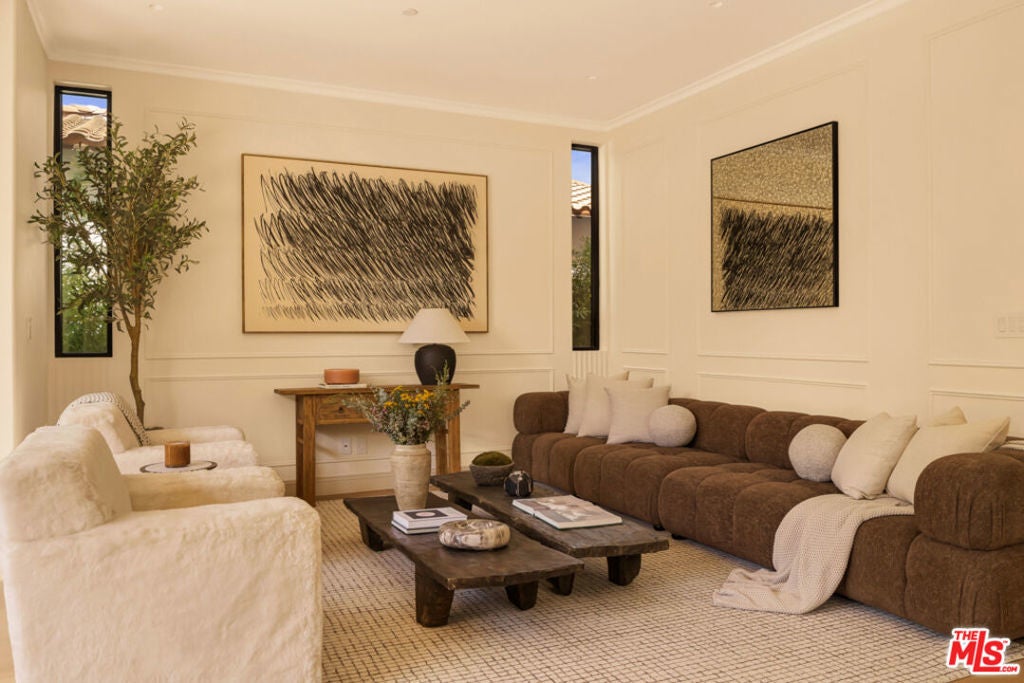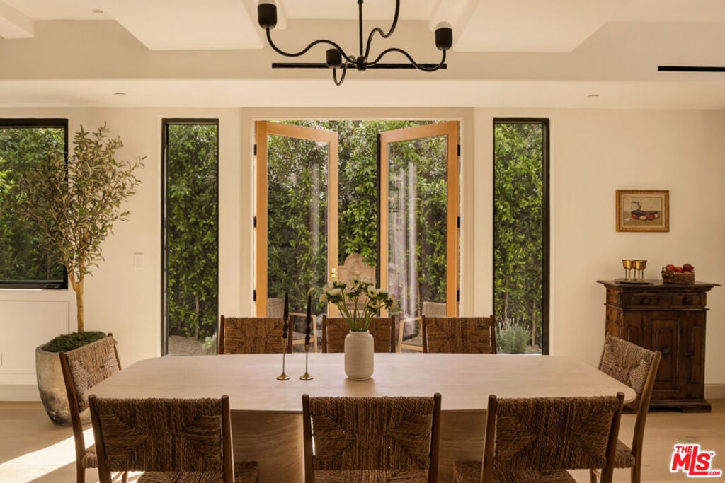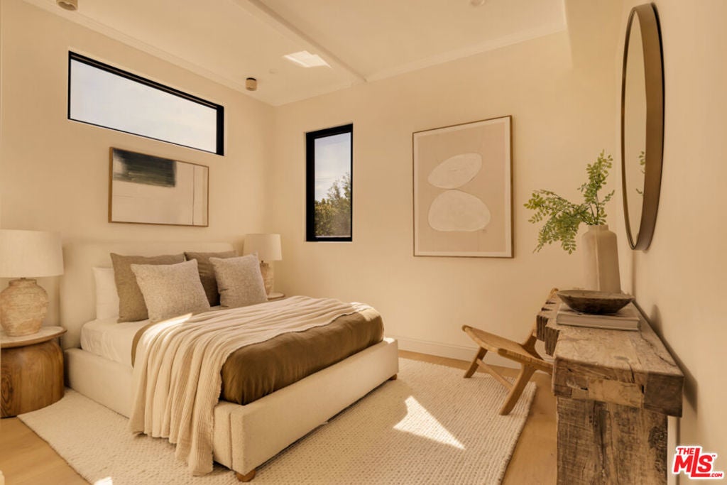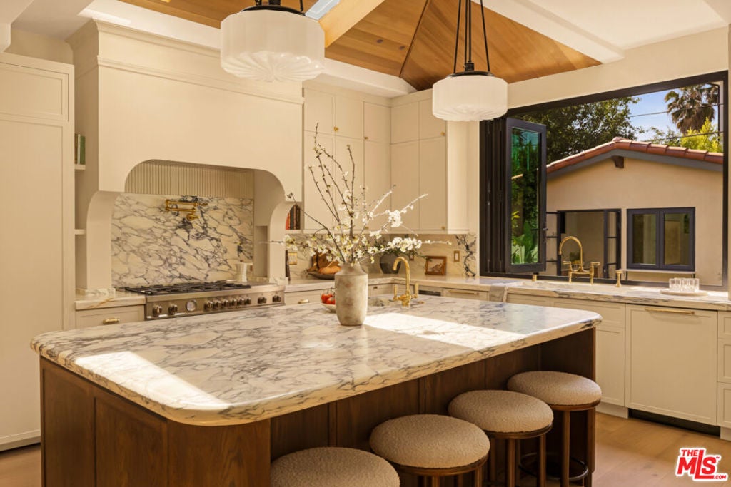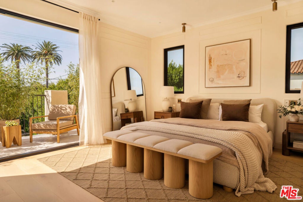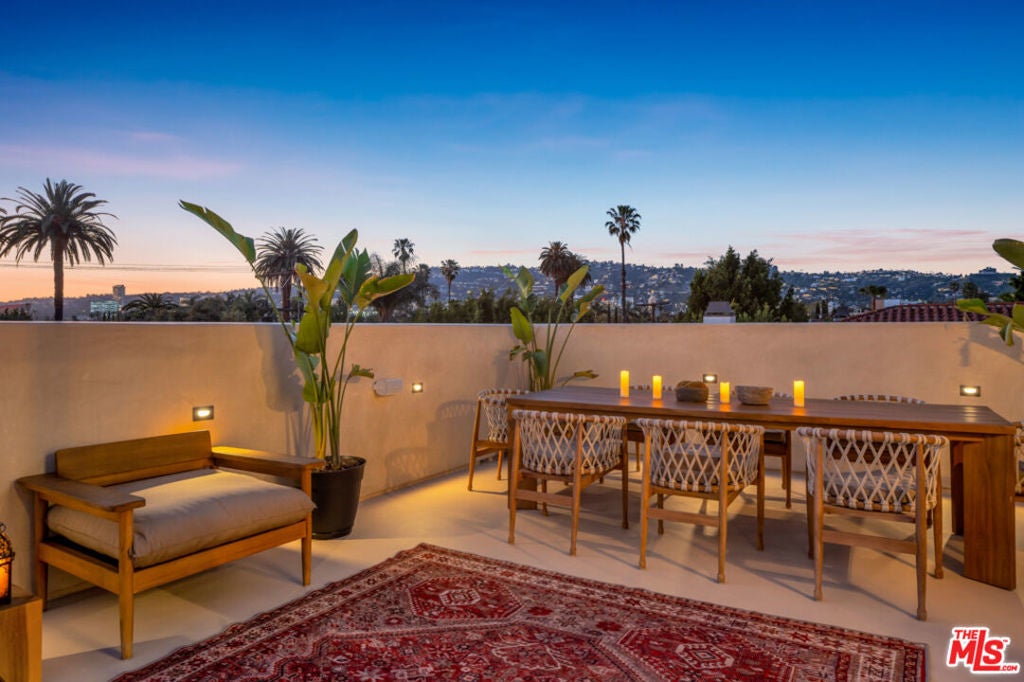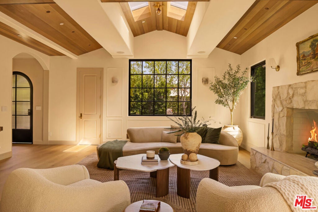This Spanish-inspired residence blends timeless architecture with warmth and privacy, offering the perfect home to unwind and escape the city or host with presence and style. Upon entering, vaulted cedar ceilings immediately set the tone, filling the home with architectural character and natural warmth. Sunlight moves effortlessly throughout, creating an elegant living space designed as both an architectural showpiece and a peaceful place to call home. While open and expansive, the home is thoughtfully designed with intimate pockets for moments of retreat. Expansive pocket doors open to a serene courtyard, creating seamless indoor-outdoor flow into the backyard, where a grassy lawn and lush landscaping around the pool create a transformative setting that transports you to a place of peace while remaining in the heart of the city. The pool house doubles as a private theater with a screen that descends from the ceiling, effortlessly transforming the space into a cinematic retreat or entertaining room. Above it all, a 1,200sqft rooftop deck captures breathtaking sunsets framed by palm trees, distant mountains, and panoramic 360-degree views of the city. A rare balance of architectural integrity, tranquility, and soul, this home offers a living experience that feels both grounding and extraordinary.