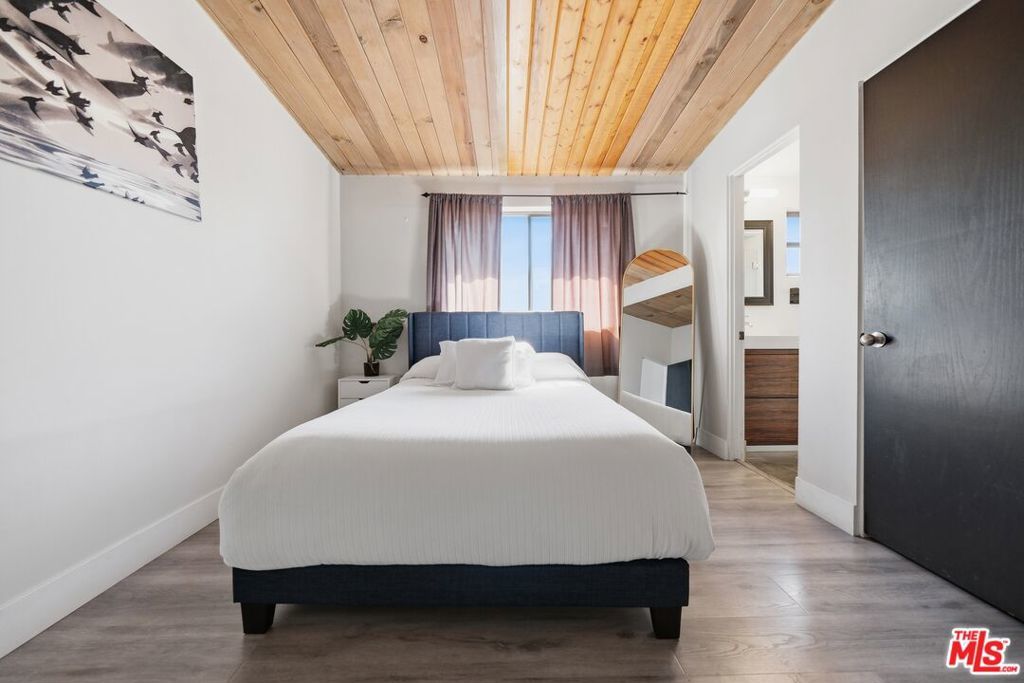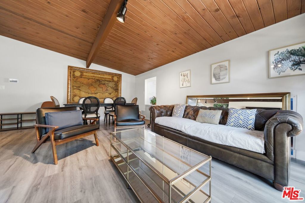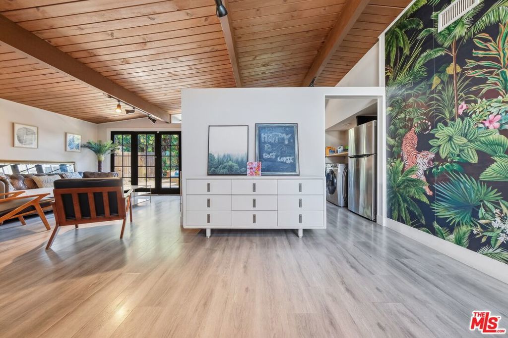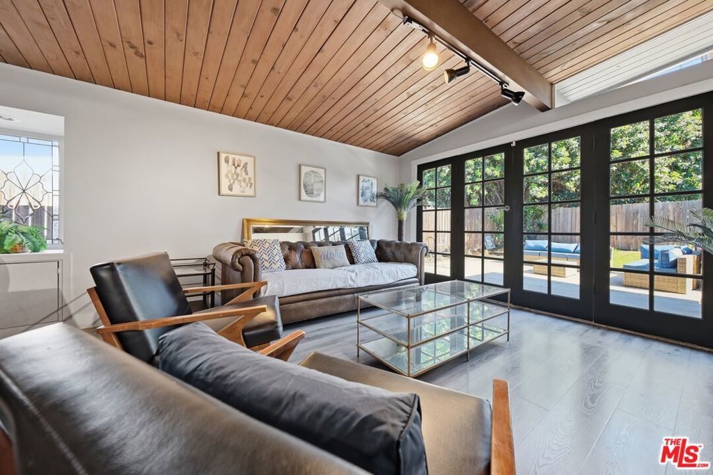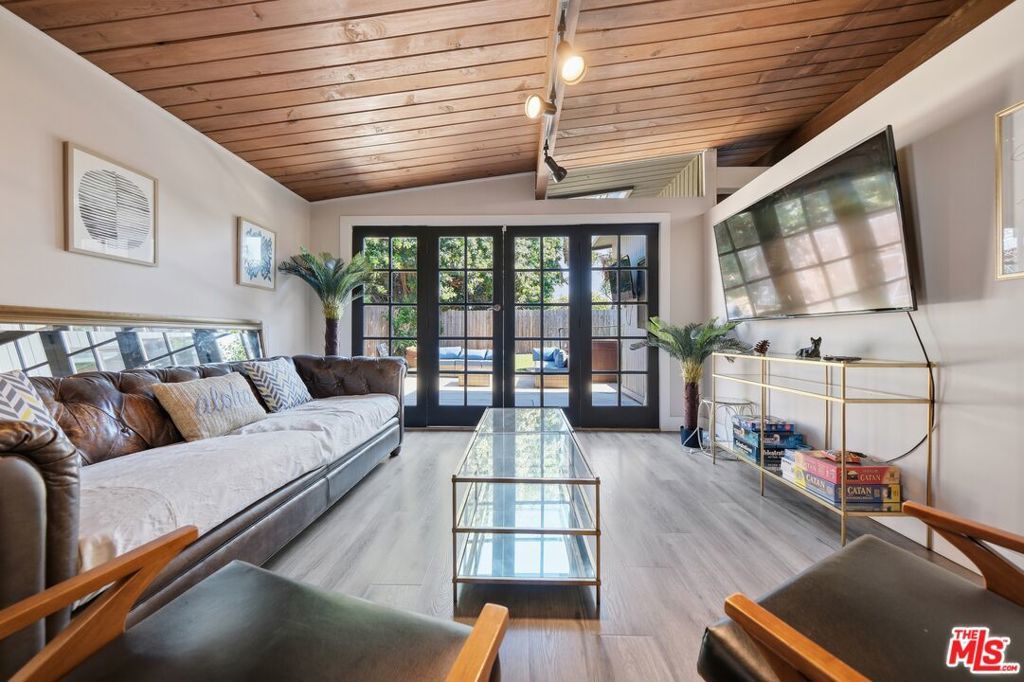 Escape to this sleek, mid-century modern sanctuary tucked away on a quiet cul-de-sac. A path of steppingstones leads you through a calming courtyard, the perfect spot for your morning coffee, to a dramatic red front door. Inside, the home opens into an expansive entry with soaring ceilings and a seamless floor plan. Stunning wood-plank ceilings flow throughout, infusing the massive living and dining rooms with organic warmth. Dramatic french doors invite you to the backyard oasis, featuring a large patio, lush lawn and spa. The spacious kitchen has plenty of cabinets, lots of counter space, a refrigerator, gas cooktop, oven, dishwasher and full-size washer and dryer. With four bedrooms and two baths, this home offers incredible flexibility for a growing family or a dedicated home office. Move-in ready and waiting for its next chapter!
