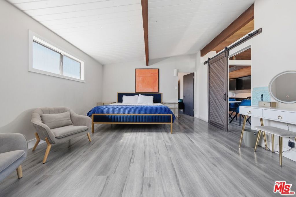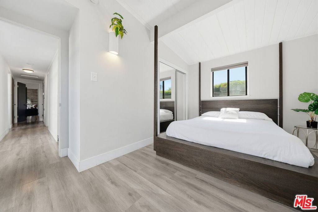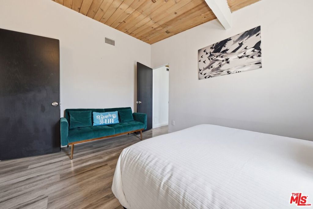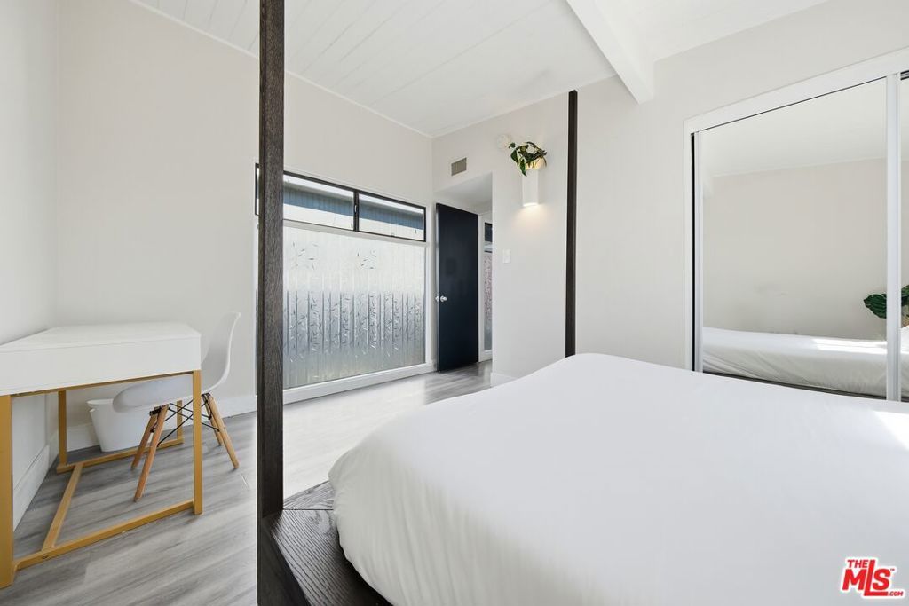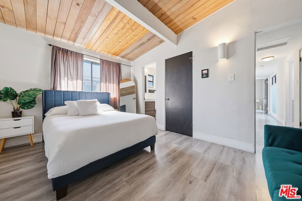 Escape to this sleek, mid-century modern sanctuary tucked away on a quiet cul-de-sac. A path of steppingstones leads you through a calming courtyard, the perfect spot for your morning coffee, to a dramatic red front door. Inside, the home opens into an expansive entry with soaring ceilings and a seamless floor plan. Stunning wood-plank ceilings flow throughout, infusing the massive living and dining rooms with organic warmth. Dramatic french doors invite you to the backyard oasis, featuring a large patio, lush lawn and spa. The spacious kitchen has plenty of cabinets, lots of counter space, a refrigerator, gas cooktop, oven, dishwasher and full-size washer and dryer. With four bedrooms and two baths, this home offers incredible flexibility for a growing family or a dedicated home office. Move-in ready and waiting for its next chapter!
