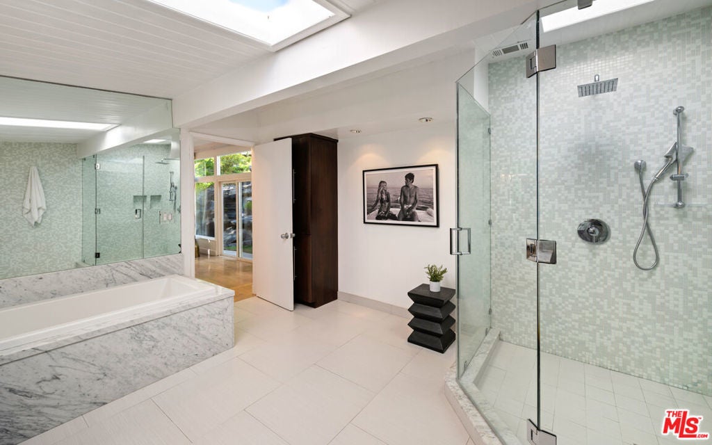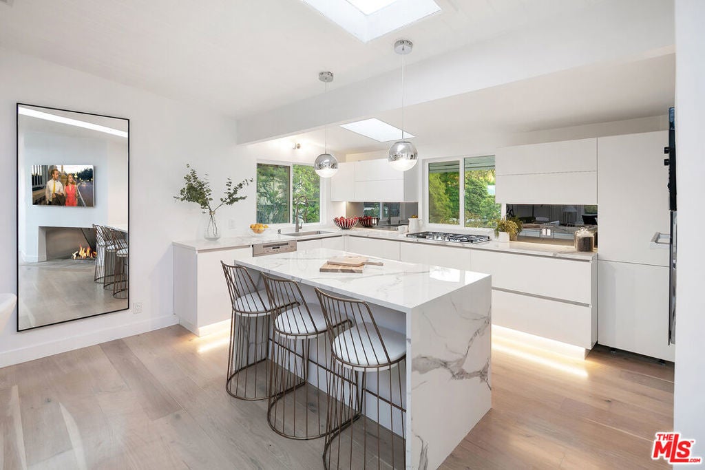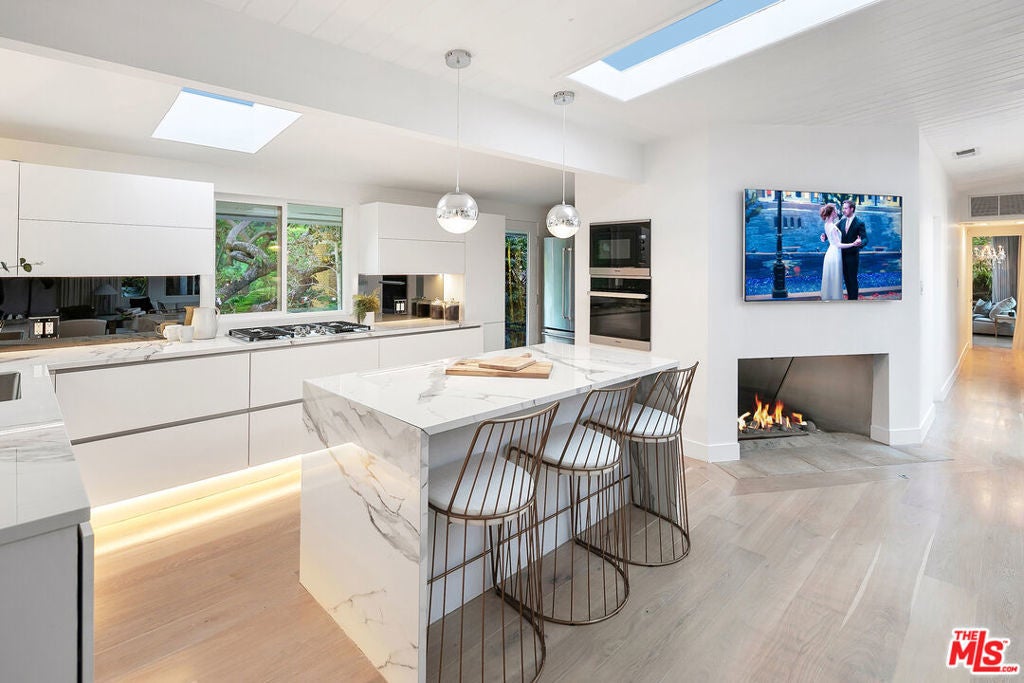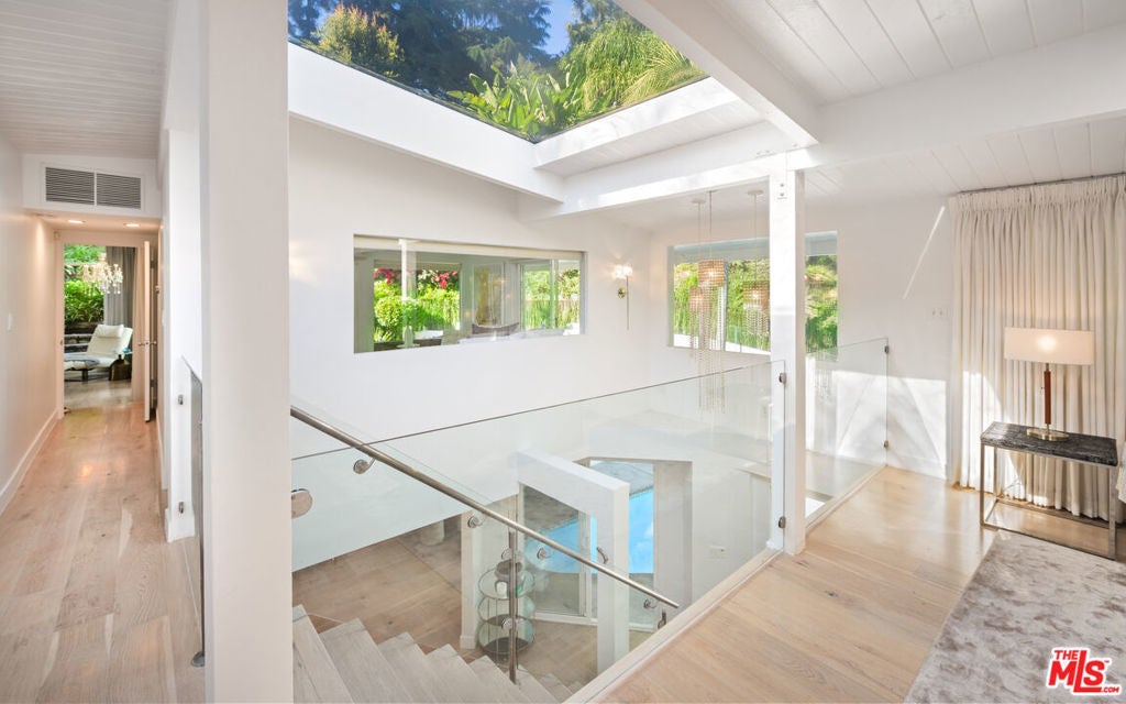 Perfectly positioned on a quiet cul-de-sac just moments behind the iconic Beverly Hills Hotel and minutes from Sunset Boulevard, this exceptional contemporary oasis offers the ultimate blend of privacy, prestige, and lifestyle. This former residence of several A-list celebrities features a bright open floor plan, seamless indoor-outdoor flow, and walls of glass that frame impressive surroundings. 9 skylights and 3 oversized fireplaces flood the home with natural light and create a vibrant, uplifting ambiance throughout. The sumptuous primary suite with spa-like bath, along with the 2nd bedroom, feature dramatic walls of glass opening to a breathtaking 50-foot waterfall, pond, lush yard, fire pit, and hilltop yoga area with hammock.Downstairs features a private 3rd bedroom with separate gated entrance and garden, perfect for guests, a teenager, office, or live-in. A media den with bar features a striking sunken "conversation pit" around a fireplace, ideal for movie nights or entertaining, opens to a spacious living area that steps right into the private heated pool which glows beautifully from nearly every room at night, creating a magical evening ambiance. Updated kitchen showcases porcelain counters, custom cabinetry, and top-of-the-line Miele appliances, while the spacious living and dining area are set gracefully among the treetops. Exceptionally private and tranquil, with only two homes on the street and ample parking rarely found in the hills, the property is also high-walled and gated for added security.