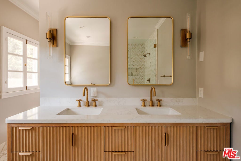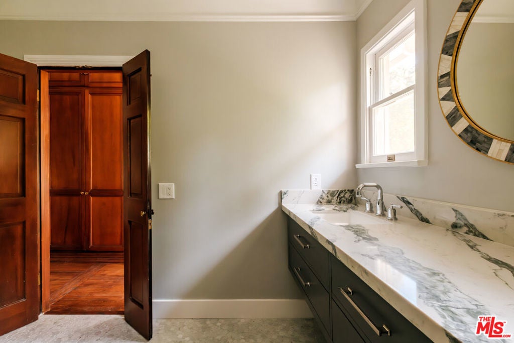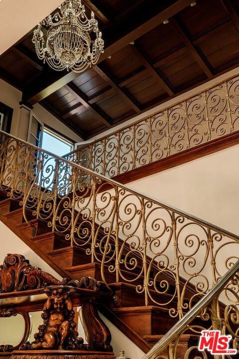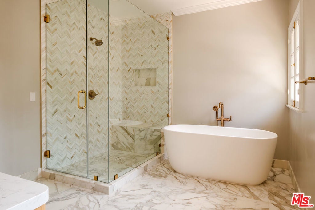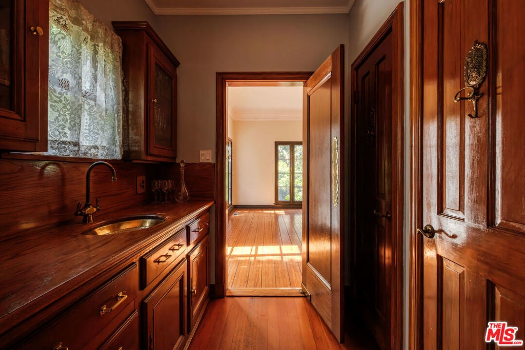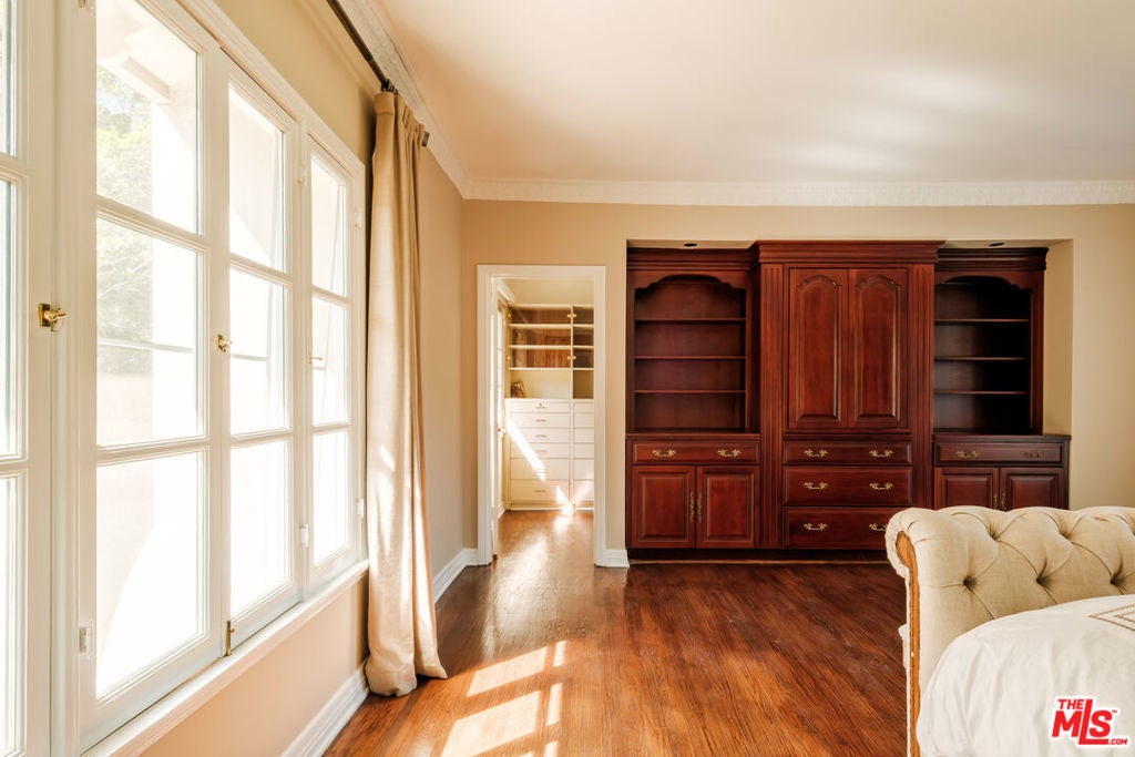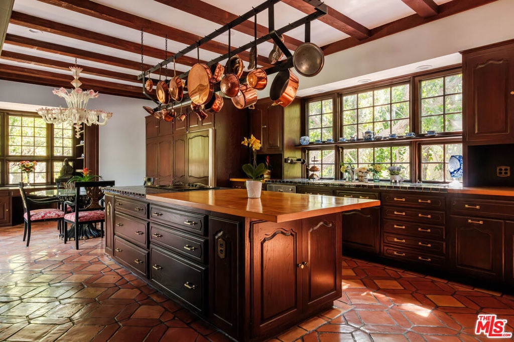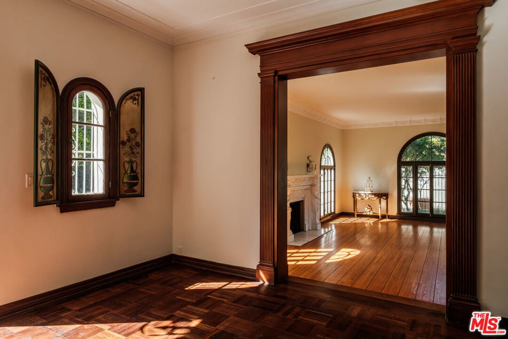 Designed by renowned architect Paul Williams, this stately Spanish Colonial Revival residence reflects the timeless elegance of Beverly Hills' golden architectural era. The 4-bedroom, 3.5-bath main home spans approximately 4,171 square feet on a sprawling 19,107-square-foot lot, offering exceptional scale, privacy, and classic character in a prestigious North of Sunset location, moments from the Beverly Hills Hotel. A symmetrical fade, smooth stucco exterior, and clay tile roof introduce interiors defined by grand proportions and beautifully preserved period details. A formal foyer with parquet flooring opens to gracious living and entertaining spaces highlighted by soaring ceilings, crown moldings, arched windows, and French doors that fill the home with natural light. The formal living room features an ornate carved marble decorative fireplace, while a richly paneled library with built-in shelving and French doors offers a refined retreat. Architectural details throughout include rich hardwood floors, elegant millwork, crystal chandeliers, and decorative wall sconces. The kitchen blends warmth and character with wood-beamed ceilings, custom cabinetry, terracotta-style tile flooring, decorative tile-work, and a generous center island. The beautifully updated primary bath features marble finishes, a freestanding soaking tub, and glass-enclosed shower, thoughtfully blending modern comfort with the home's historic character. French doors open to patios, lawn, and lush gardens surrounding a large pool and spa, creating a backyard setting reminiscent of Tuscany. The grounds are enhanced by numerous citrus trees, mature landscaping, and a wonderful sense of privacy. A pool house with 3/4 bath offers added flexibility, while abundant on-site parking provides rare convenience for residents and guests. A distinctive lease opportunity offering architectural pedigree, timeless craftsmanship, and classic Beverly Hills living.