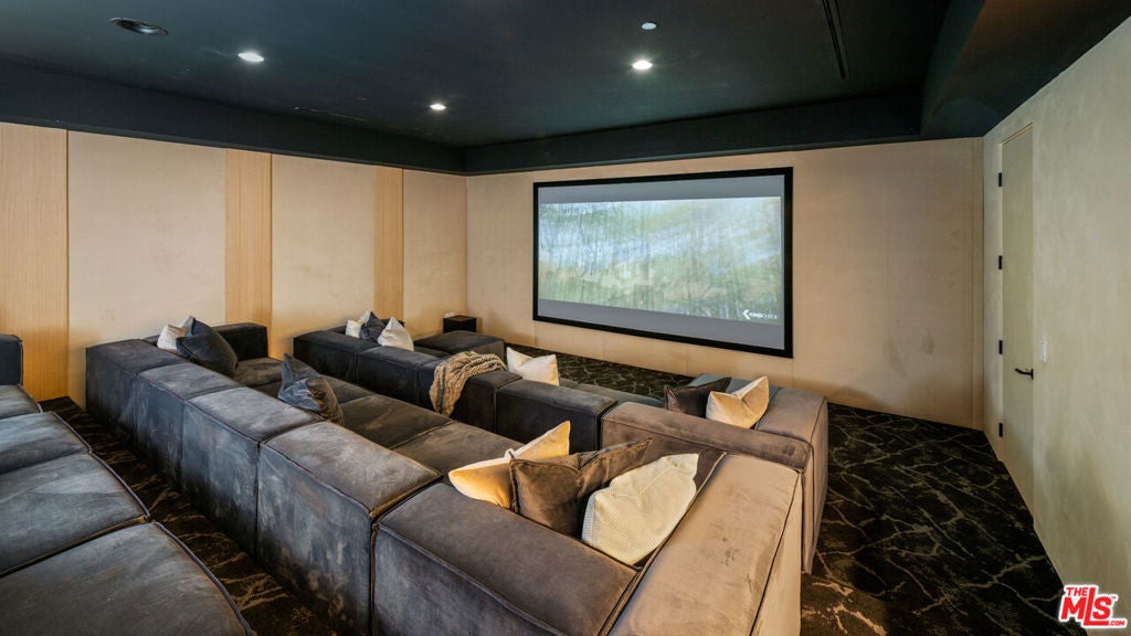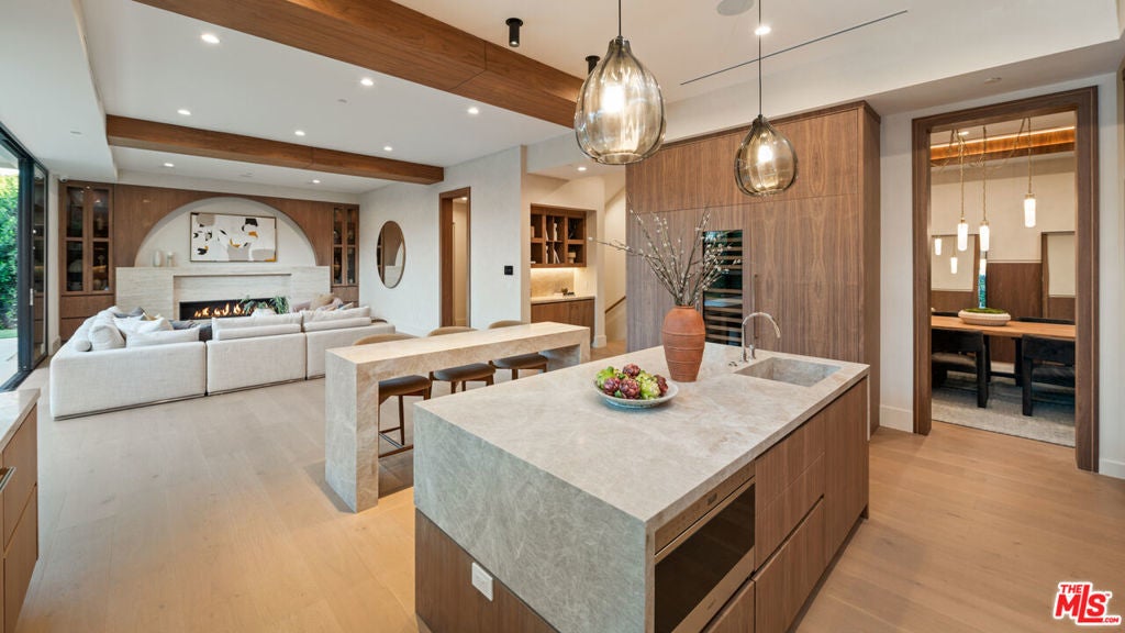 Discover refined coastal living in this newly built architectural estate in the coveted Huntington Palisades. This three-level modern masterpiece offers 7 bedrooms, 9 bathrooms, and over 8,000 sq ft of thoughtfully designed living space, blending timeless materials with cutting-edge convenience. A signature design element is the home's intentional progression of rich walnut and warm oak: bold walnut millwork anchors the main level, while the upper and lower floors transition to softly grained oak, creating a cohesive, elevated aesthetic throughout. Limewash and Roman clay walls, soaring ceilings, and expansive openings set a warm, sophisticated tone from the moment you enter. Custom walnut and white oak cabinetry and paneling, paired with a modern mix of porcelain and glazed ceramic tile, further elevate the home's refined material palette. The custom chef's kitchen is the heart of the home, featuring a Sub-Zero/Wolf gourmet suite of appliances, bespoke cabinetry, an oversized island, and Taj Mahal stone slabs. An extra-large pantry with concealed secondary appliances supports seamless entertaining. The kitchen flows directly into the grand dining area and expansive family room, where a sleek travertine-clad fireplace and oversized sliding doors open to the pool, spa, and outdoor lounge for true indoor/outdoor living. The lower level is designed for entertaining and wellness, showcasing a private movie theater, an Emperador marble clad built-in bar, and a fully equipped gym with steam room. Large sliding doors extend this level to an additional outdoor area, creating a resort-like experience. Plumbing fixtures throughout include selections from Brizo, Watermark, Gessi, Toto, and Mr. Steam, blending function with luxurious craftsmanship. Upstairs, generously scaled bedroom suites provide comfort and privacy, each with curated finishes and luxurious bathrooms. The serene primary retreat offers a spa-like bath and custom wardrobe, completing the sense of everyday escape. Additional amenities include an elevator serving all three levels, a 3-car garage, and smart-home integrations. The grounds are anchored by an extraordinary 150-year-old heritage tree, a rare natural centerpiece that adds history and character to this modern residence. A rare opportunity to own a meticulously crafted new-construction home in one of Pacific Palisades' most desirable neighborhoods, designed for both grand entertaining and effortless everyday living.
