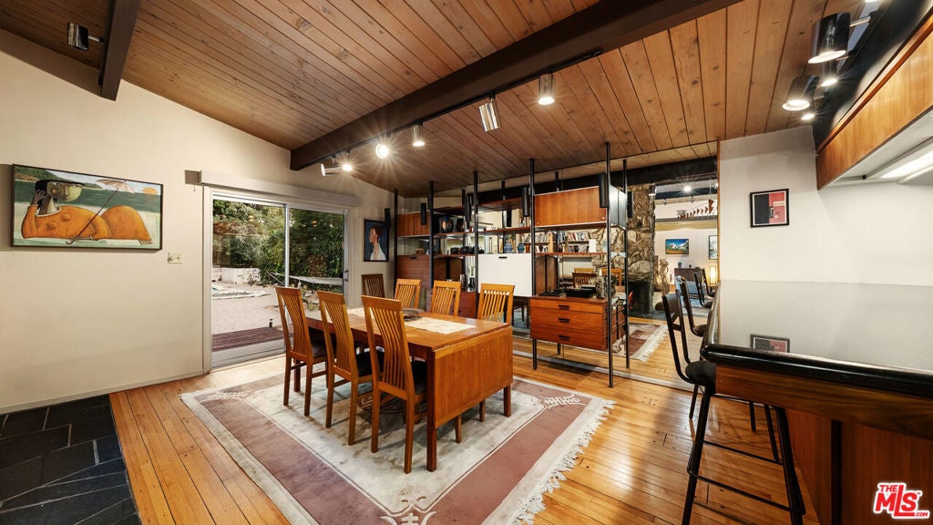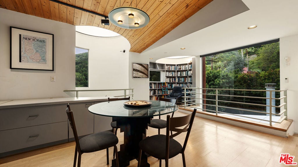 A quintessential Mid-Century Modern retreat, privately sited within the tranquil canyon setting of Brentwood's coveted Upper Mandeville Canyon, this architectural residence, originally built in 1957 and thoughtfully reimagined in collaboration with renowned architect Richard Dodson, A.I.A., embodies the era's ethos of simplicity, functionality, and harmony with nature on an 18,078 square foot lot. A dramatic post-and-beam entry introduces soaring vaulted ceilings, exposed wood structure, a sculptural stone fireplace, and expansive walls of glass, dissolving the boundary between interior and exterior while framing serene canyon vistas. Clean lines, organic materials, and an open, flowing floor plan create a timeless modernist sensibility throughout. The main living spaces unfold effortlessly, anchored by a formal dining area with a fireplace that transitions into a thoughtfully designed kitchen featuring a generous center island, sleek cabinetry, and a sun-drenched breakfast banquette, an inviting nod to classic mid-century design. The adjoining family room, complete with a third fireplace, custom built-ins, and integrated media, is enveloped in natural light and oriented toward the surrounding landscape. The primary suite serves as a private, resort-like sanctuary, with direct access to the pool and gardens and a spa-inspired bath illuminated by skylights, offering dual vanities, a soaking tub, and a frameless glass shower. An adjoining office or multi-use room enhances the suite's functionality, while two additional bedrooms and a full bath complete the main level. Upstairs, a glass-wrapped pavilion floats among the treetops, offering sweeping canyon views and remarkable versatility as an additional bedroom suite, creative studio, or media retreat, complete with an additional upstairs full bathroom. A separate library with skylight and private balcony further embraces the home's connection to light, air, and landscape. Designed for seamless indoor-outdoor living, the grounds feature a solar-heated pool, curated landscaping, and multiple spaces for relaxation and entertaining. Additional amenities include a guest powder room, dedicated laundry, and multi-zone HVAC. A rare offering that captures the spirit of mid-century modern architecture, where form meets function and every space is in dialogue with its natural surroundings, just moments from the best of the Westside.
