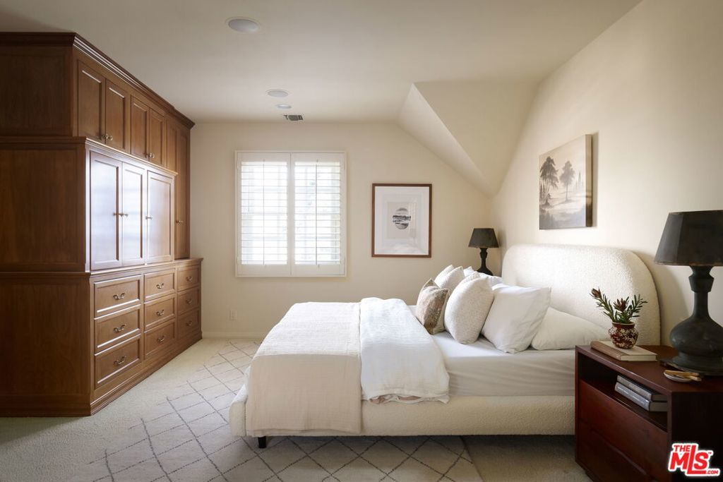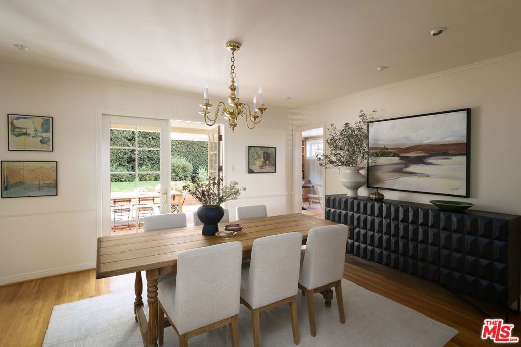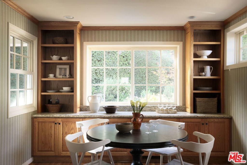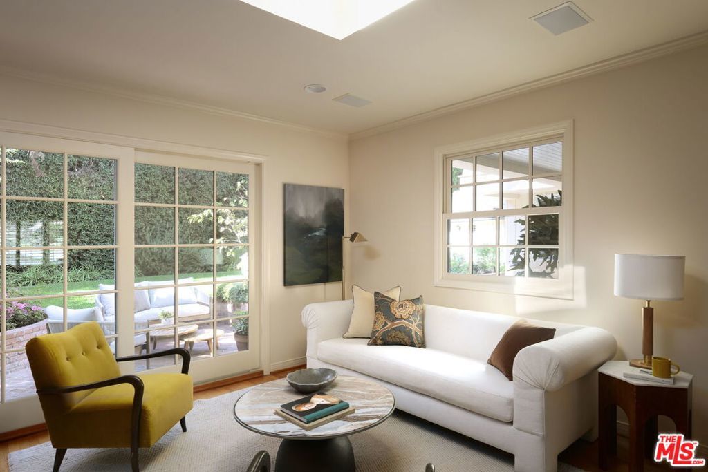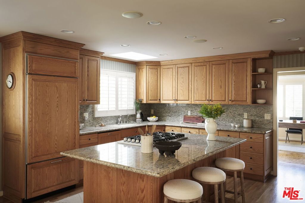 Tucked at the end of a tree-lined cul-de-sac, lies this charming 4BR+3.5BA traditional with a detached guest room/office + 3/4 bathroom, set on over a 9,500 sq. ft lot. Formal entry welcomes you to the large formal living and dining room with hardwood floors, recessed lighting and fireplace. Cozy den with custom built-ins and built-in mini fridge, overlooks the large grassy backyard. Eat-in kitchen with large center island, features granite countertops, Viking cooktop, Sub-Zero Refrigerator and Thermador ovens. Downstairs bedroom can also be a great home office. Upstairs has 3 en-suite bedrooms, including the primary with walk-in closet, seating area and large bathroom with separate tub, shower and two sinks. Laundry closet is also located upstairs with side-by-side, full size washer/dryer. Private grassy backyard with mature hedging and beautiful brick lined seating areas, features a detached guest suite with reading office nook and bathroom. 2-Car garage with built-in storage. Minutes to the heart of Brentwood Village. First time on the market in almost 58 years. Would make a wonderful place to call home!